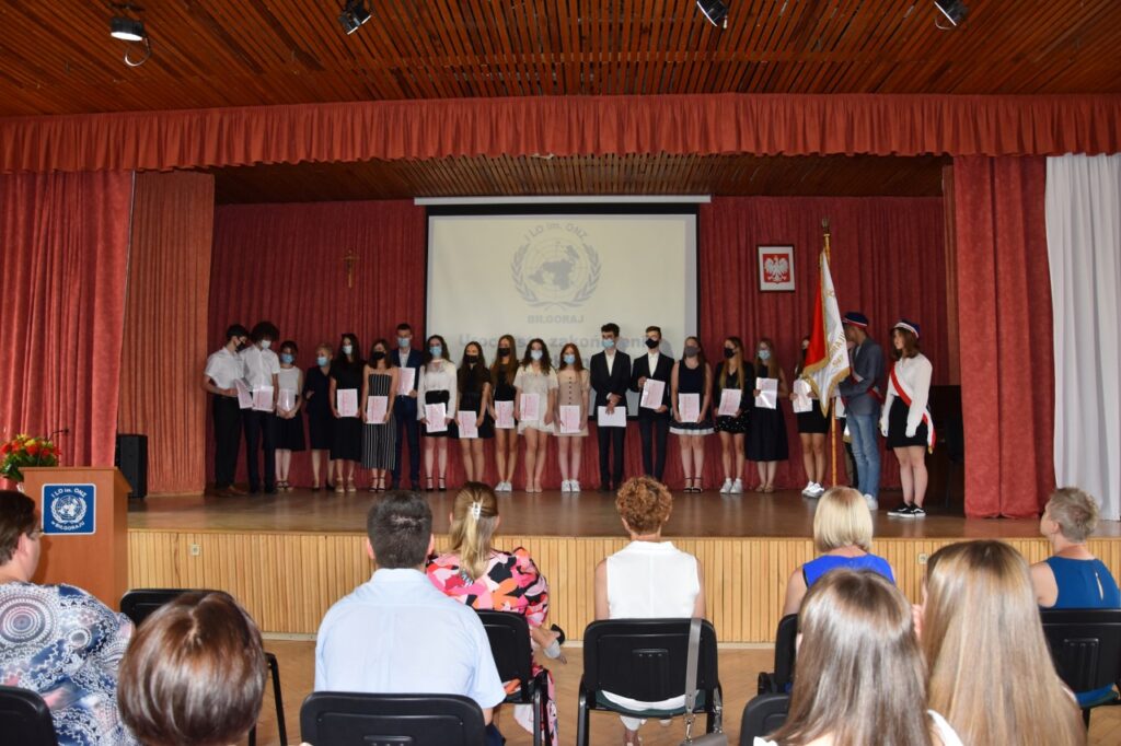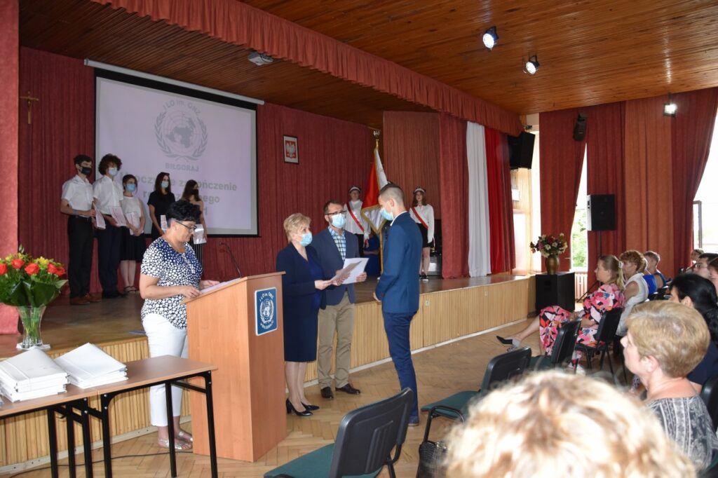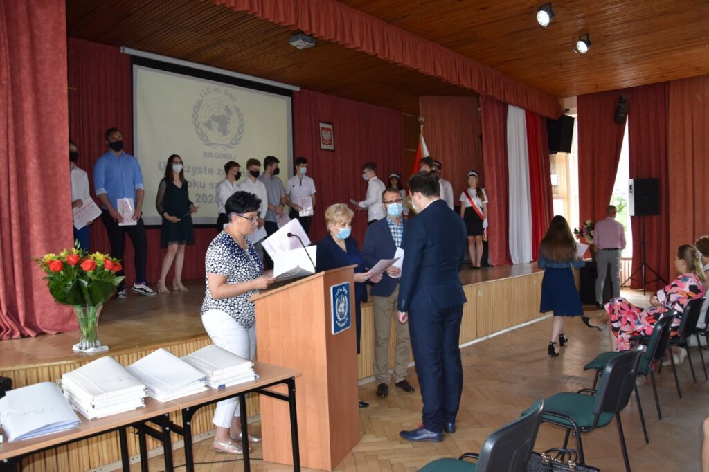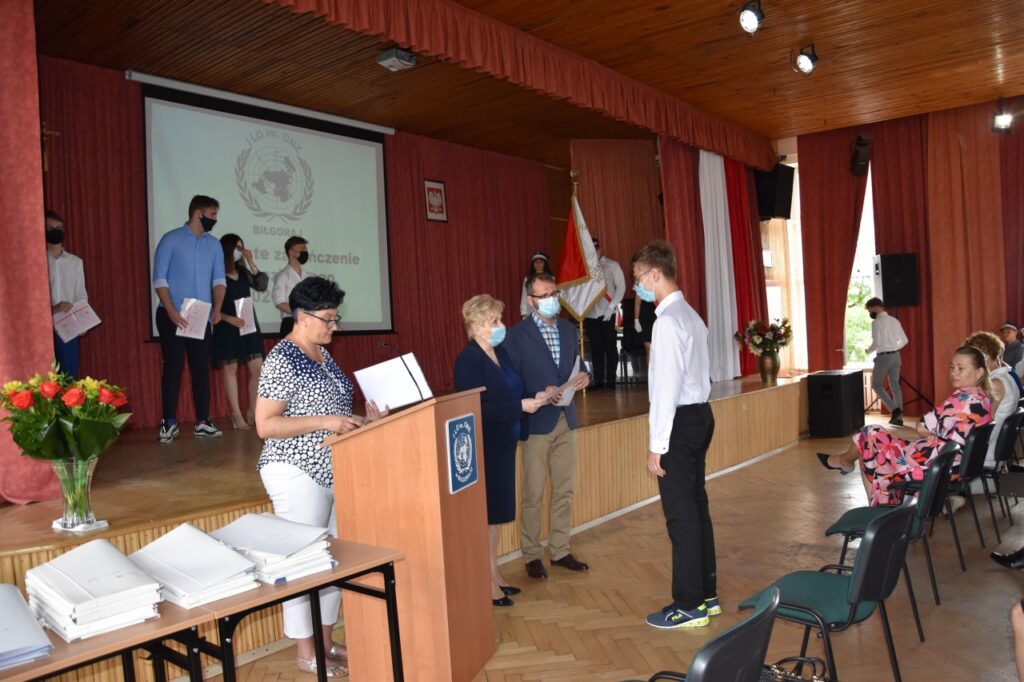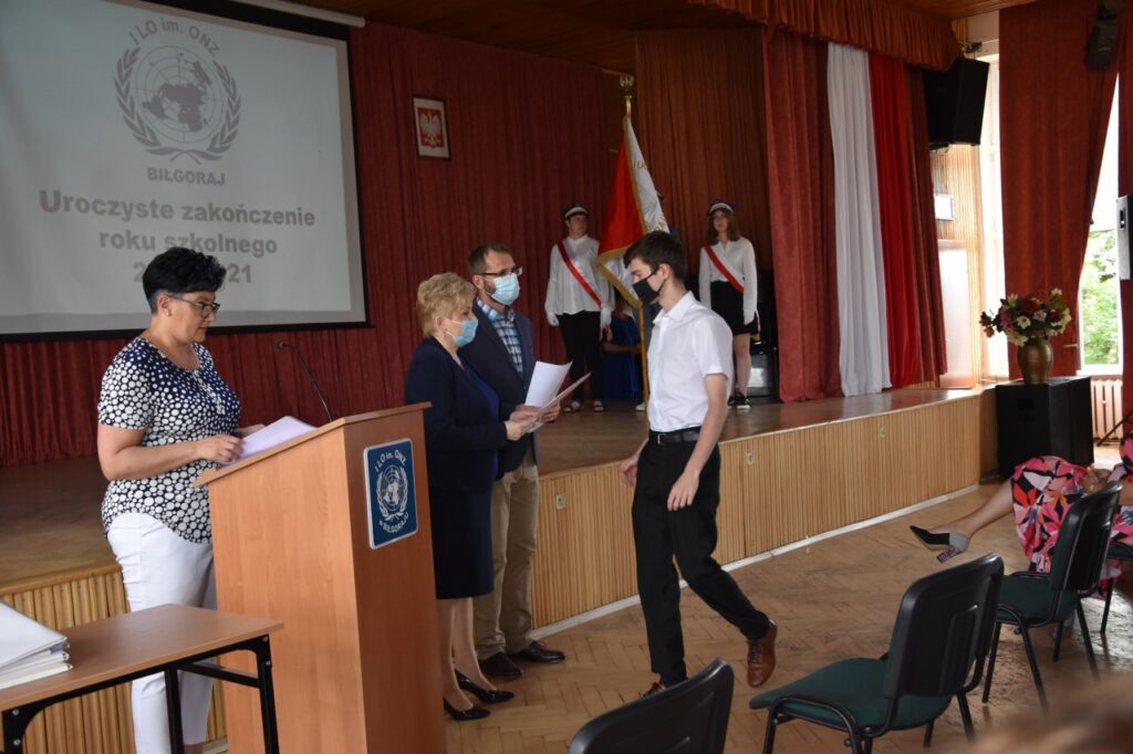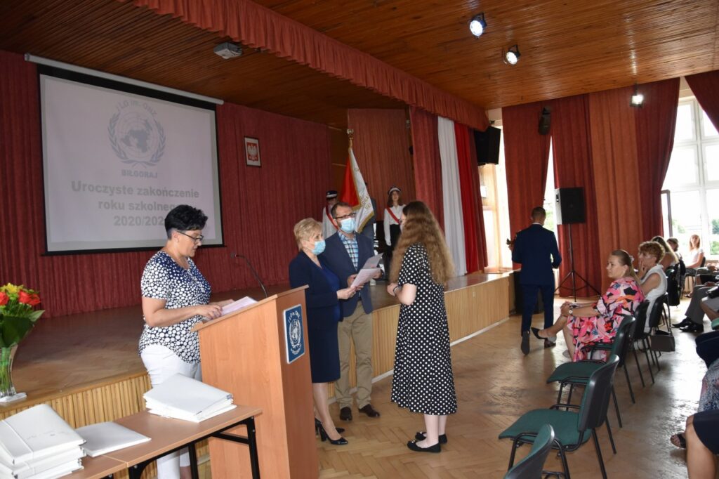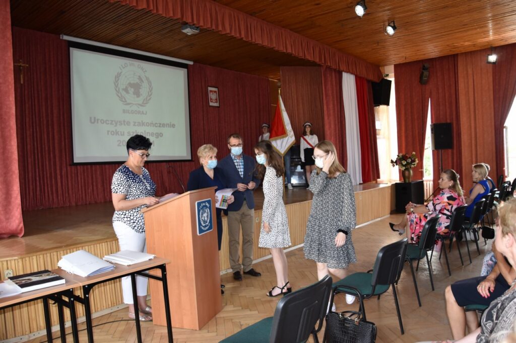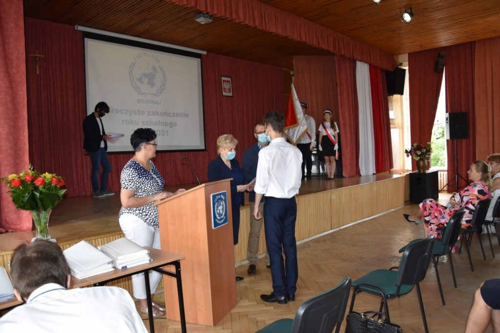 admin 5 lat temu Bez kategorii , Organizacyjne , Uroczystości25 czerwca 2021 roku odbyło się uroczyste zakończenie roku szkolnego. Ze względu na pandemię do auli szkoły zostali zaproszeni tylko ci uczniowie, którzy uzyskali najwyższe wyniki w nauce i 100% frekwencję. Najlepsi licealiści otrzymali świadectwa z czerwonym paskiem, Listy Gratulacyjne i karty podarunkowe. Dodatkową nagrodę przekazaną przez jedną z biłgorajskich firm otrzymał wyróżniający się uczeń szkoły – Piotr Łaba. Zostały również odczytane listy z podziękowaniami i życzeniami skierowane do dyrekcji, nauczycieli i uczniów przesłane przez Lubelskiego Kuratora Oświaty oraz Starostę Biłgorajskiego.