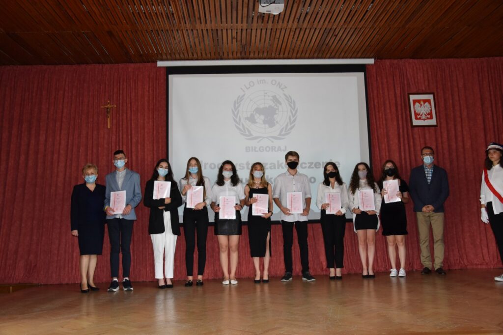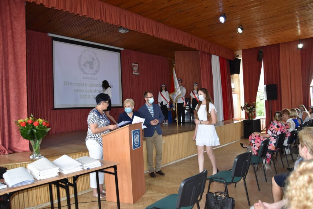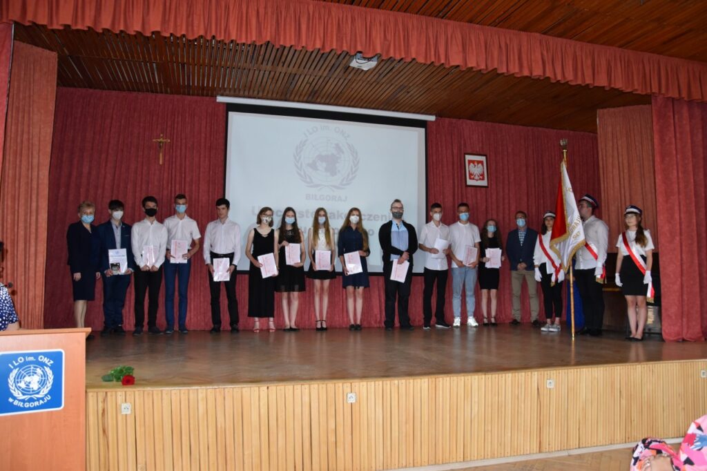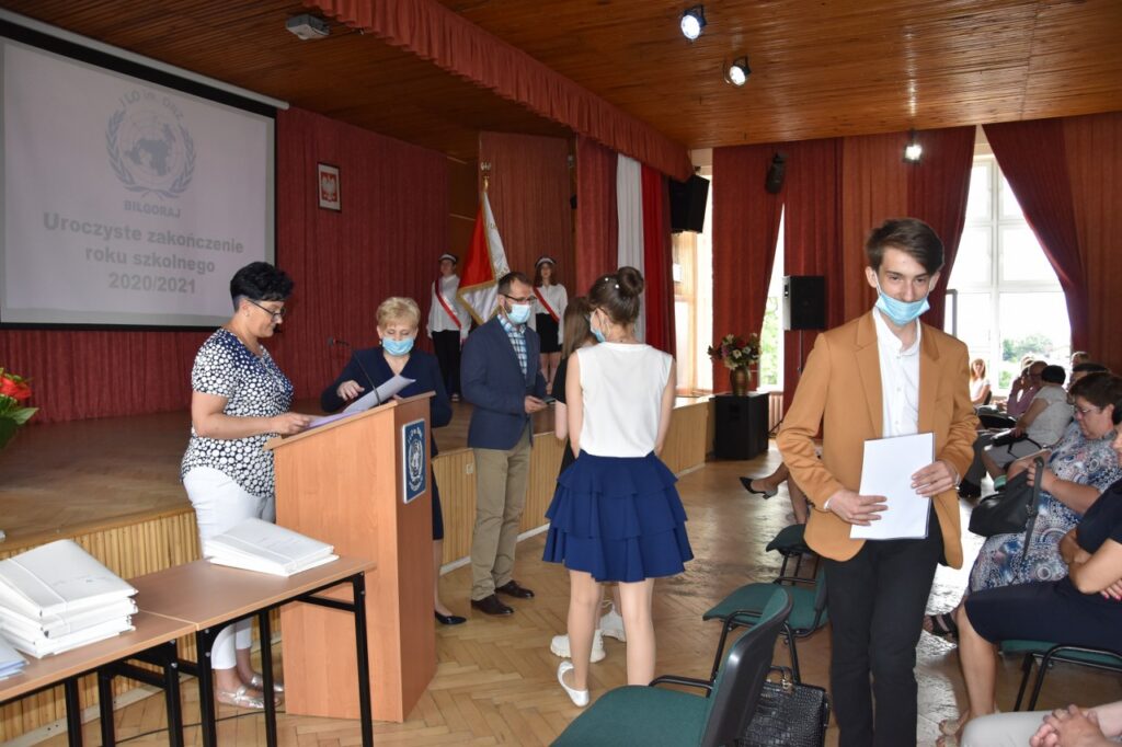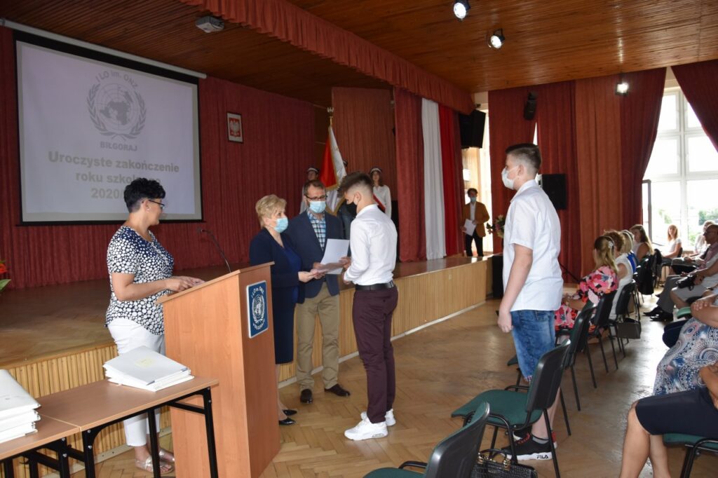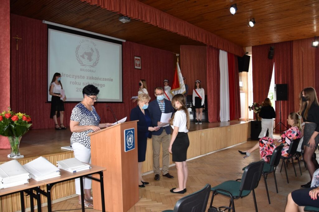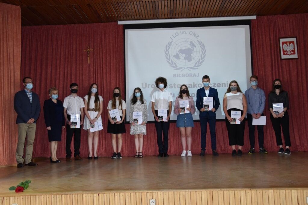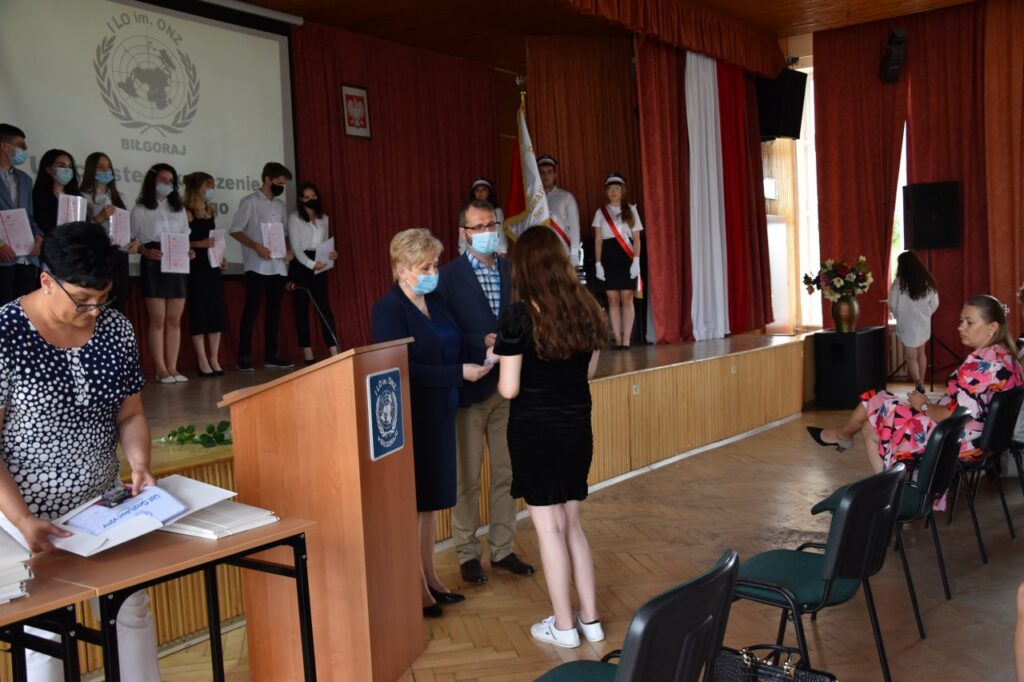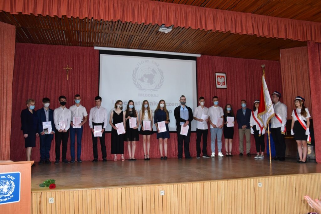 admin 5 lat temu Bez kategorii , Organizacyjne , Uroczystości25 czerwca 2021 roku odbyło się uroczyste zakończenie roku szkolnego. Ze względu na pandemię do auli szkoły zostali zaproszeni tylko ci uczniowie, którzy uzyskali najwyższe wyniki w nauce i 100% frekwencję. Najlepsi licealiści otrzymali świadectwa z czerwonym paskiem, Listy Gratulacyjne i karty podarunkowe. Dodatkową nagrodę przekazaną przez jedną z biłgorajskich firm otrzymał wyróżniający się uczeń szkoły – Piotr Łaba. Zostały również odczytane listy z podziękowaniami i życzeniami skierowane do dyrekcji, nauczycieli i uczniów przesłane przez Lubelskiego Kuratora Oświaty oraz Starostę Biłgorajskiego.
