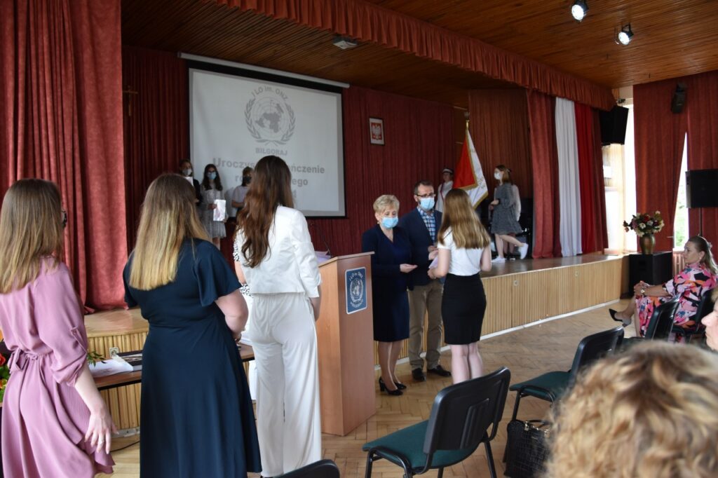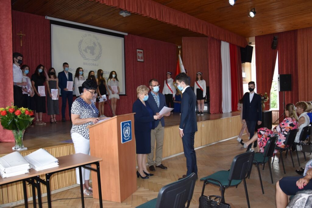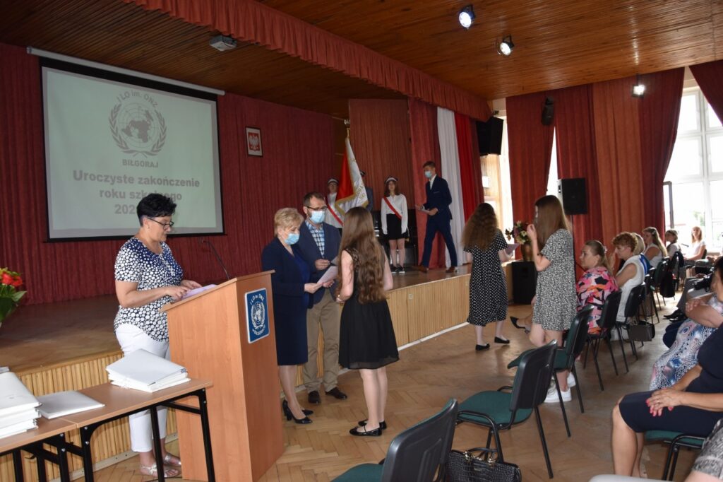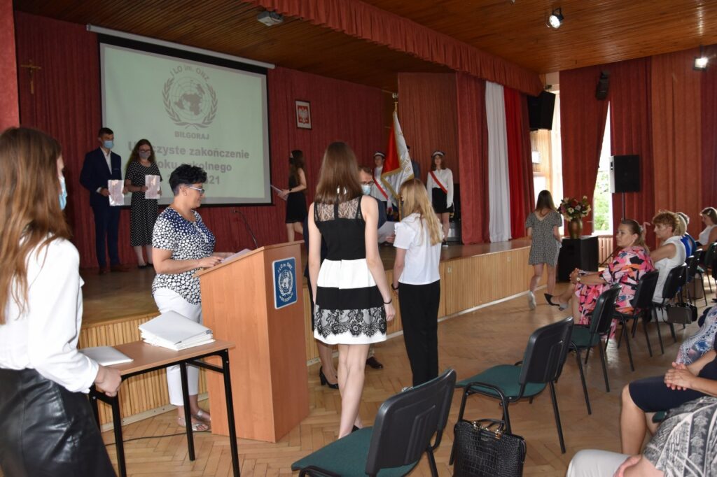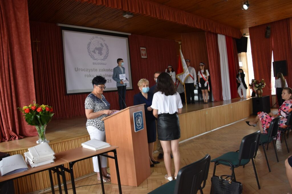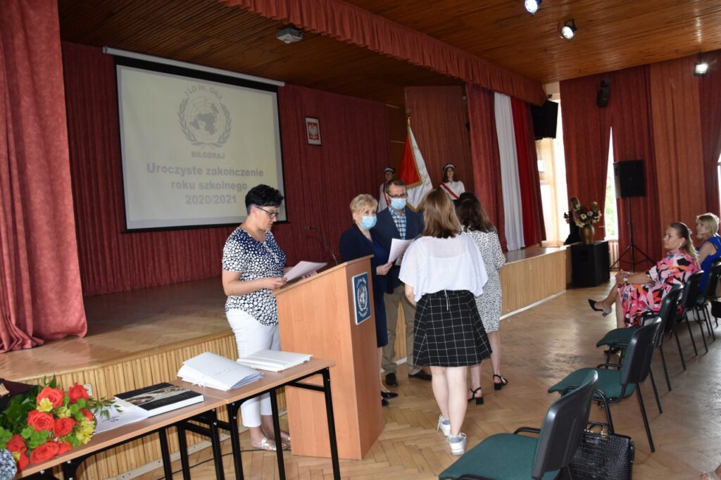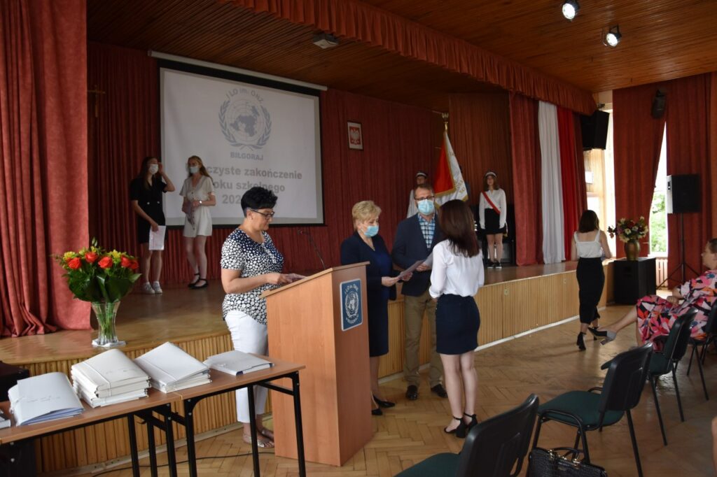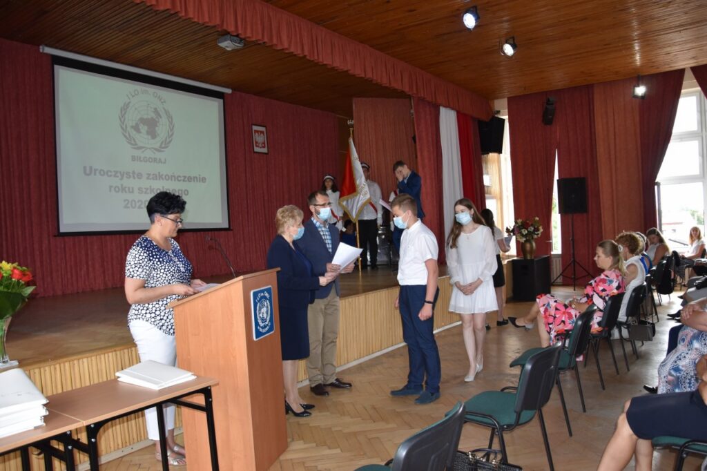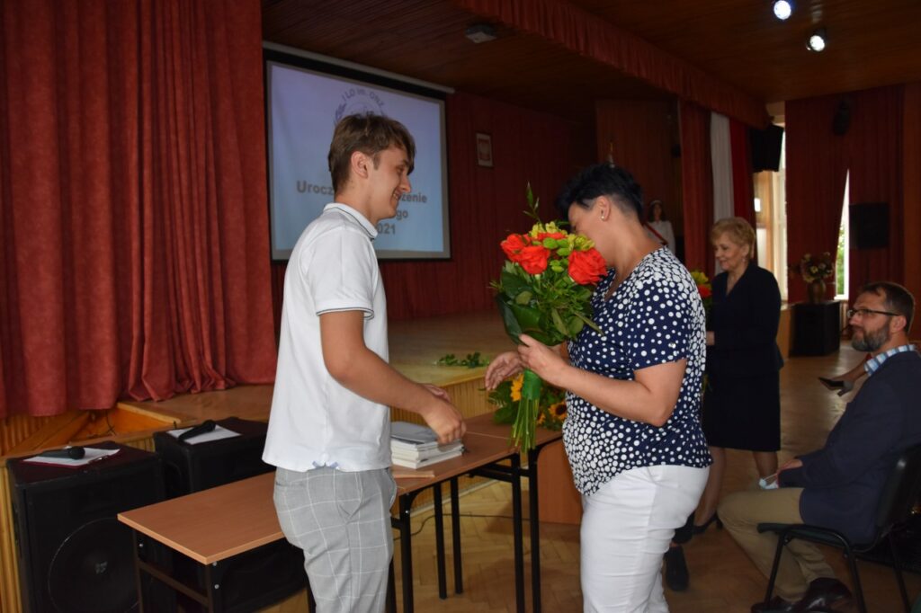 admin 5 lat temu Bez kategorii , Organizacyjne , Uroczystości25 czerwca 2021 roku odbyło się uroczyste zakończenie roku szkolnego. Ze względu na pandemię do auli szkoły zostali zaproszeni tylko ci uczniowie, którzy uzyskali najwyższe wyniki w nauce i 100% frekwencję. Najlepsi licealiści otrzymali świadectwa z czerwonym paskiem, Listy Gratulacyjne i karty podarunkowe. Dodatkową nagrodę przekazaną przez jedną z biłgorajskich firm otrzymał wyróżniający się uczeń szkoły – Piotr Łaba. Zostały również odczytane listy z podziękowaniami i życzeniami skierowane do dyrekcji, nauczycieli i uczniów przesłane przez Lubelskiego Kuratora Oświaty oraz Starostę Biłgorajskiego.