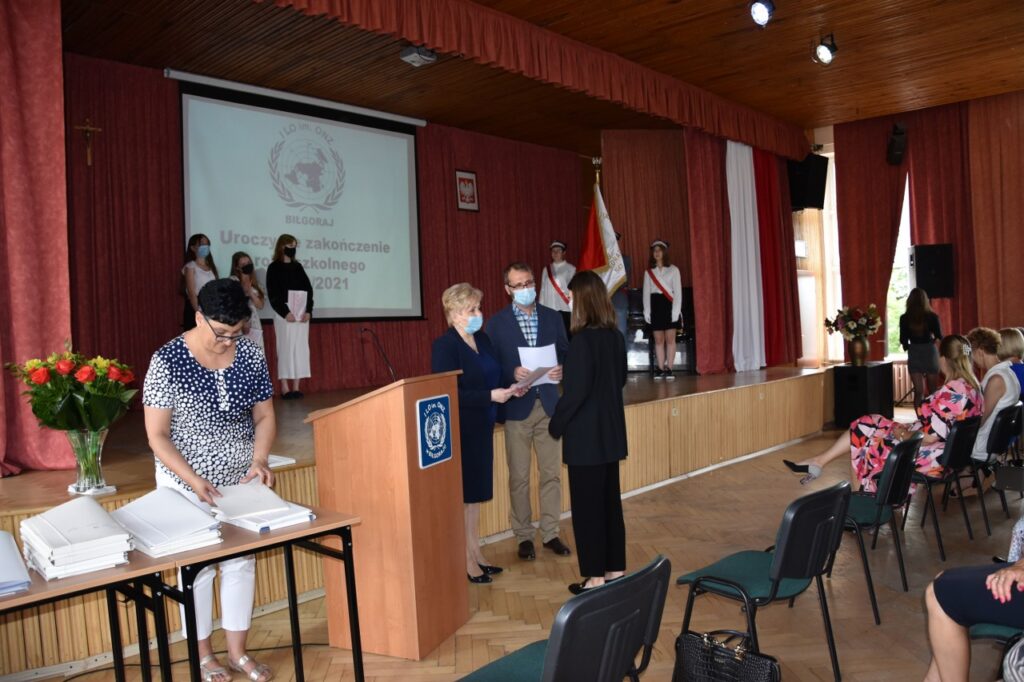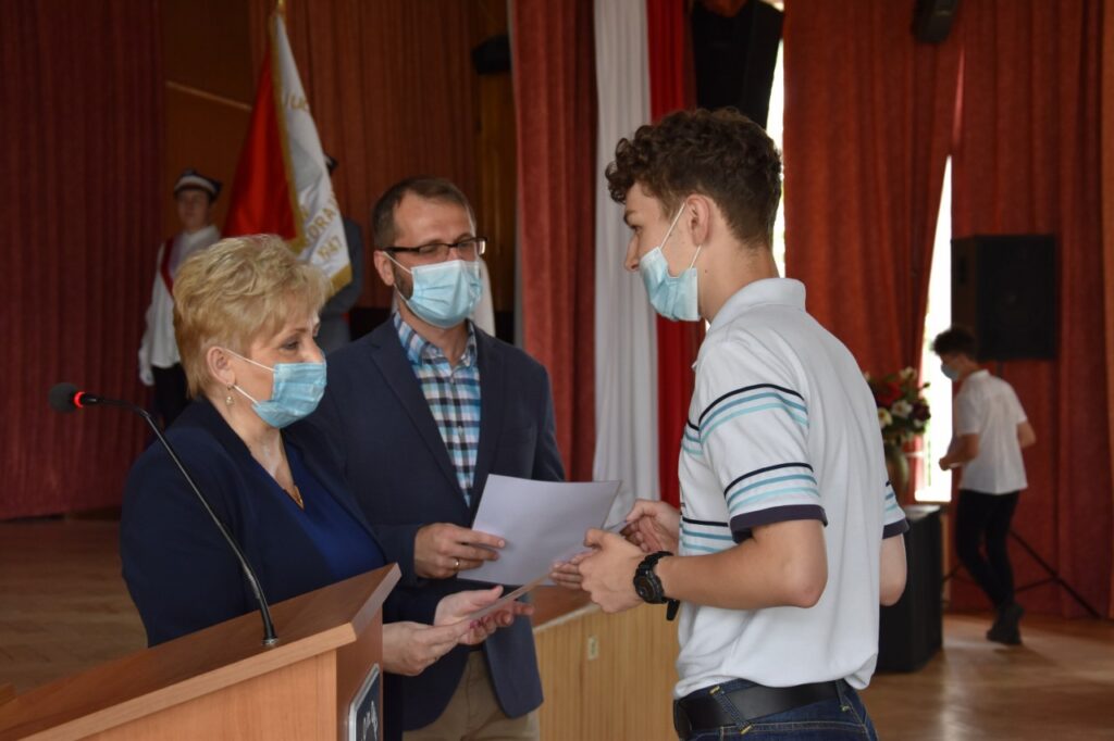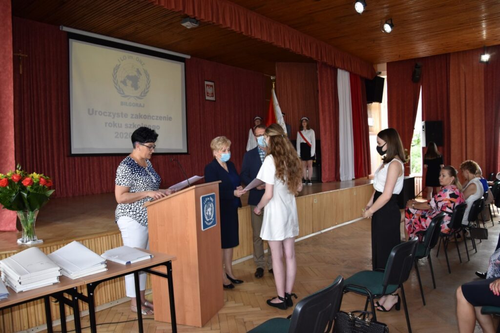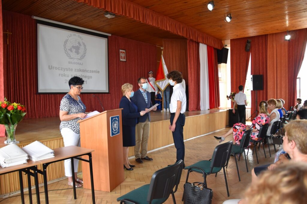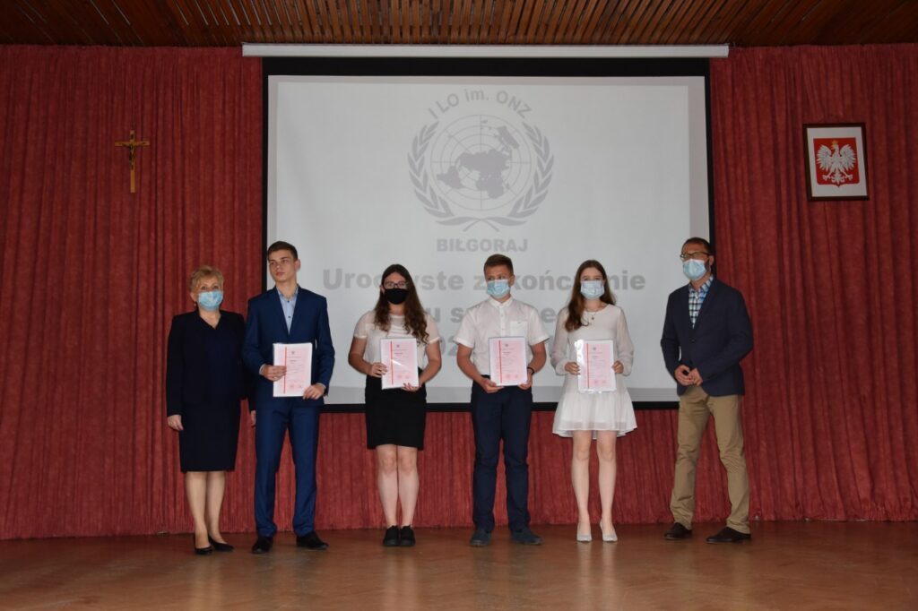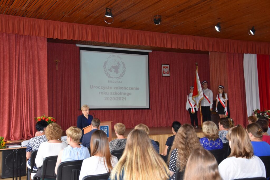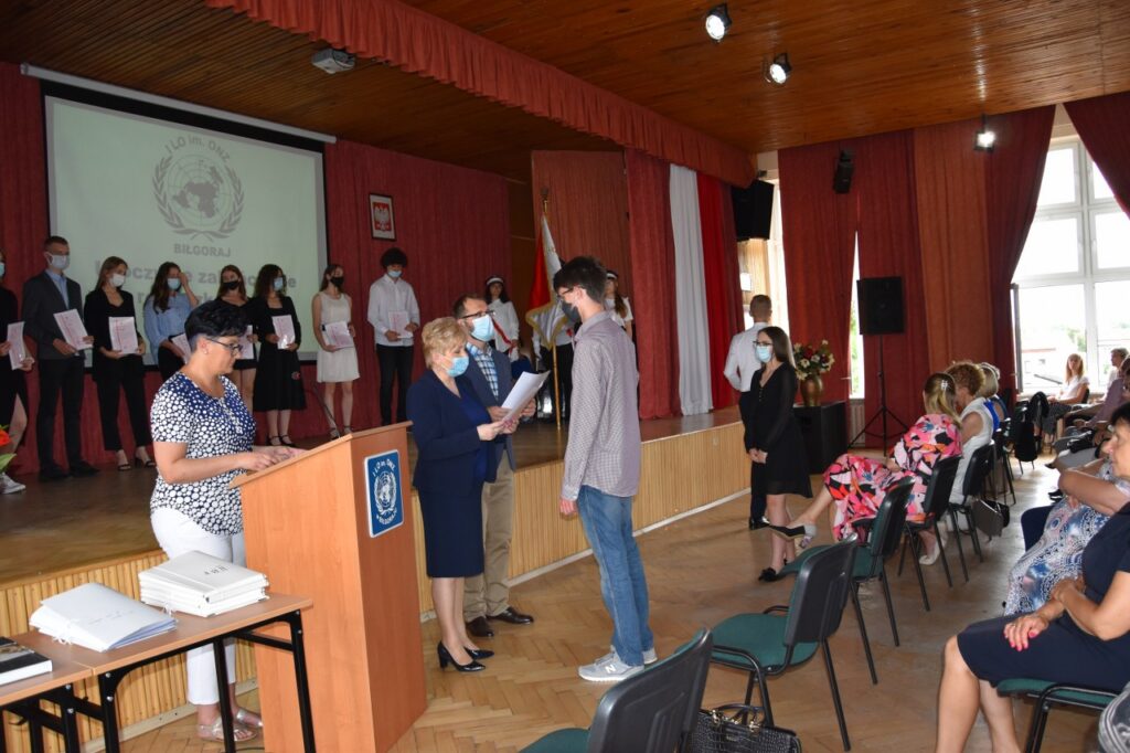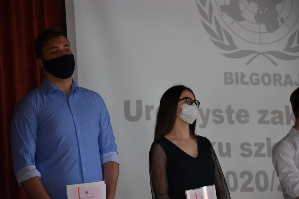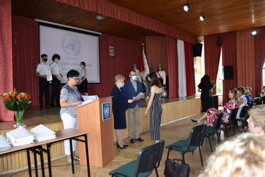admin 5 lat temu Bez kategorii , Organizacyjne , Uroczystości25 czerwca 2021 roku odbyło się uroczyste zakończenie roku szkolnego. Ze względu na pandemię do auli szkoły zostali zaproszeni tylko ci uczniowie, którzy uzyskali najwyższe wyniki w nauce i 100% frekwencję. Najlepsi licealiści otrzymali świadectwa z czerwonym paskiem, Listy Gratulacyjne i karty podarunkowe. Dodatkową nagrodę przekazaną przez jedną z biłgorajskich firm otrzymał wyróżniający się uczeń szkoły – Piotr Łaba. Zostały również odczytane listy z podziękowaniami i życzeniami skierowane do dyrekcji, nauczycieli i uczniów przesłane przez Lubelskiego Kuratora Oświaty oraz Starostę Biłgorajskiego.