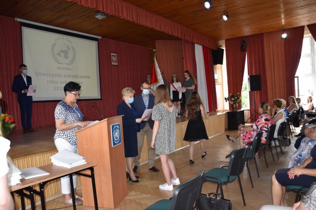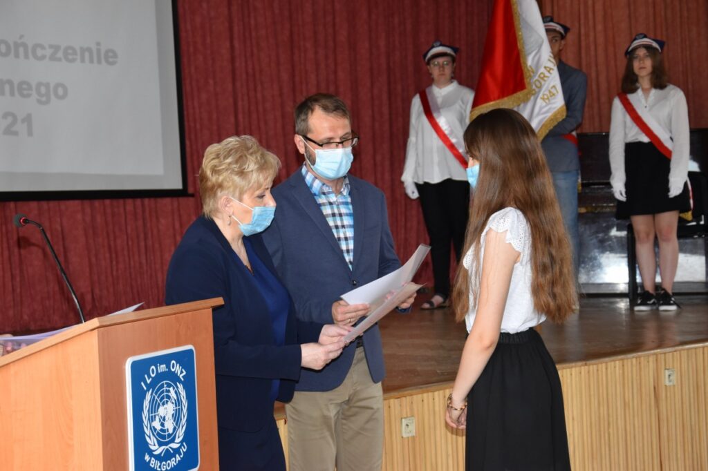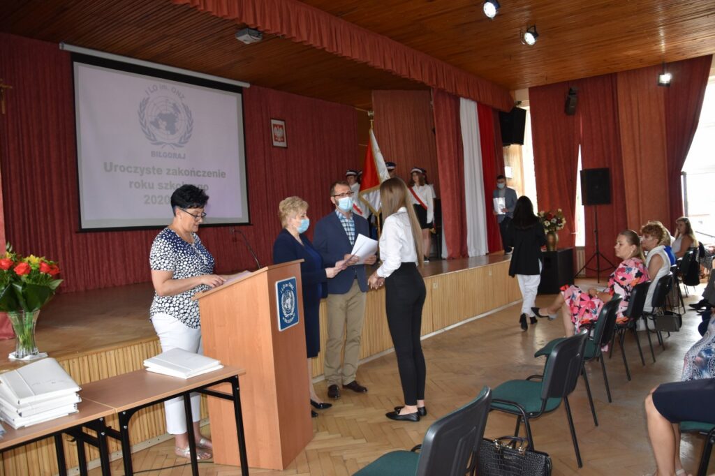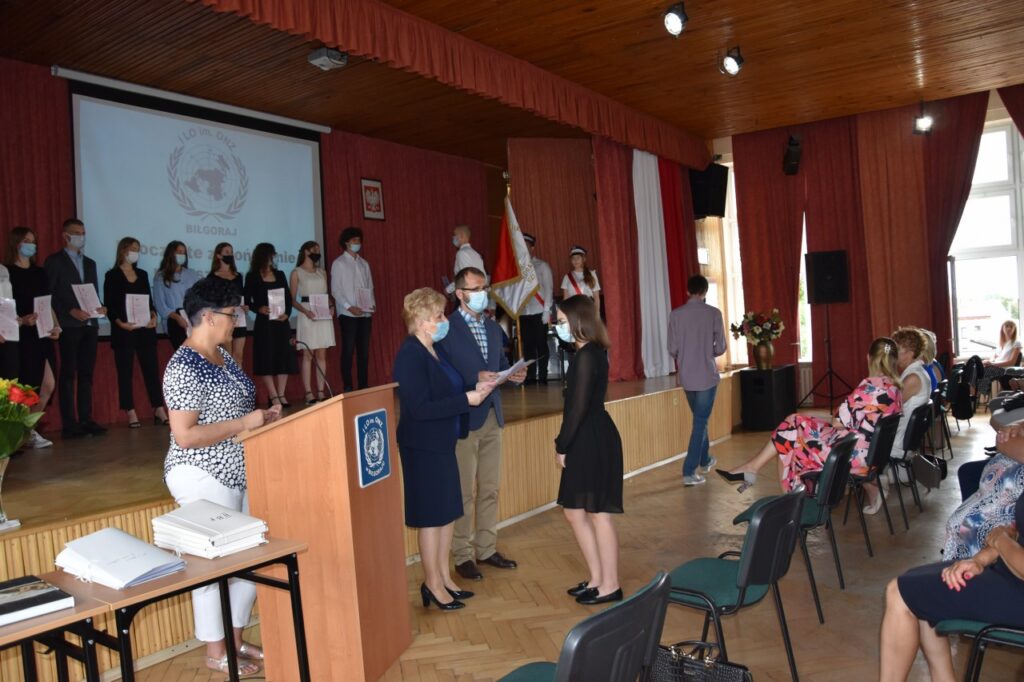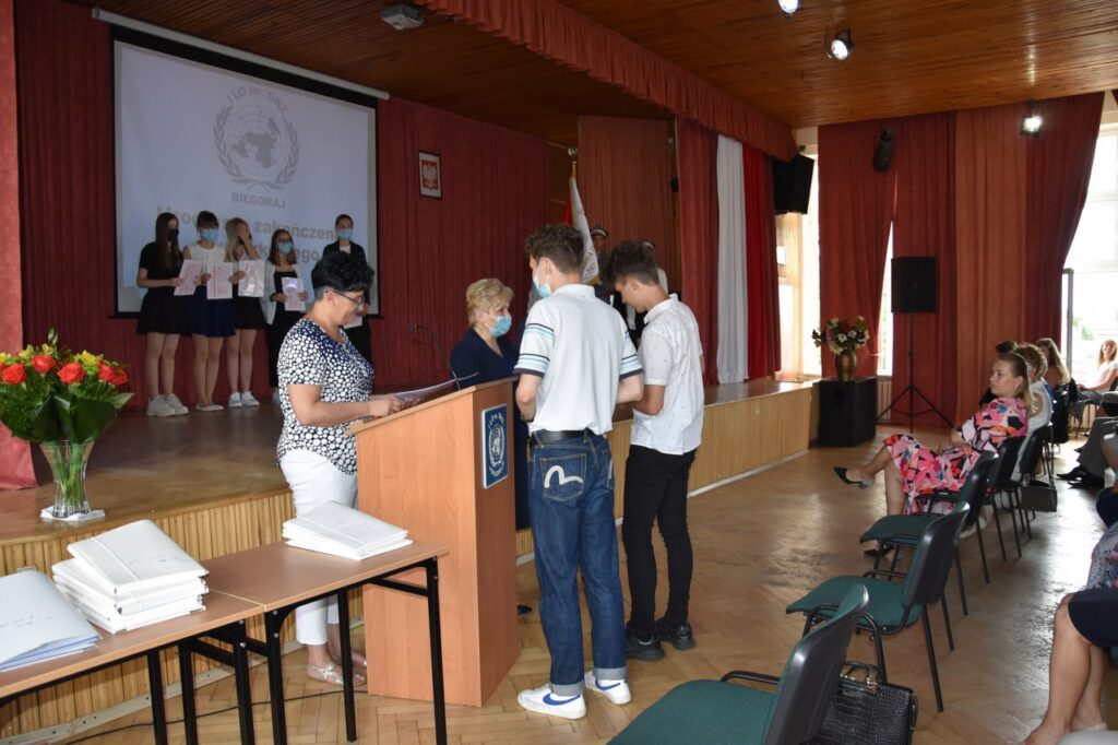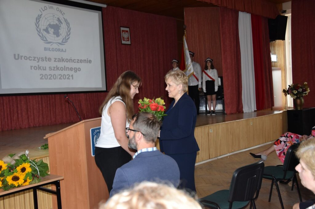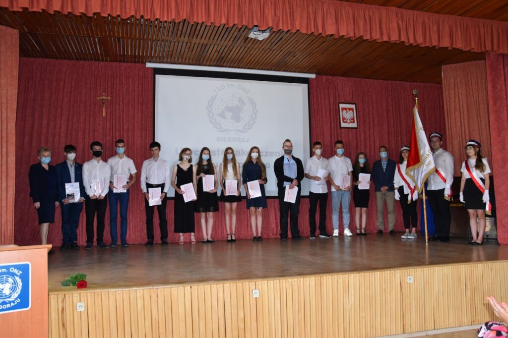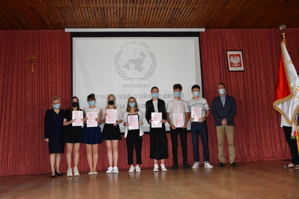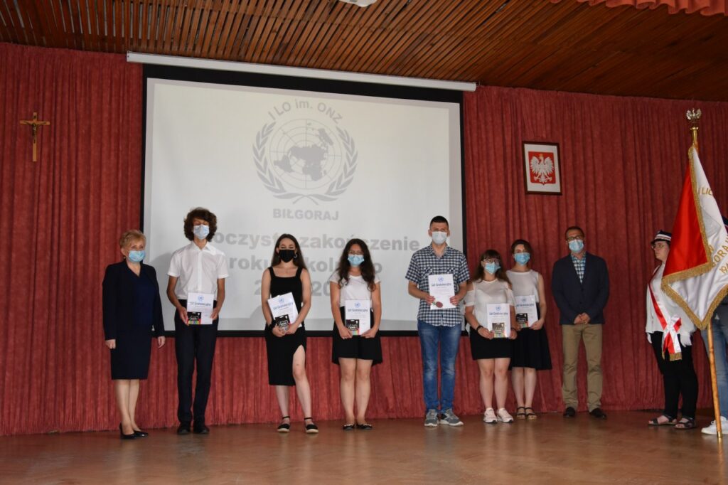 admin 5 lat temu Bez kategorii , Organizacyjne , Uroczystości25 czerwca 2021 roku odbyło się uroczyste zakończenie roku szkolnego. Ze względu na pandemię do auli szkoły zostali zaproszeni tylko ci uczniowie, którzy uzyskali najwyższe wyniki w nauce i 100% frekwencję. Najlepsi licealiści otrzymali świadectwa z czerwonym paskiem, Listy Gratulacyjne i karty podarunkowe. Dodatkową nagrodę przekazaną przez jedną z biłgorajskich firm otrzymał wyróżniający się uczeń szkoły – Piotr Łaba. Zostały również odczytane listy z podziękowaniami i życzeniami skierowane do dyrekcji, nauczycieli i uczniów przesłane przez Lubelskiego Kuratora Oświaty oraz Starostę Biłgorajskiego.