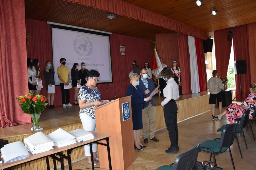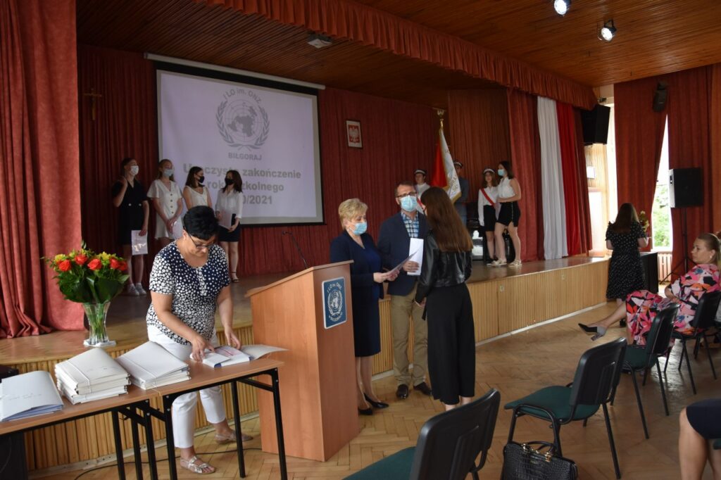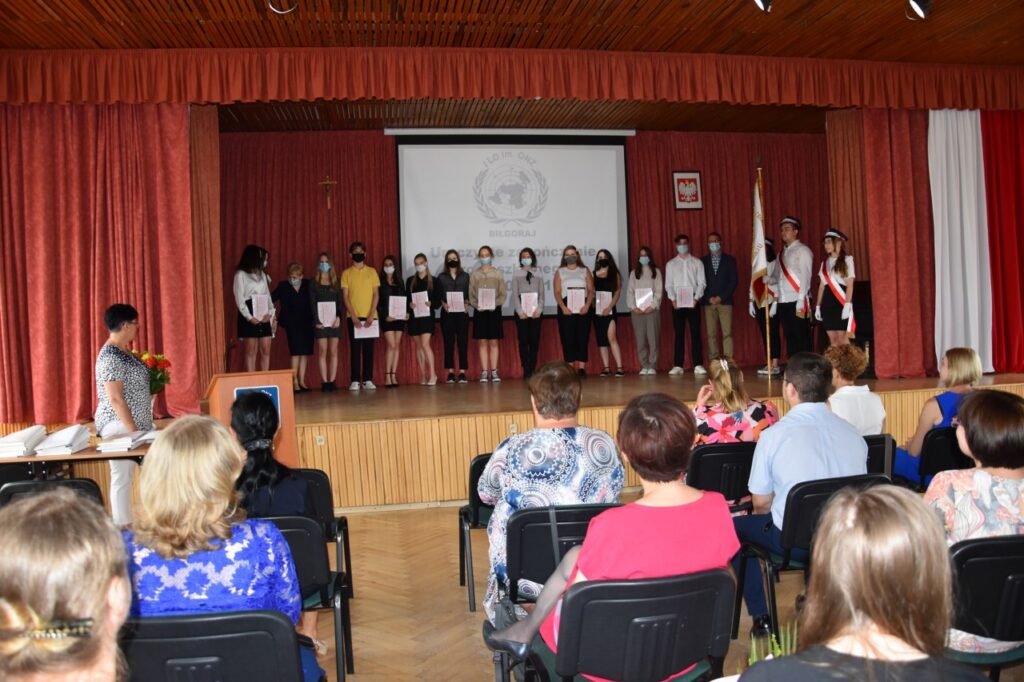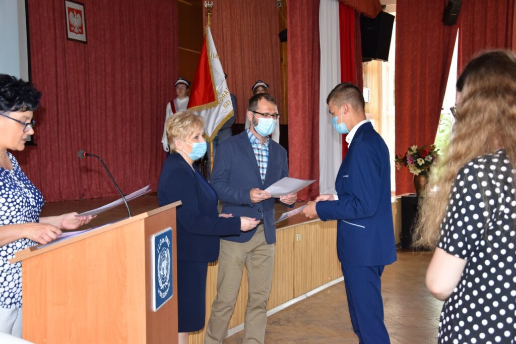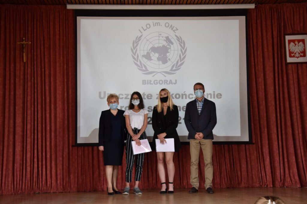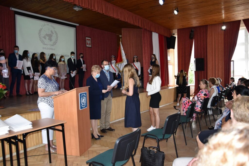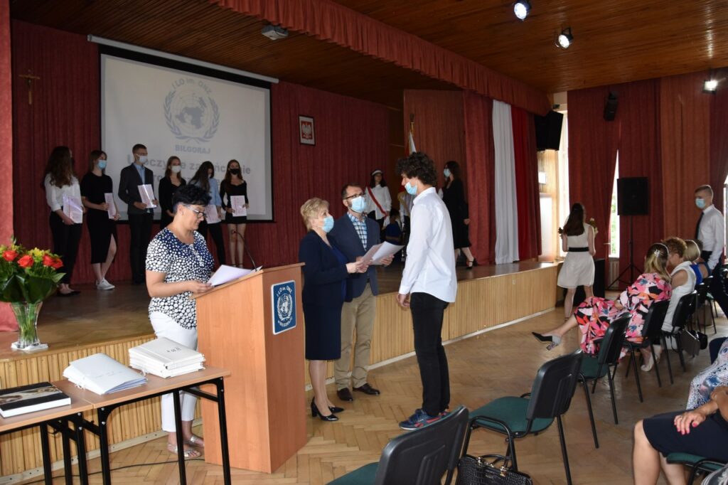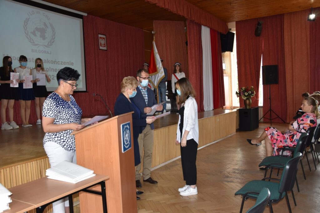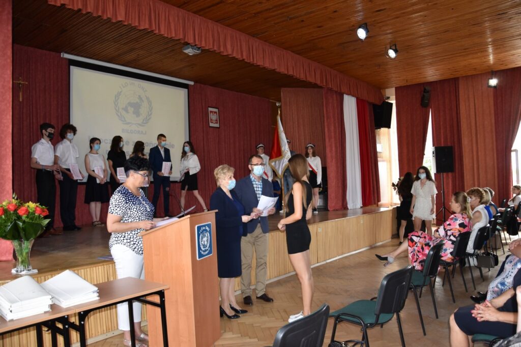 admin 5 lat temu Bez kategorii , Organizacyjne , Uroczystości25 czerwca 2021 roku odbyło się uroczyste zakończenie roku szkolnego. Ze względu na pandemię do auli szkoły zostali zaproszeni tylko ci uczniowie, którzy uzyskali najwyższe wyniki w nauce i 100% frekwencję. Najlepsi licealiści otrzymali świadectwa z czerwonym paskiem, Listy Gratulacyjne i karty podarunkowe. Dodatkową nagrodę przekazaną przez jedną z biłgorajskich firm otrzymał wyróżniający się uczeń szkoły – Piotr Łaba. Zostały również odczytane listy z podziękowaniami i życzeniami skierowane do dyrekcji, nauczycieli i uczniów przesłane przez Lubelskiego Kuratora Oświaty oraz Starostę Biłgorajskiego.