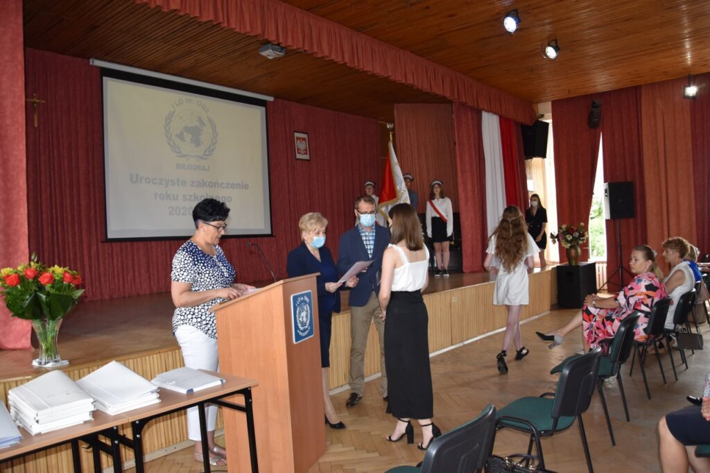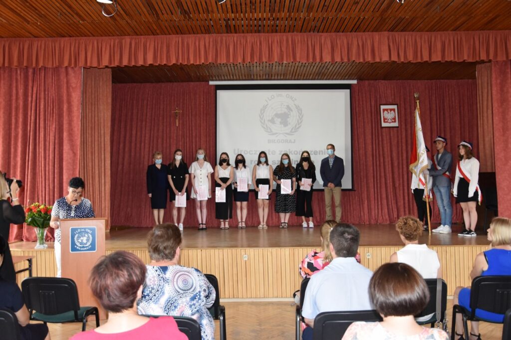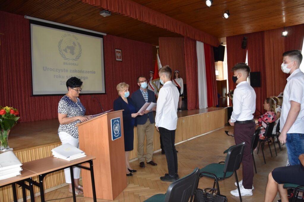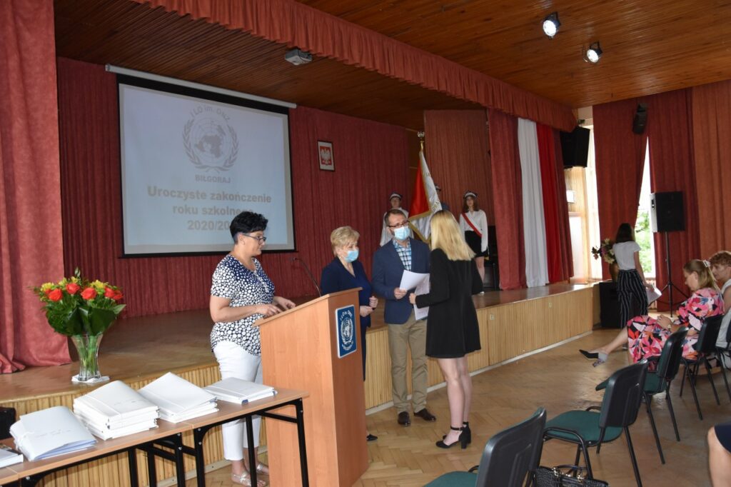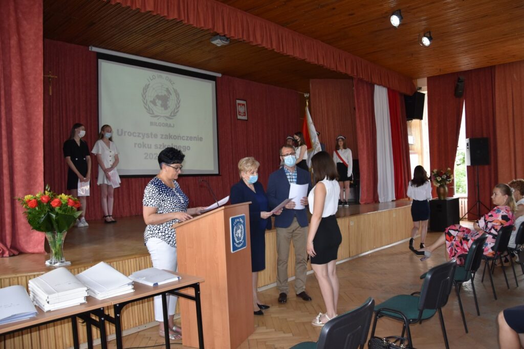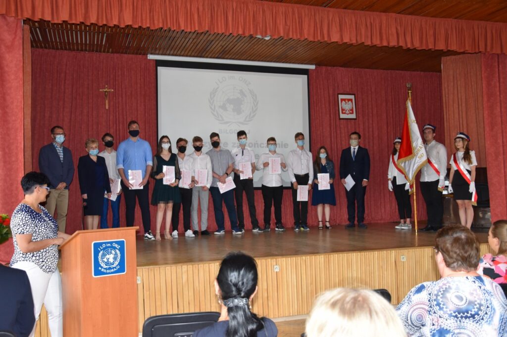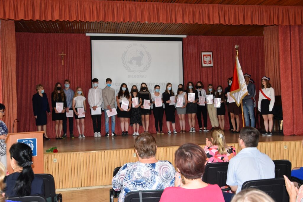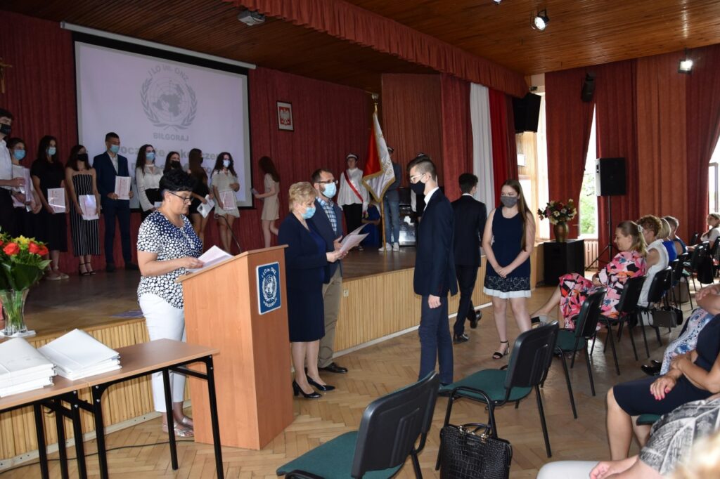 admin 5 lat temu Bez kategorii , Organizacyjne , Uroczystości25 czerwca 2021 roku odbyło się uroczyste zakończenie roku szkolnego. Ze względu na pandemię do auli szkoły zostali zaproszeni tylko ci uczniowie, którzy uzyskali najwyższe wyniki w nauce i 100% frekwencję. Najlepsi licealiści otrzymali świadectwa z czerwonym paskiem, Listy Gratulacyjne i karty podarunkowe. Dodatkową nagrodę przekazaną przez jedną z biłgorajskich firm otrzymał wyróżniający się uczeń szkoły – Piotr Łaba. Zostały również odczytane listy z podziękowaniami i życzeniami skierowane do dyrekcji, nauczycieli i uczniów przesłane przez Lubelskiego Kuratora Oświaty oraz Starostę Biłgorajskiego.