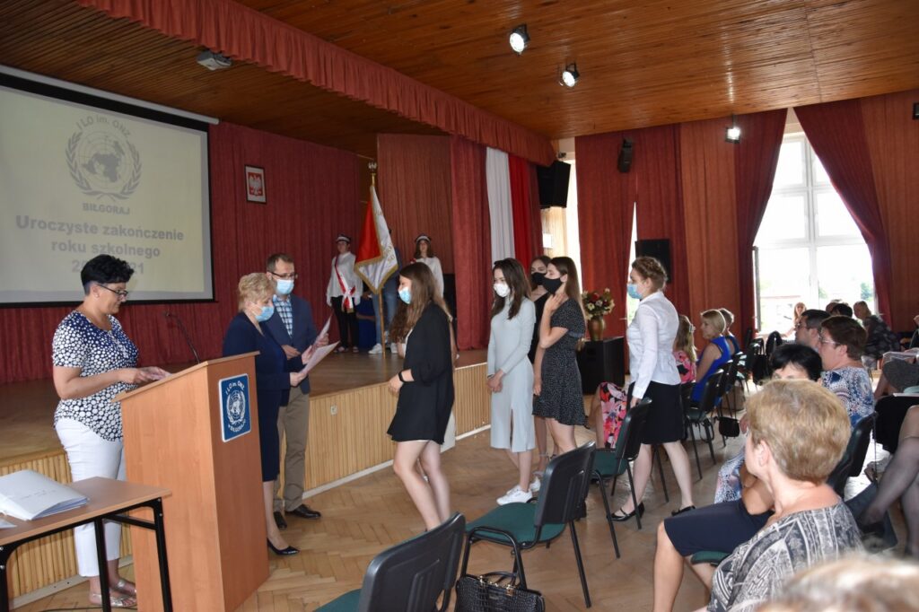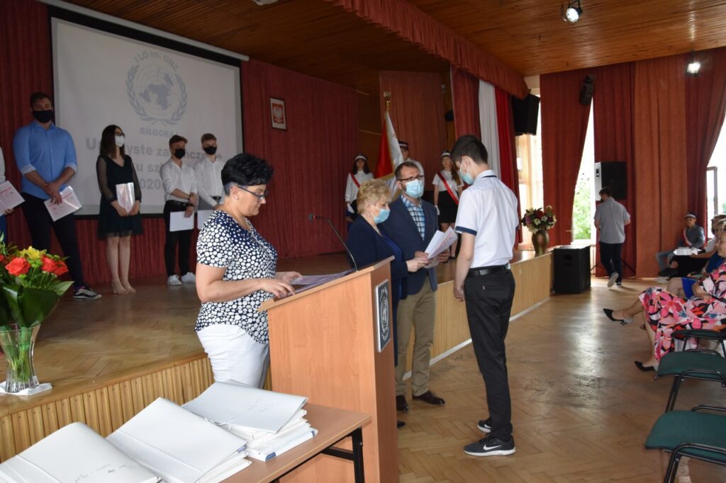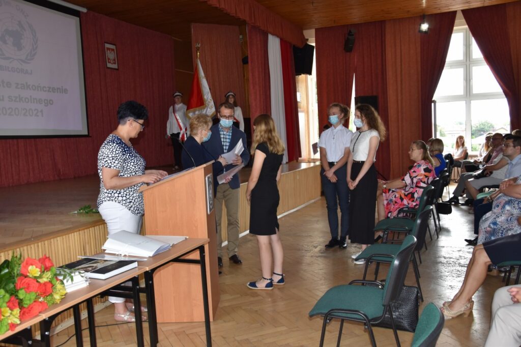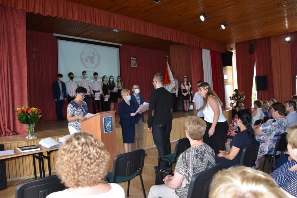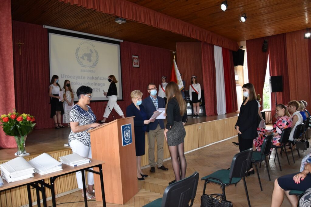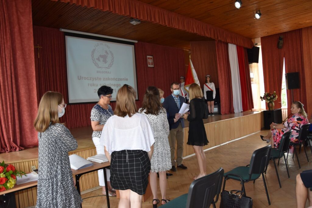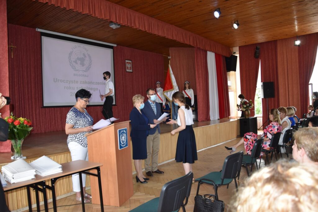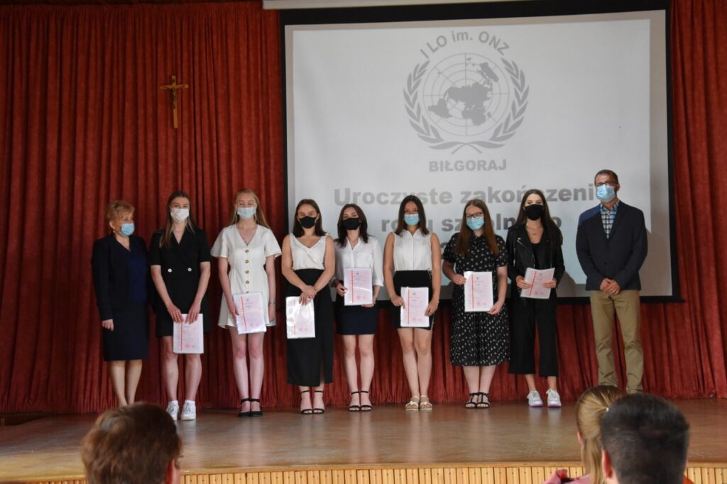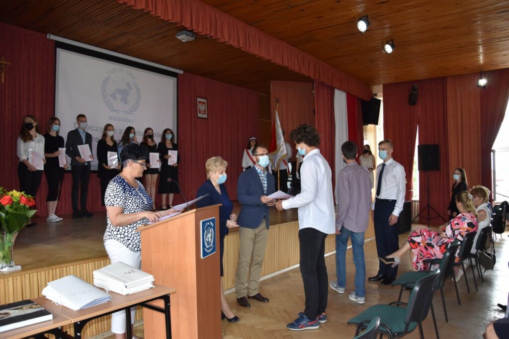 admin 5 lat temu Bez kategorii , Organizacyjne , Uroczystości25 czerwca 2021 roku odbyło się uroczyste zakończenie roku szkolnego. Ze względu na pandemię do auli szkoły zostali zaproszeni tylko ci uczniowie, którzy uzyskali najwyższe wyniki w nauce i 100% frekwencję. Najlepsi licealiści otrzymali świadectwa z czerwonym paskiem, Listy Gratulacyjne i karty podarunkowe. Dodatkową nagrodę przekazaną przez jedną z biłgorajskich firm otrzymał wyróżniający się uczeń szkoły – Piotr Łaba. Zostały również odczytane listy z podziękowaniami i życzeniami skierowane do dyrekcji, nauczycieli i uczniów przesłane przez Lubelskiego Kuratora Oświaty oraz Starostę Biłgorajskiego.