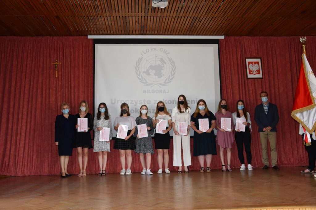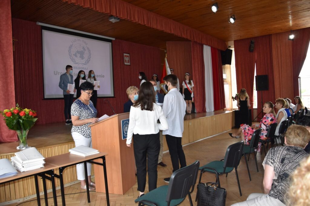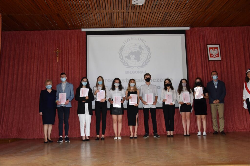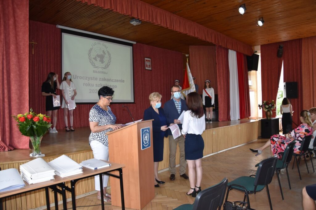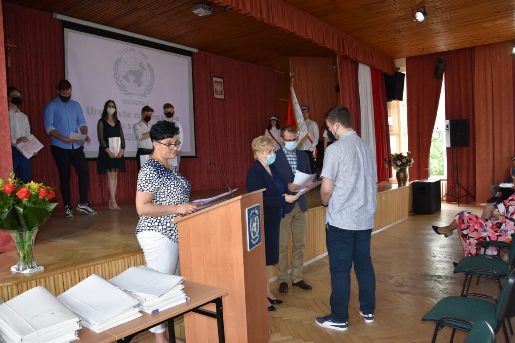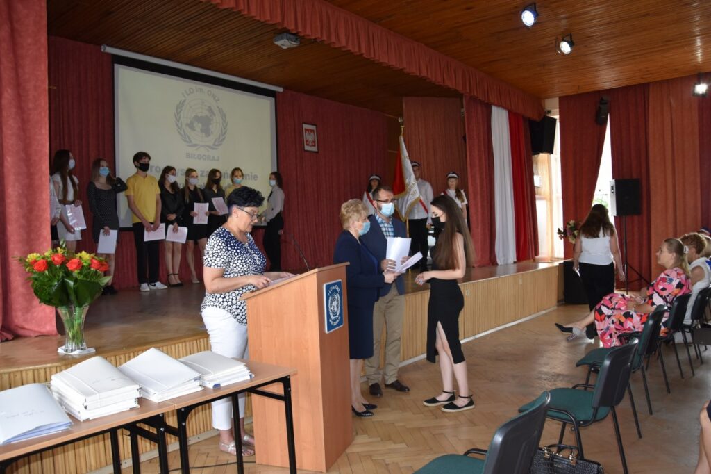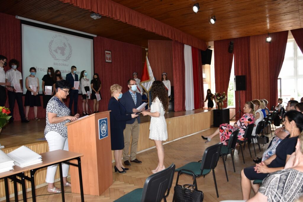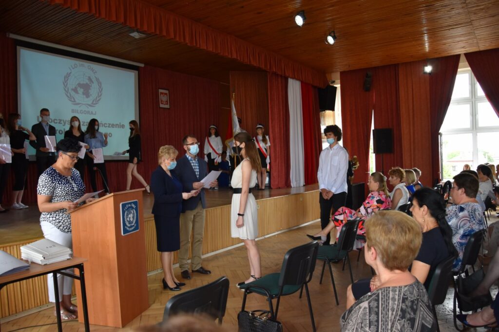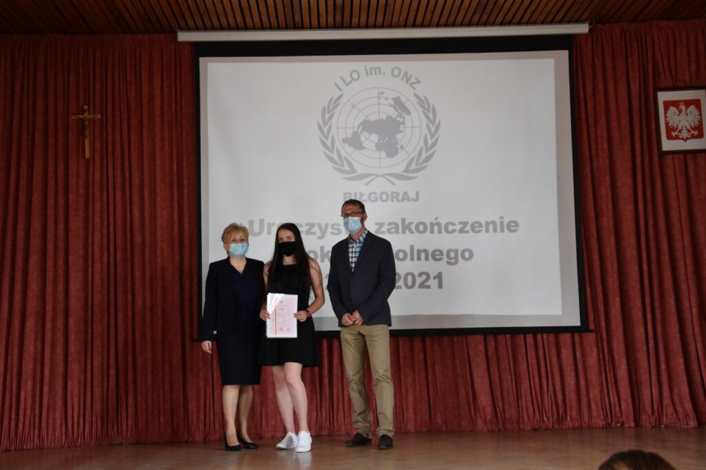 admin 5 lat temu Bez kategorii , Organizacyjne , Uroczystości25 czerwca 2021 roku odbyło się uroczyste zakończenie roku szkolnego. Ze względu na pandemię do auli szkoły zostali zaproszeni tylko ci uczniowie, którzy uzyskali najwyższe wyniki w nauce i 100% frekwencję. Najlepsi licealiści otrzymali świadectwa z czerwonym paskiem, Listy Gratulacyjne i karty podarunkowe. Dodatkową nagrodę przekazaną przez jedną z biłgorajskich firm otrzymał wyróżniający się uczeń szkoły – Piotr Łaba. Zostały również odczytane listy z podziękowaniami i życzeniami skierowane do dyrekcji, nauczycieli i uczniów przesłane przez Lubelskiego Kuratora Oświaty oraz Starostę Biłgorajskiego.