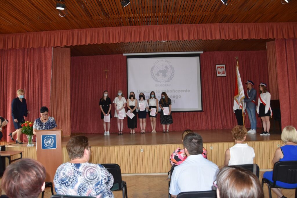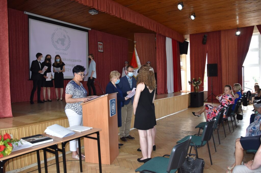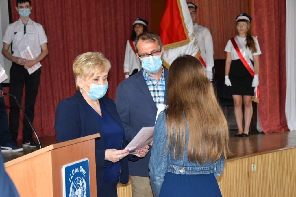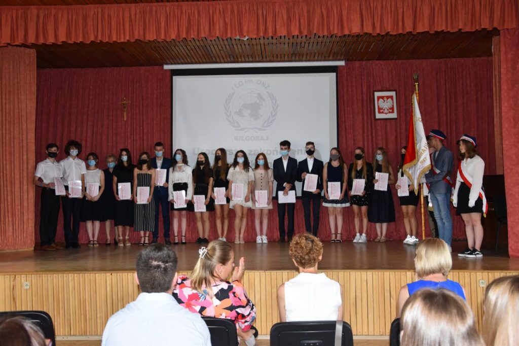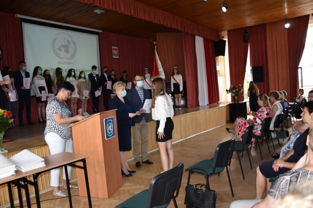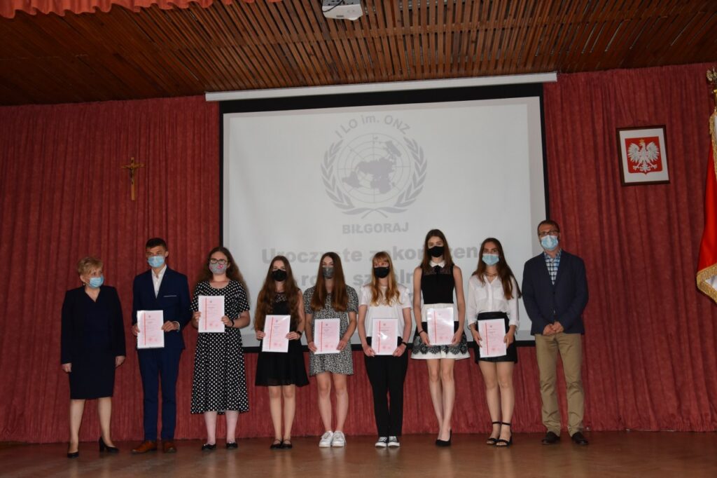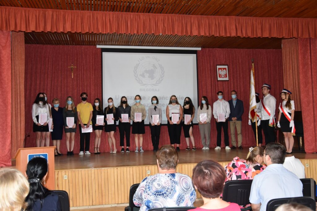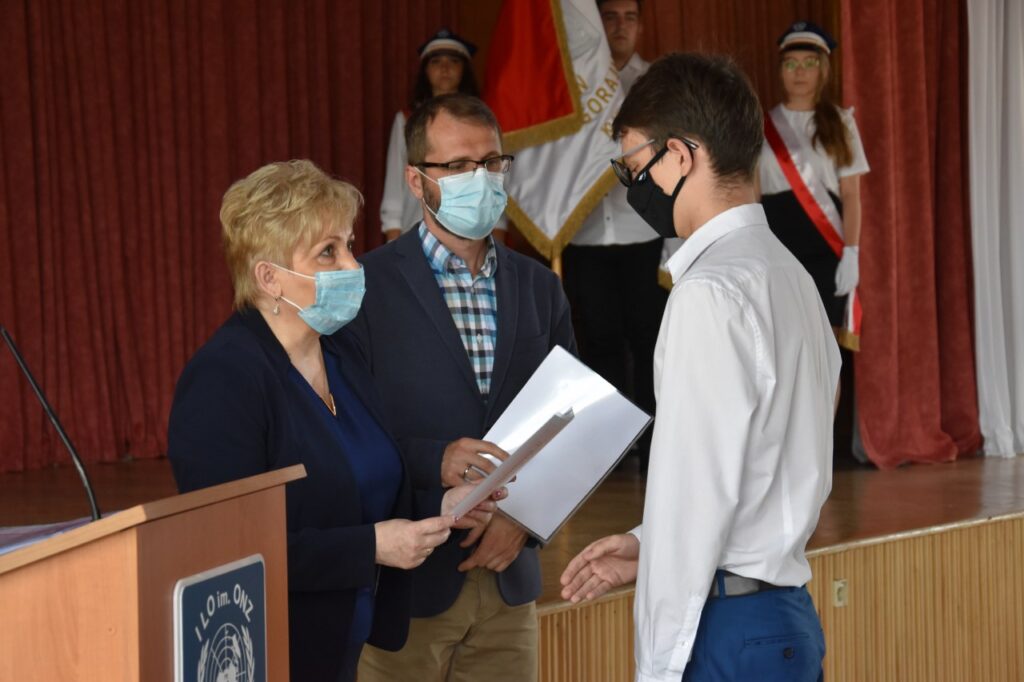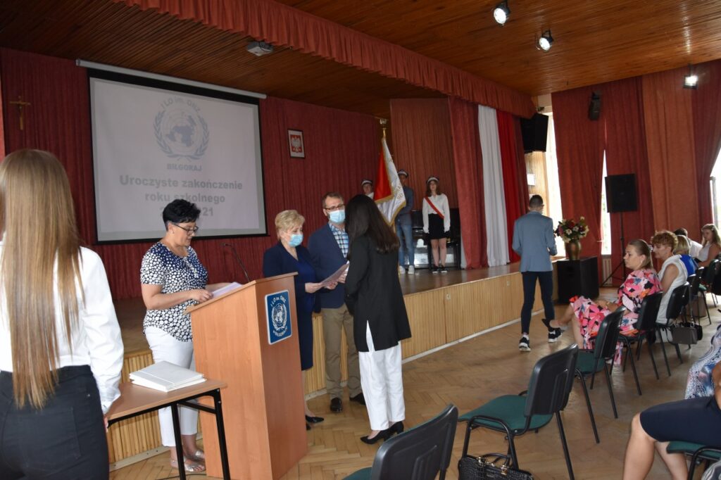 admin 5 lat temu Bez kategorii , Organizacyjne , Uroczystości25 czerwca 2021 roku odbyło się uroczyste zakończenie roku szkolnego. Ze względu na pandemię do auli szkoły zostali zaproszeni tylko ci uczniowie, którzy uzyskali najwyższe wyniki w nauce i 100% frekwencję. Najlepsi licealiści otrzymali świadectwa z czerwonym paskiem, Listy Gratulacyjne i karty podarunkowe. Dodatkową nagrodę przekazaną przez jedną z biłgorajskich firm otrzymał wyróżniający się uczeń szkoły – Piotr Łaba. Zostały również odczytane listy z podziękowaniami i życzeniami skierowane do dyrekcji, nauczycieli i uczniów przesłane przez Lubelskiego Kuratora Oświaty oraz Starostę Biłgorajskiego.