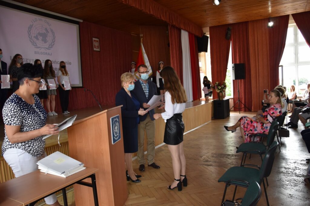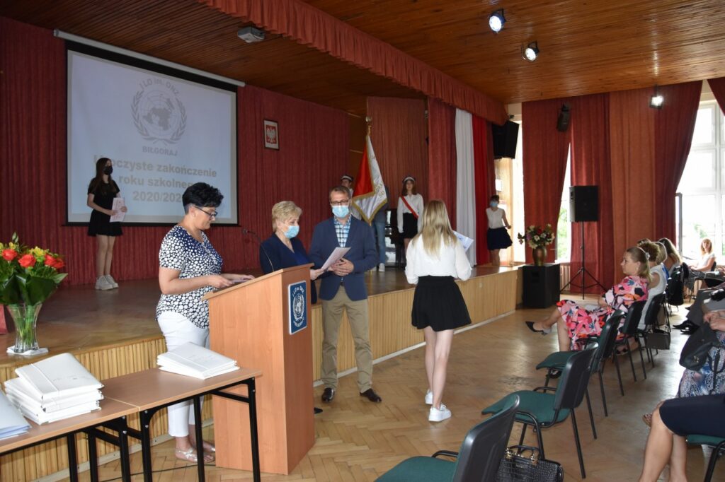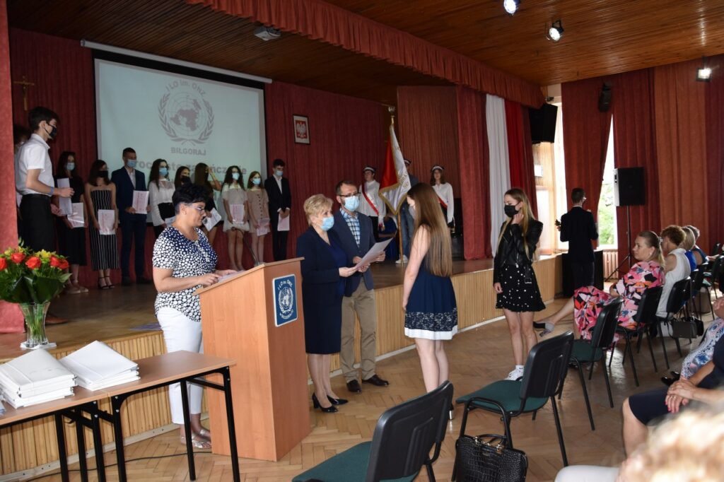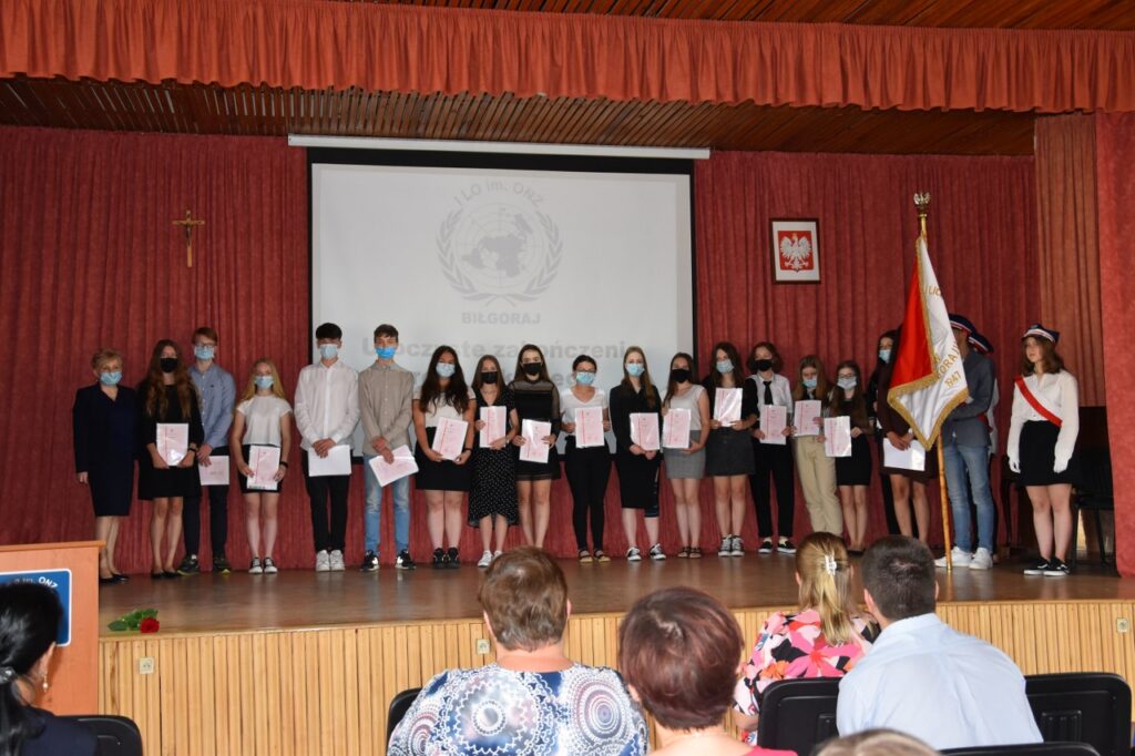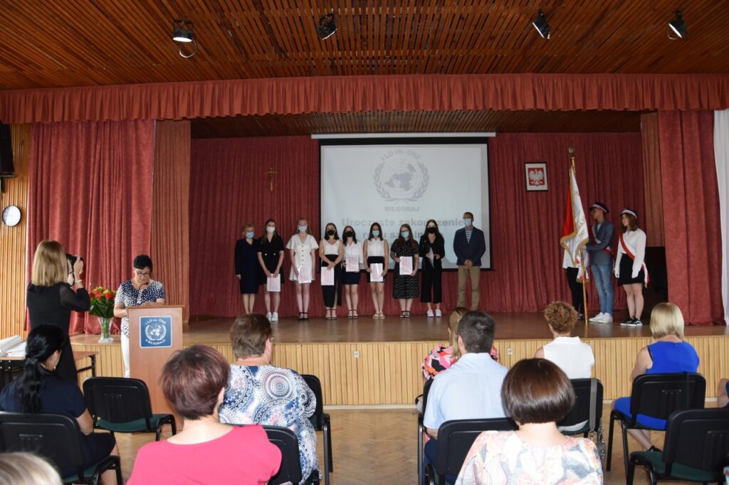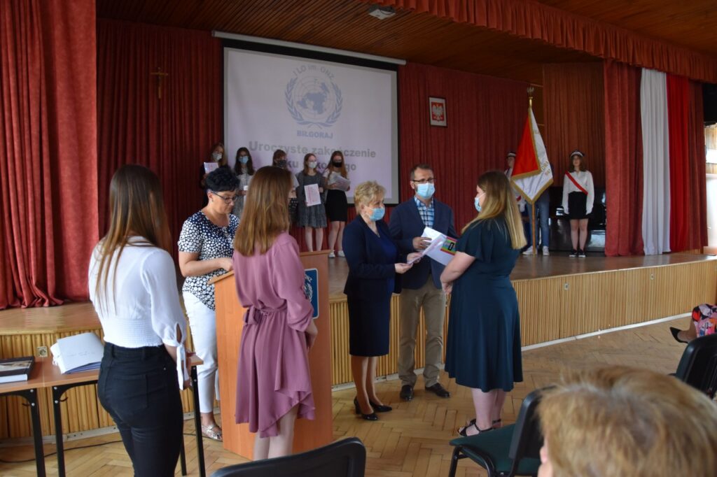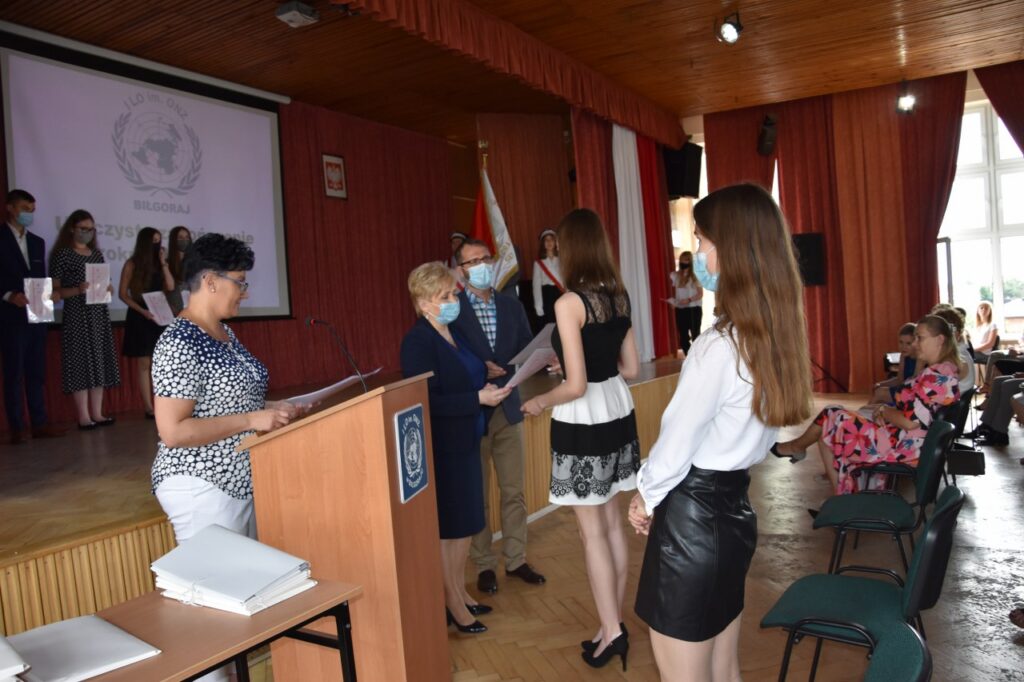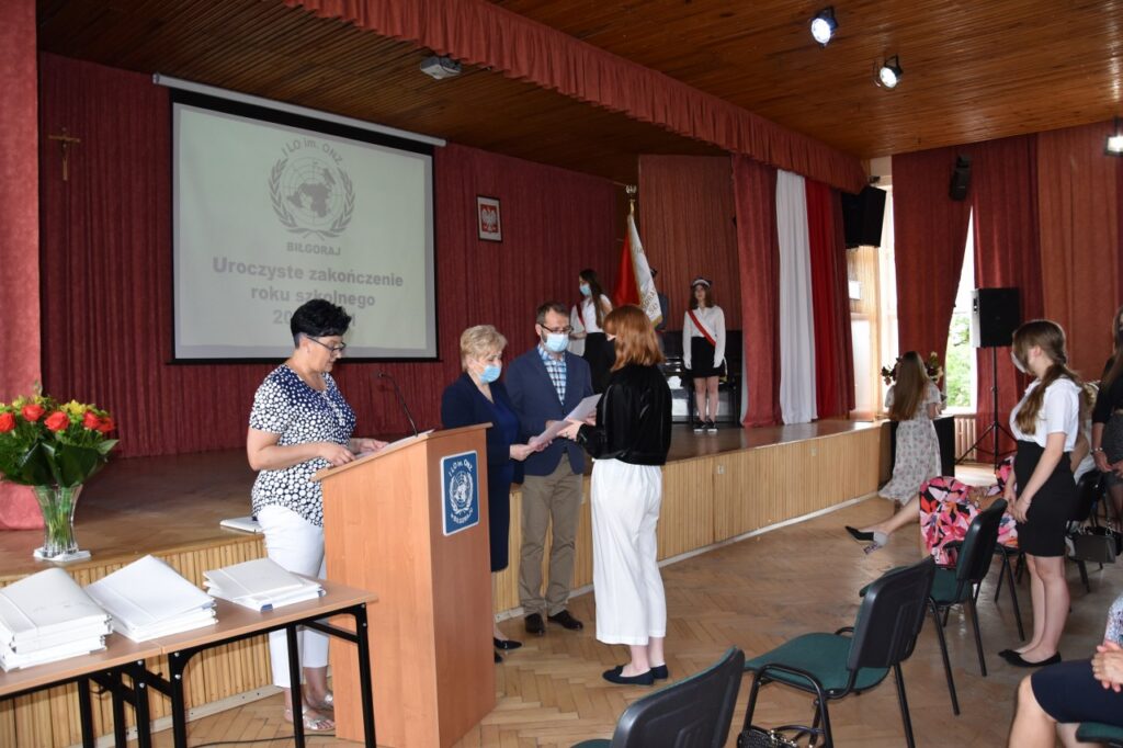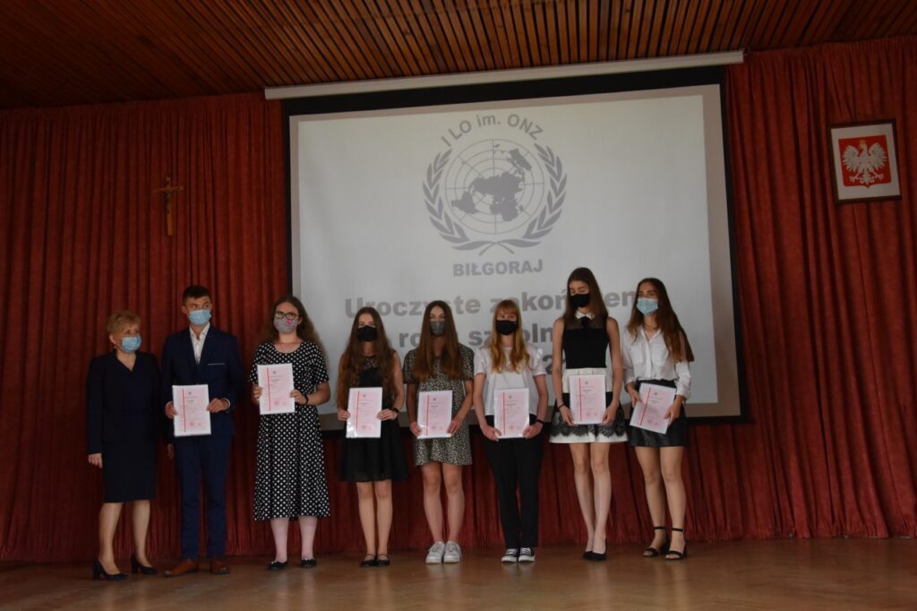 admin 5 lat temu Bez kategorii , Organizacyjne , Uroczystości25 czerwca 2021 roku odbyło się uroczyste zakończenie roku szkolnego. Ze względu na pandemię do auli szkoły zostali zaproszeni tylko ci uczniowie, którzy uzyskali najwyższe wyniki w nauce i 100% frekwencję. Najlepsi licealiści otrzymali świadectwa z czerwonym paskiem, Listy Gratulacyjne i karty podarunkowe. Dodatkową nagrodę przekazaną przez jedną z biłgorajskich firm otrzymał wyróżniający się uczeń szkoły – Piotr Łaba. Zostały również odczytane listy z podziękowaniami i życzeniami skierowane do dyrekcji, nauczycieli i uczniów przesłane przez Lubelskiego Kuratora Oświaty oraz Starostę Biłgorajskiego.