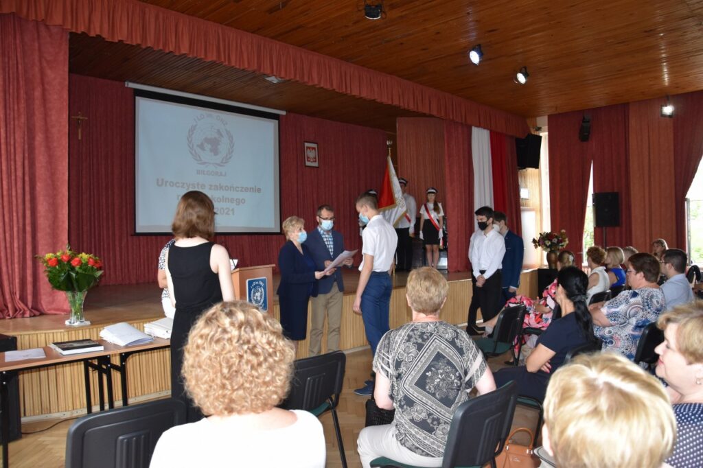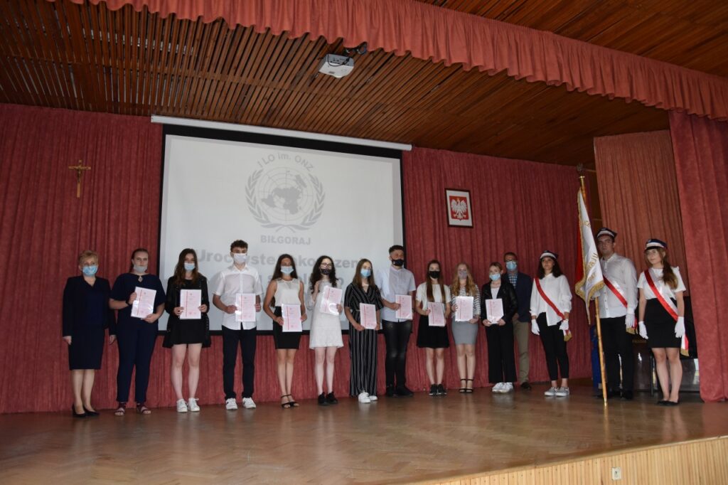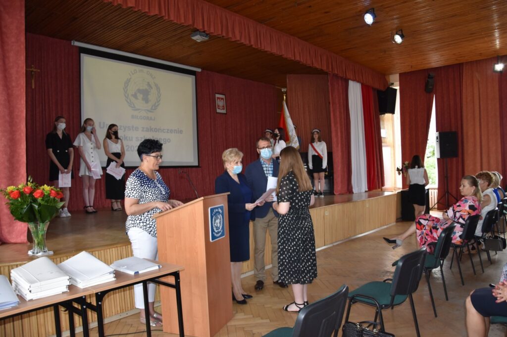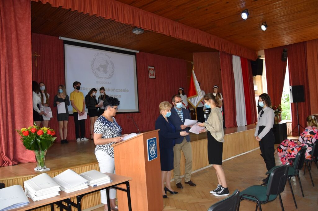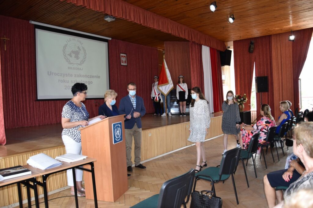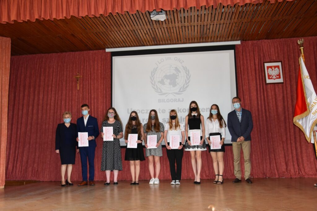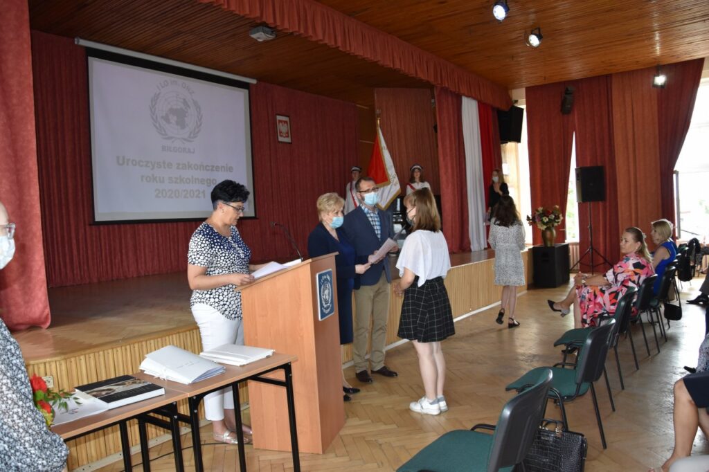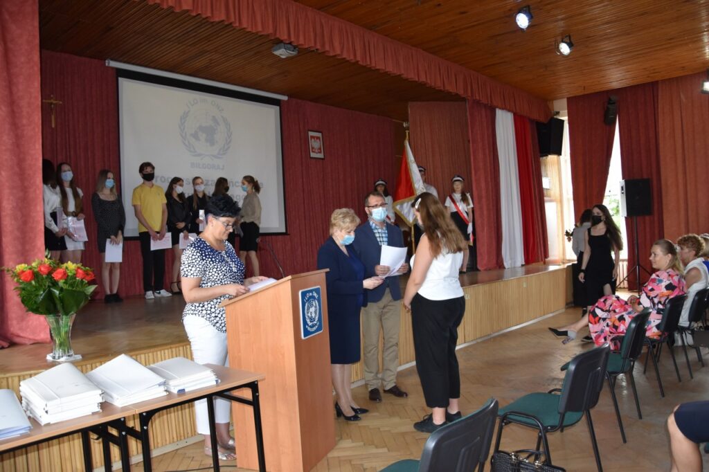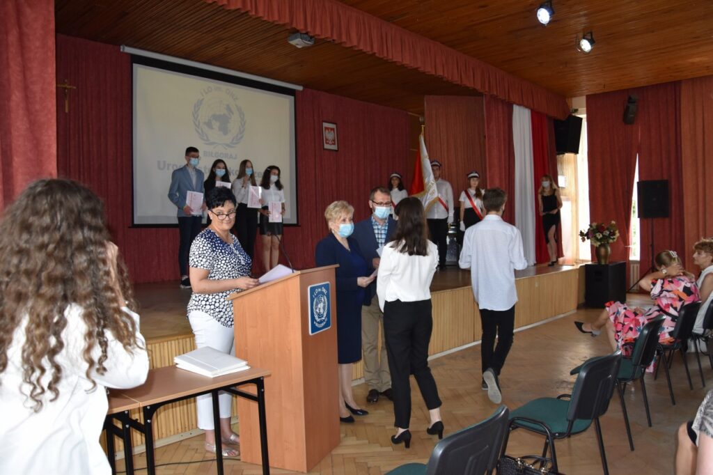 admin 5 lat temu Bez kategorii , Organizacyjne , Uroczystości25 czerwca 2021 roku odbyło się uroczyste zakończenie roku szkolnego. Ze względu na pandemię do auli szkoły zostali zaproszeni tylko ci uczniowie, którzy uzyskali najwyższe wyniki w nauce i 100% frekwencję. Najlepsi licealiści otrzymali świadectwa z czerwonym paskiem, Listy Gratulacyjne i karty podarunkowe. Dodatkową nagrodę przekazaną przez jedną z biłgorajskich firm otrzymał wyróżniający się uczeń szkoły – Piotr Łaba. Zostały również odczytane listy z podziękowaniami i życzeniami skierowane do dyrekcji, nauczycieli i uczniów przesłane przez Lubelskiego Kuratora Oświaty oraz Starostę Biłgorajskiego.