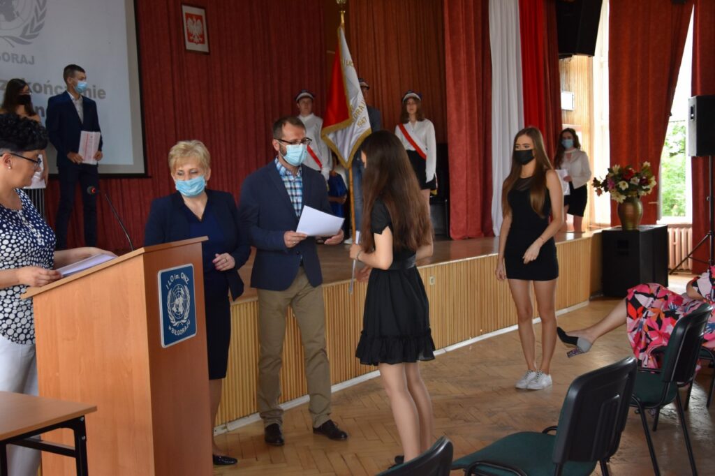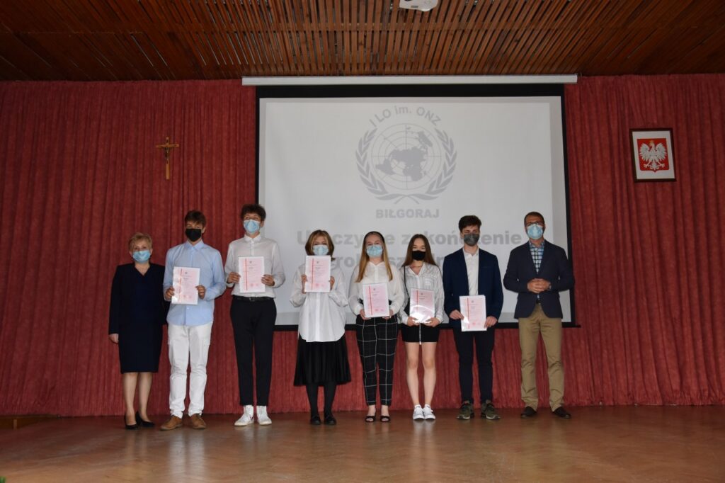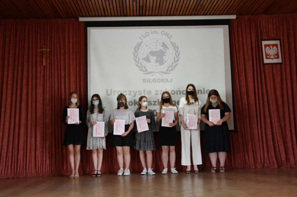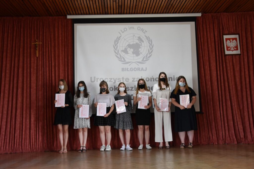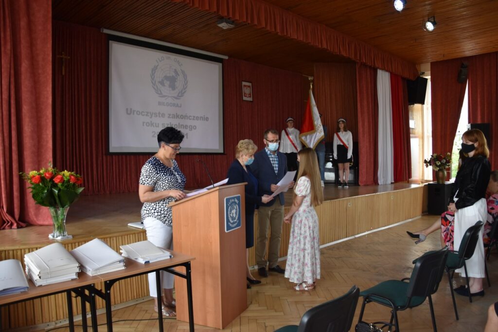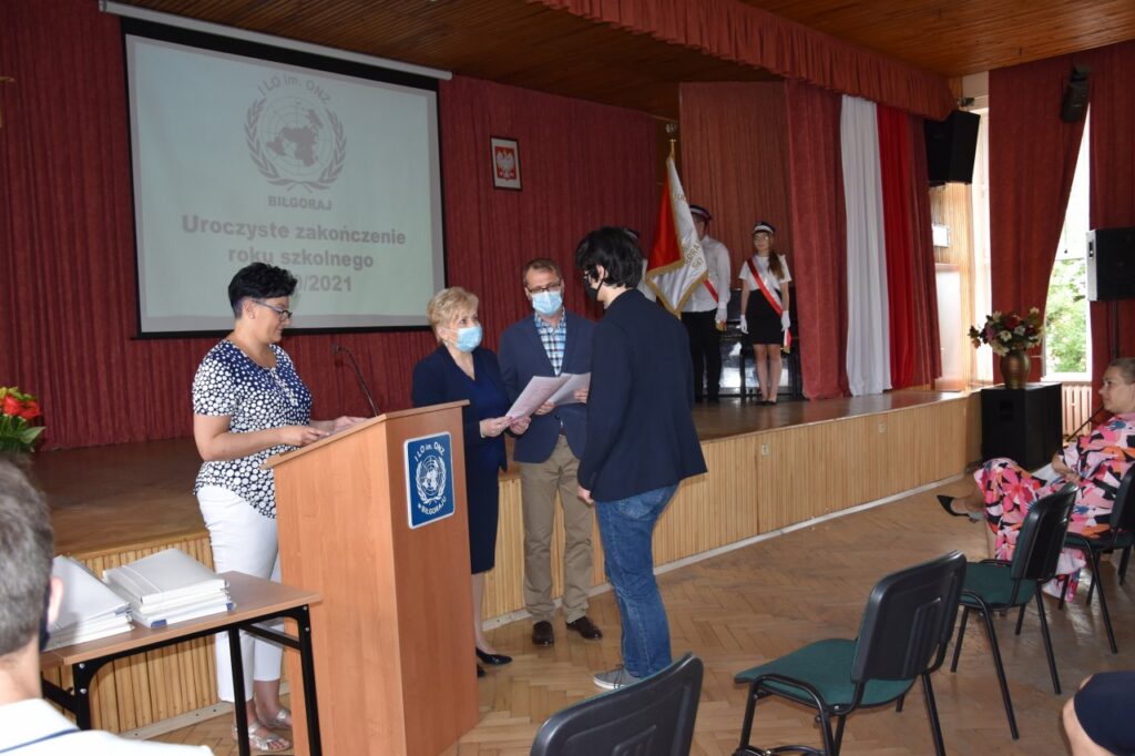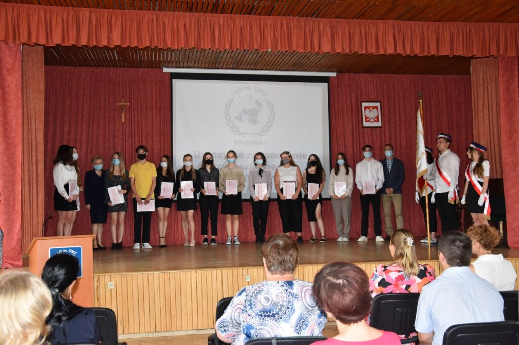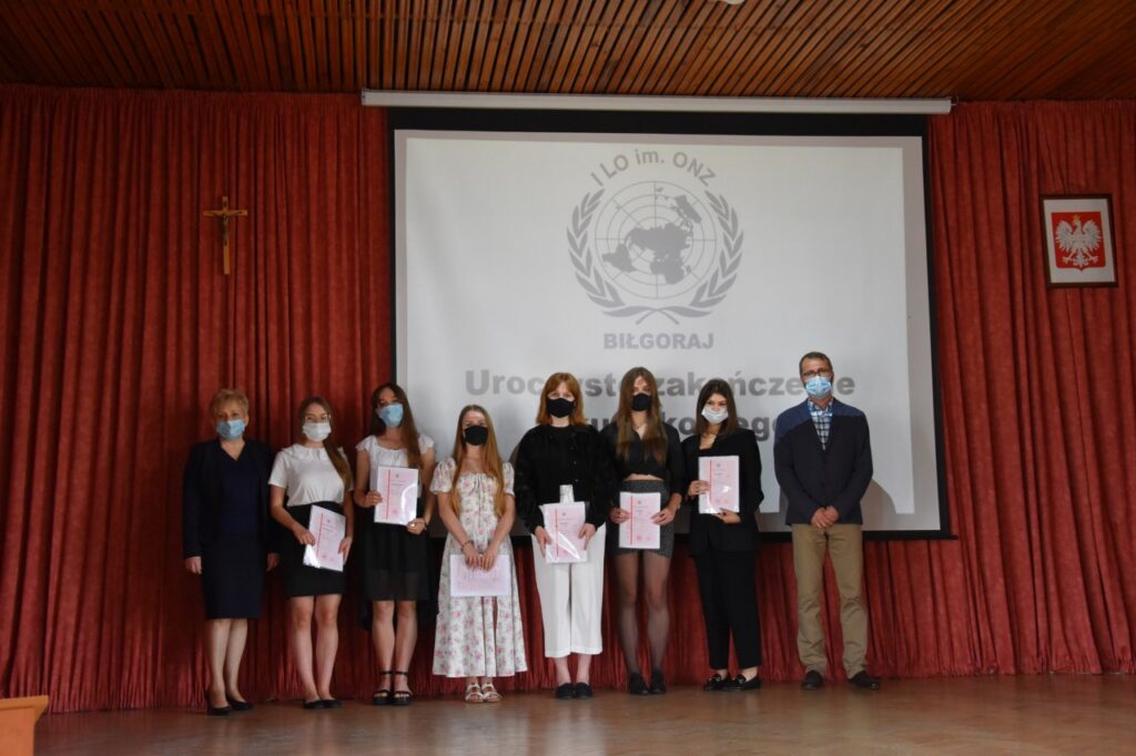 admin 5 lat temu Bez kategorii , Organizacyjne , Uroczystości25 czerwca 2021 roku odbyło się uroczyste zakończenie roku szkolnego. Ze względu na pandemię do auli szkoły zostali zaproszeni tylko ci uczniowie, którzy uzyskali najwyższe wyniki w nauce i 100% frekwencję. Najlepsi licealiści otrzymali świadectwa z czerwonym paskiem, Listy Gratulacyjne i karty podarunkowe. Dodatkową nagrodę przekazaną przez jedną z biłgorajskich firm otrzymał wyróżniający się uczeń szkoły – Piotr Łaba. Zostały również odczytane listy z podziękowaniami i życzeniami skierowane do dyrekcji, nauczycieli i uczniów przesłane przez Lubelskiego Kuratora Oświaty oraz Starostę Biłgorajskiego.