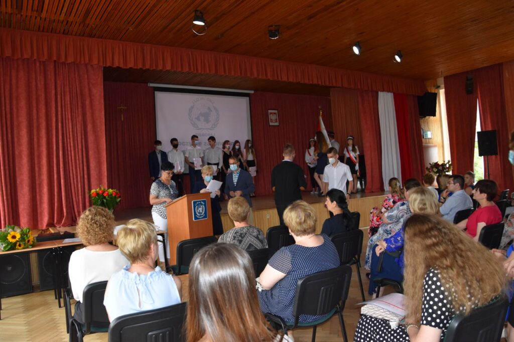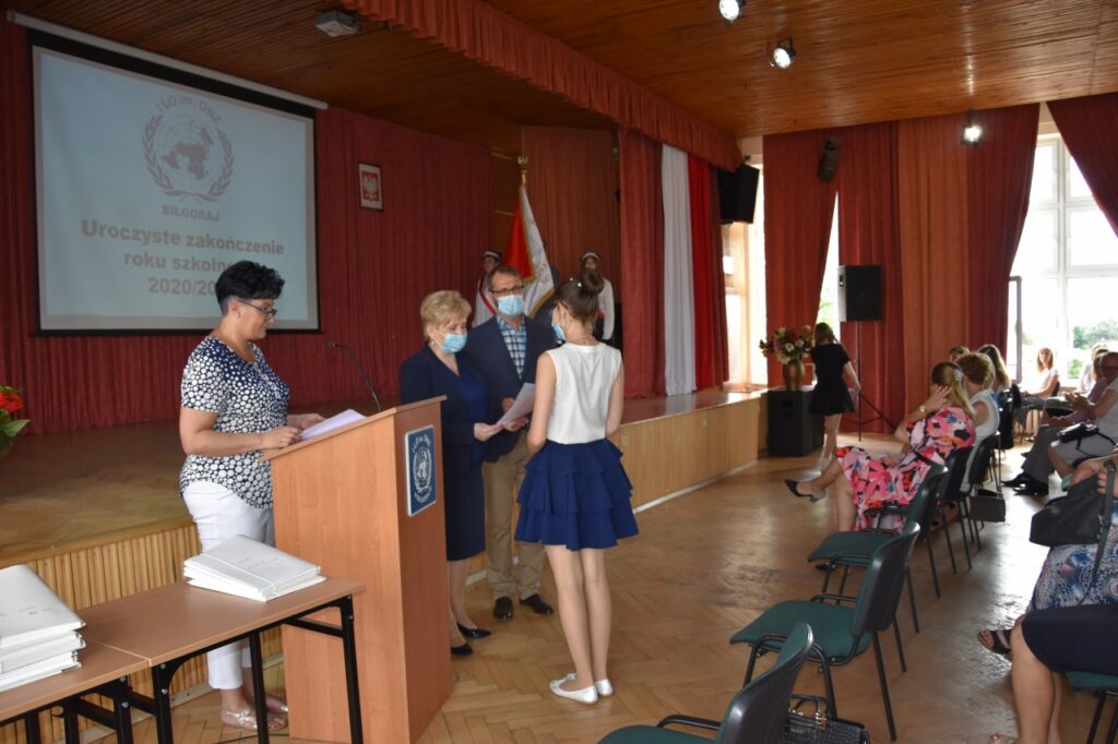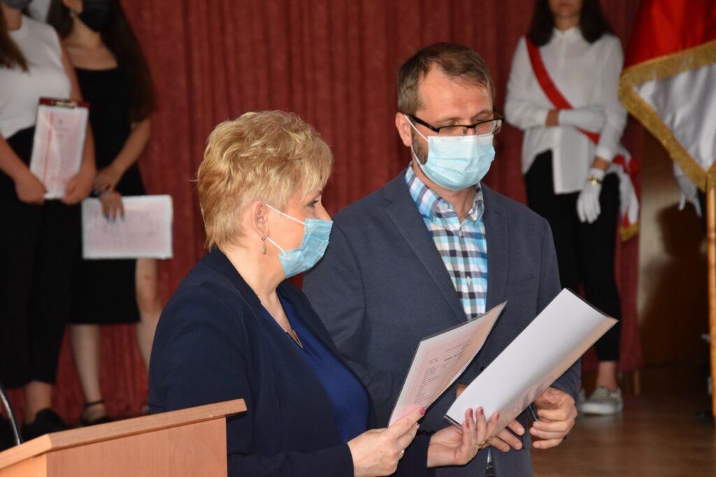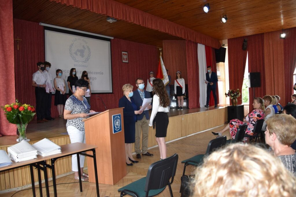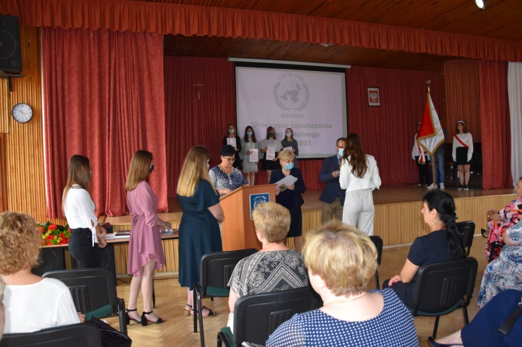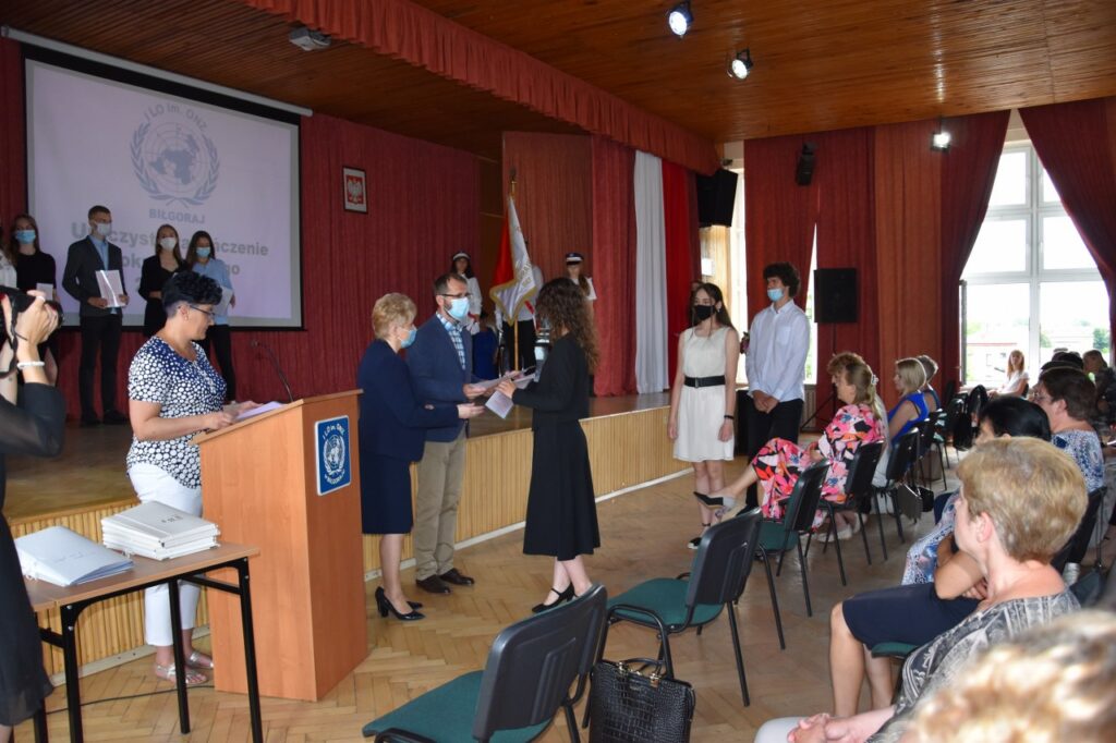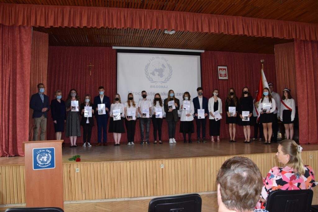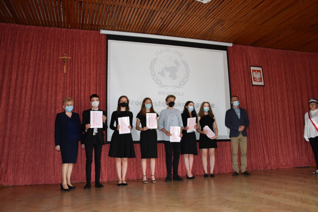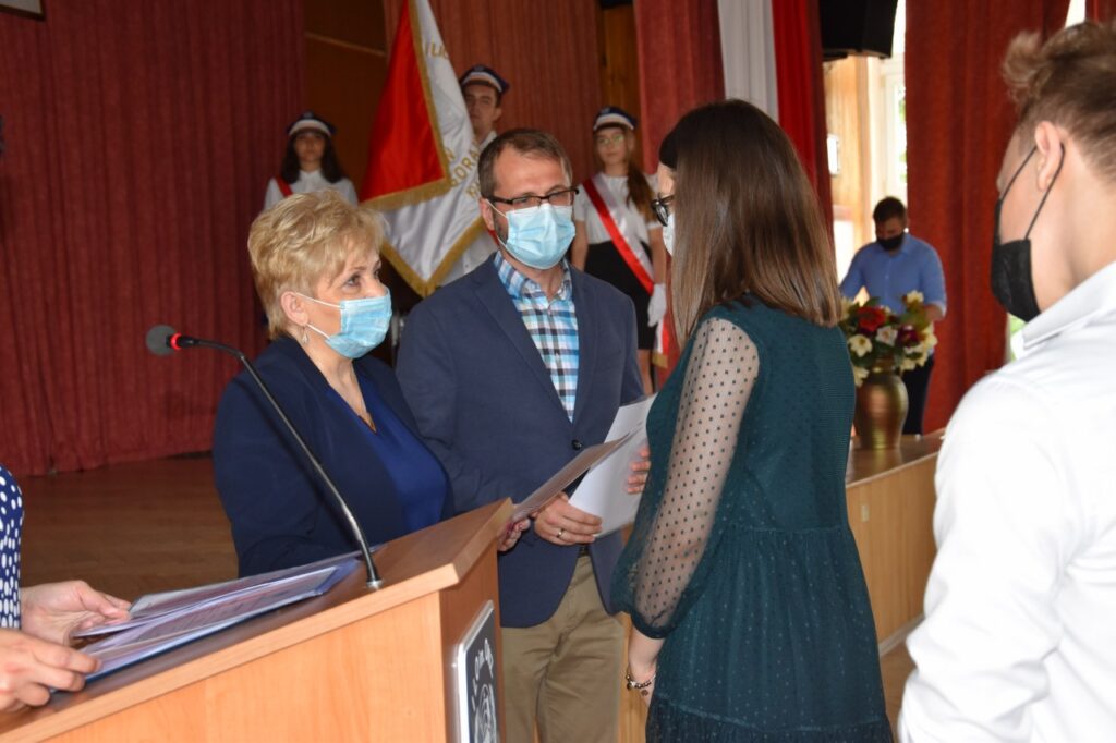 admin 5 lat temu Bez kategorii , Organizacyjne , Uroczystości25 czerwca 2021 roku odbyło się uroczyste zakończenie roku szkolnego. Ze względu na pandemię do auli szkoły zostali zaproszeni tylko ci uczniowie, którzy uzyskali najwyższe wyniki w nauce i 100% frekwencję. Najlepsi licealiści otrzymali świadectwa z czerwonym paskiem, Listy Gratulacyjne i karty podarunkowe. Dodatkową nagrodę przekazaną przez jedną z biłgorajskich firm otrzymał wyróżniający się uczeń szkoły – Piotr Łaba. Zostały również odczytane listy z podziękowaniami i życzeniami skierowane do dyrekcji, nauczycieli i uczniów przesłane przez Lubelskiego Kuratora Oświaty oraz Starostę Biłgorajskiego.