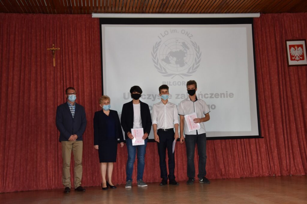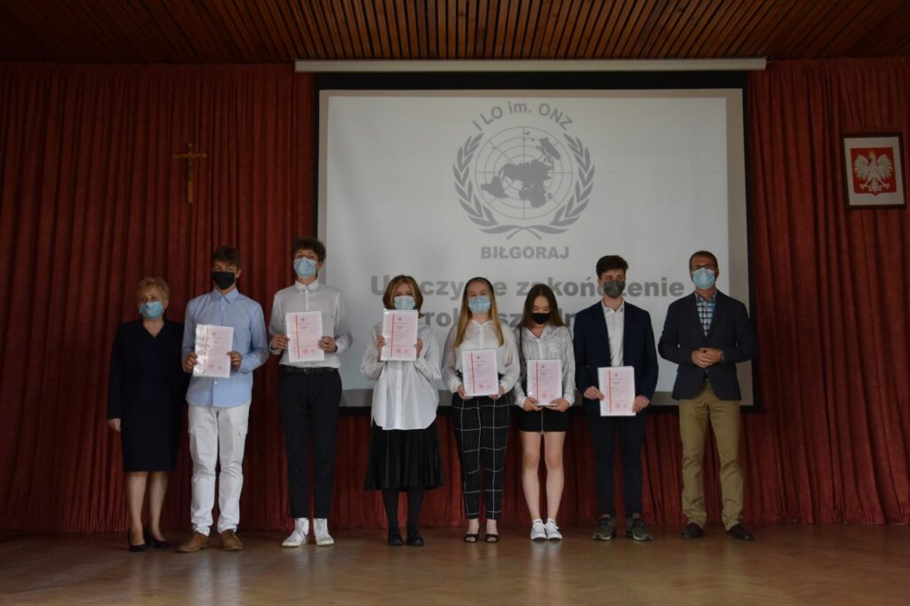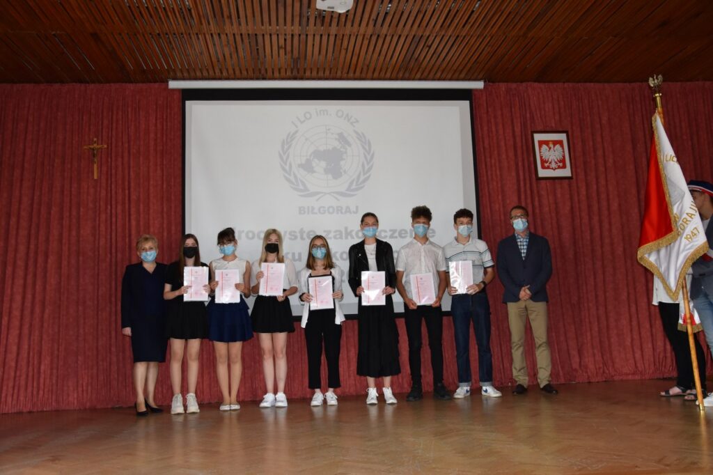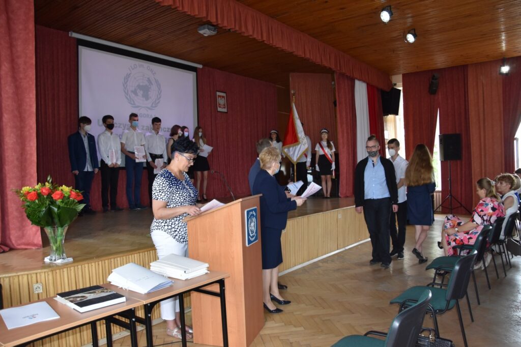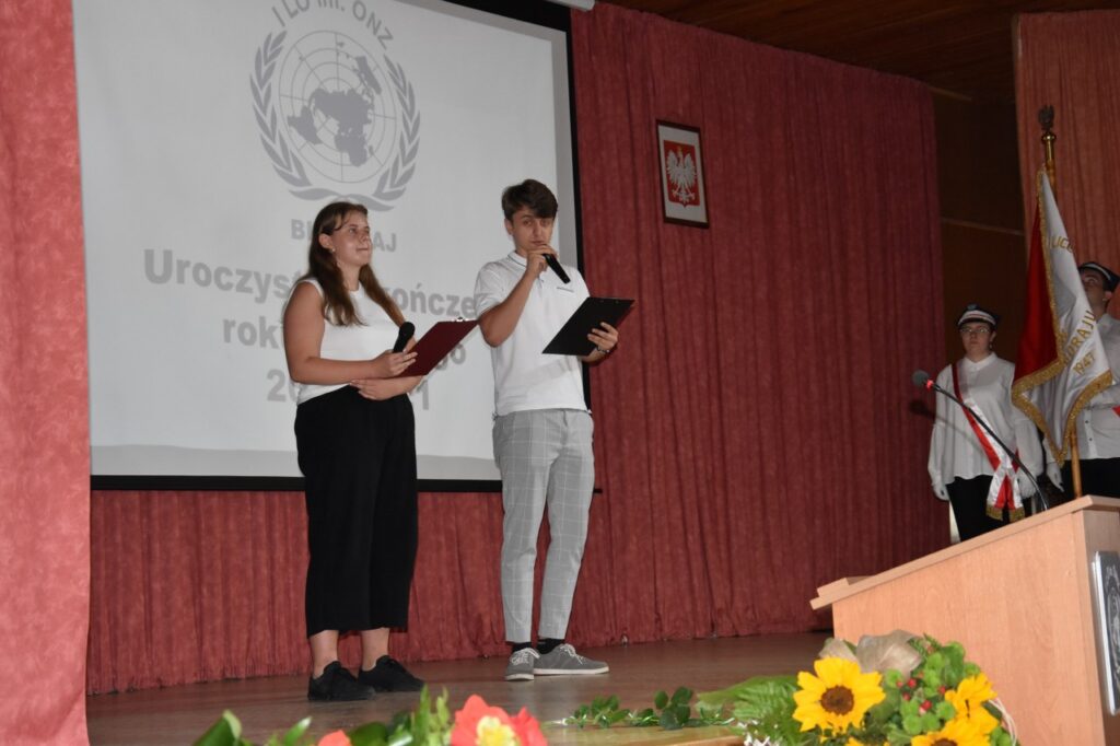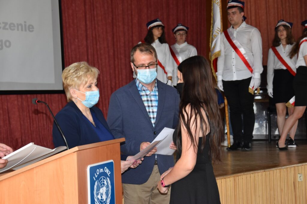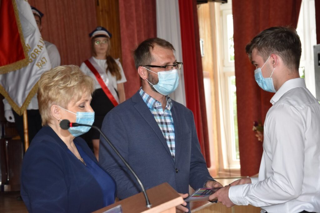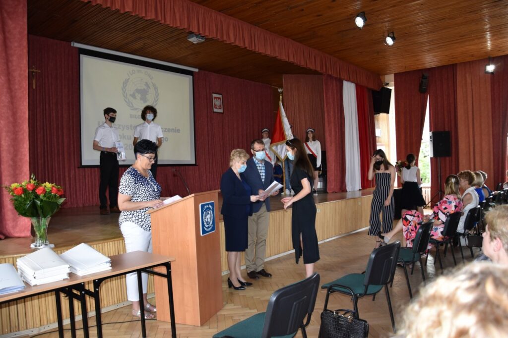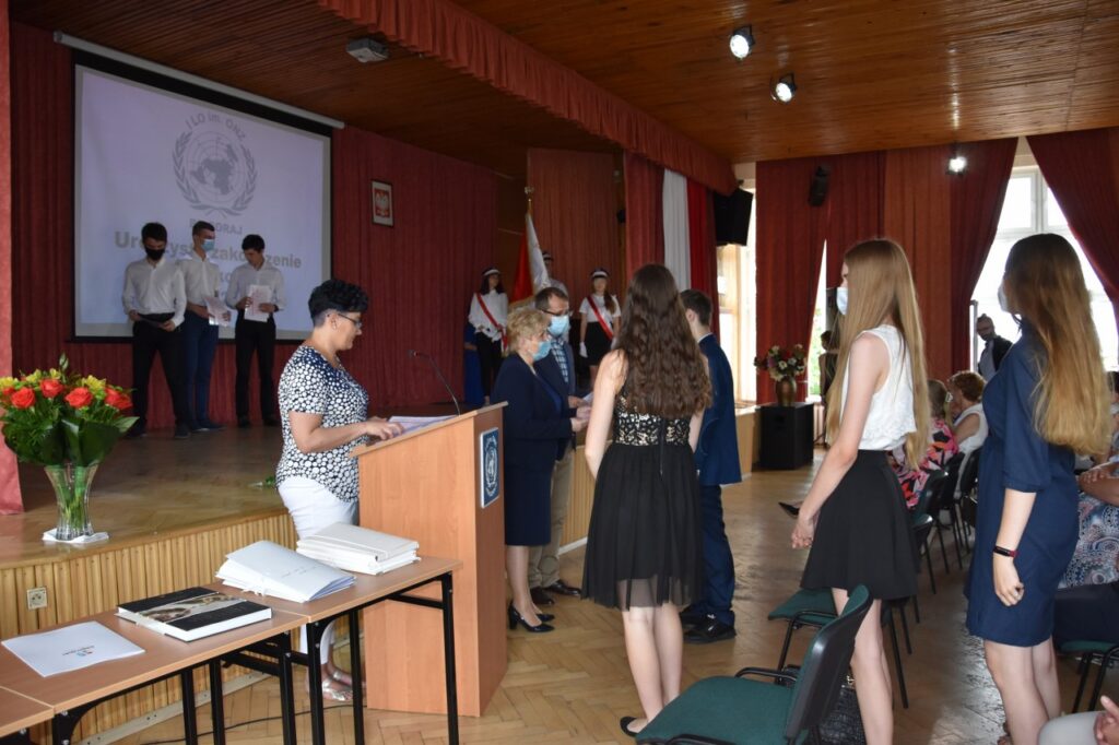 admin 5 lat temu Bez kategorii , Organizacyjne , Uroczystości25 czerwca 2021 roku odbyło się uroczyste zakończenie roku szkolnego. Ze względu na pandemię do auli szkoły zostali zaproszeni tylko ci uczniowie, którzy uzyskali najwyższe wyniki w nauce i 100% frekwencję. Najlepsi licealiści otrzymali świadectwa z czerwonym paskiem, Listy Gratulacyjne i karty podarunkowe. Dodatkową nagrodę przekazaną przez jedną z biłgorajskich firm otrzymał wyróżniający się uczeń szkoły – Piotr Łaba. Zostały również odczytane listy z podziękowaniami i życzeniami skierowane do dyrekcji, nauczycieli i uczniów przesłane przez Lubelskiego Kuratora Oświaty oraz Starostę Biłgorajskiego.