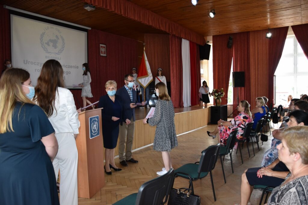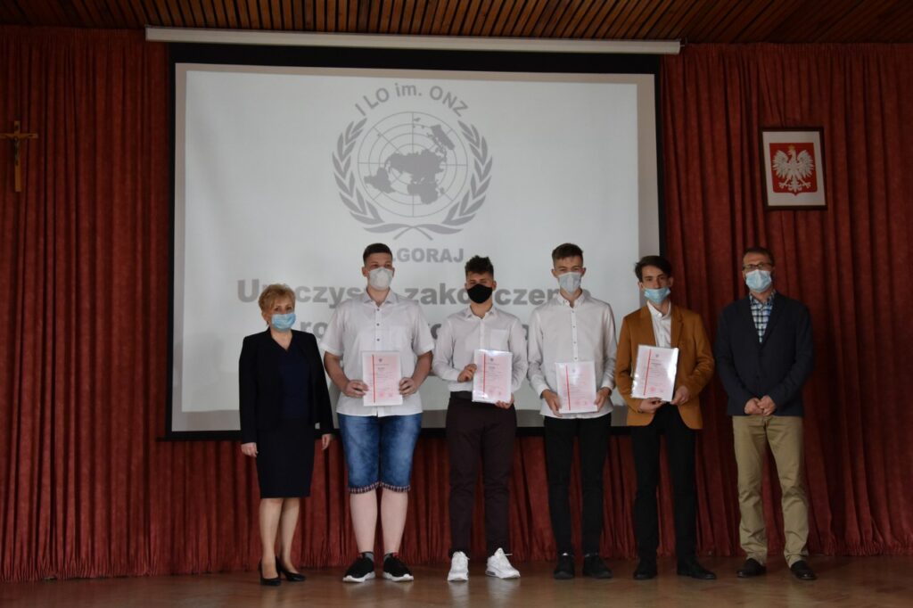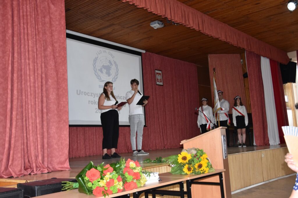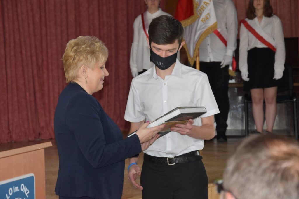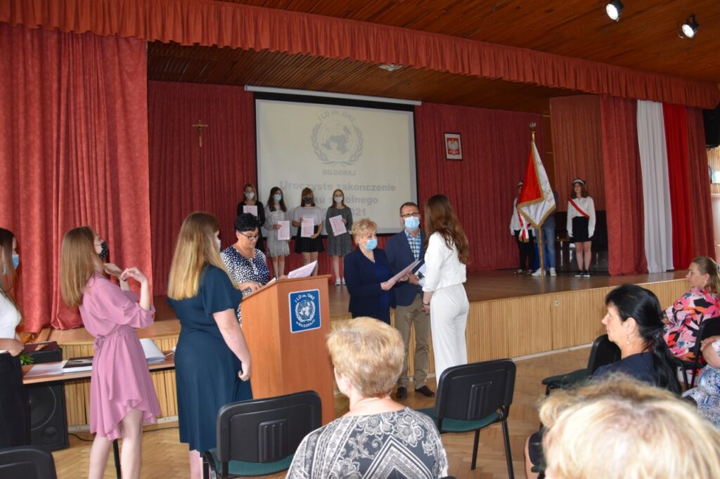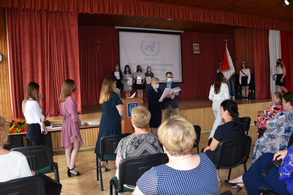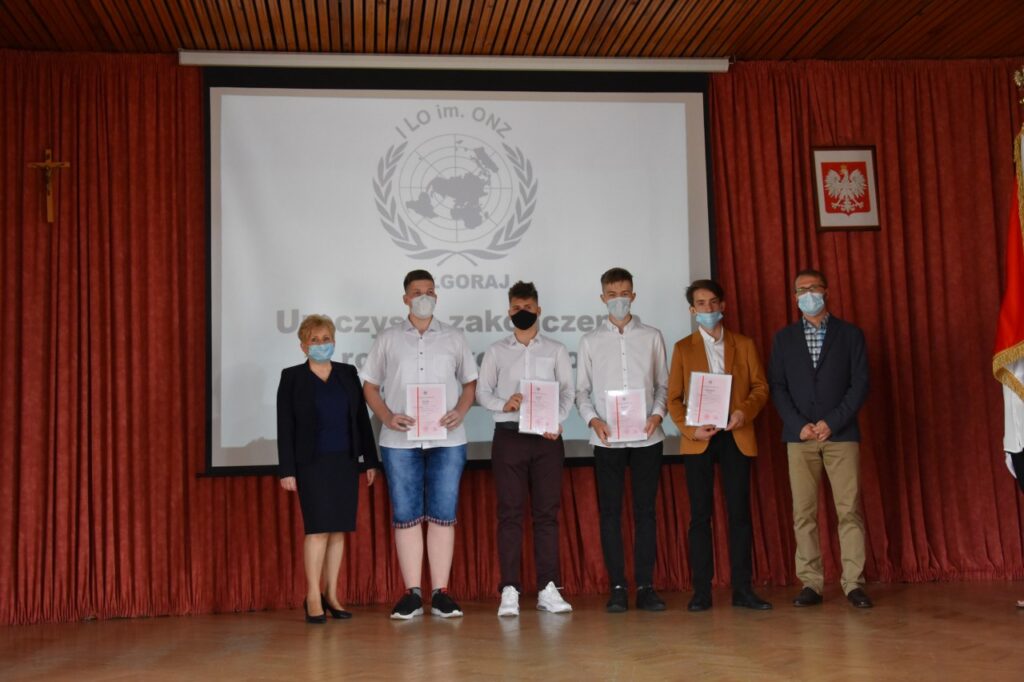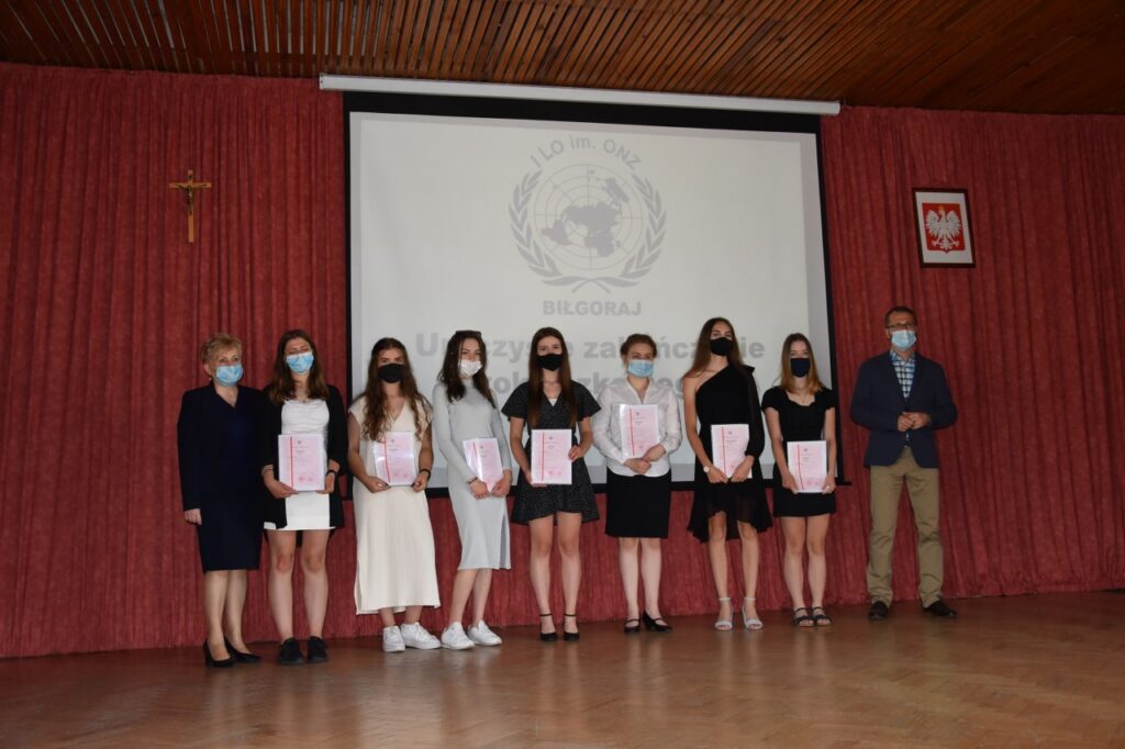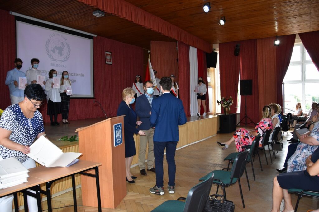 admin 5 lat temu Bez kategorii , Organizacyjne , Uroczystości25 czerwca 2021 roku odbyło się uroczyste zakończenie roku szkolnego. Ze względu na pandemię do auli szkoły zostali zaproszeni tylko ci uczniowie, którzy uzyskali najwyższe wyniki w nauce i 100% frekwencję. Najlepsi licealiści otrzymali świadectwa z czerwonym paskiem, Listy Gratulacyjne i karty podarunkowe. Dodatkową nagrodę przekazaną przez jedną z biłgorajskich firm otrzymał wyróżniający się uczeń szkoły – Piotr Łaba. Zostały również odczytane listy z podziękowaniami i życzeniami skierowane do dyrekcji, nauczycieli i uczniów przesłane przez Lubelskiego Kuratora Oświaty oraz Starostę Biłgorajskiego.