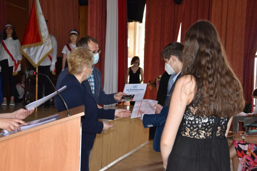 Na zakończenie uroczystości pani Dyrektor Jolanta Rycyk pogratulowała wyróżnionym, podziękowała nauczycielom za pracę w tym bardzo trudnym roku szkolnym i życzyła wszystkim zdrowych oraz bezpiecznych wakacji. Podziękowania i życzenia w imieniu rodziców złożył również Przewodniczący Rady Rodziców – pan Jarosław Świtała oraz przedstawiciele Rady Samorządu Uczniowskiego.
