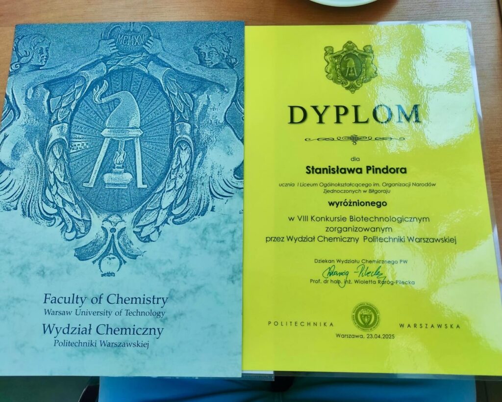 Stanisław Pindor z kl. I E zdobył tytuł finalisty 8. edycji Konkursu Biotechnologicznego, który odbył się 5 kwietnia 2025 roku na Wydziale Chemicznym Politechniki Warszawskiej. Spośród 20 najlepszych uczniów szkół średnich rywalizujących w finale wyłoniono dziesięciu finalistów oraz trzech laureatów.​Konkurs dotyczył podstawowych zagadnień biotechnologii molekularnej: biosensorów, terapii genowych, inżynierii genetycznej, metod walki z mikroplastikiem, bio-informatyki, mikrofluidyki, syntezy peptydów, wirusologii i klonowania genów. Konkurs składał się z dwóch etapów. Pierwszy polegał na wykonaniu i przesłaniu zastawu zadań opublikowanych na stronie konkursu. Drugi etap (finałowy) zweryfikował wiedzę autorów 20 najlepszych prac z pierwszego etapu w formie 3-godzinnego testu na Wydziale Technologii Chemicznej Politechniki Warszawskiej.​