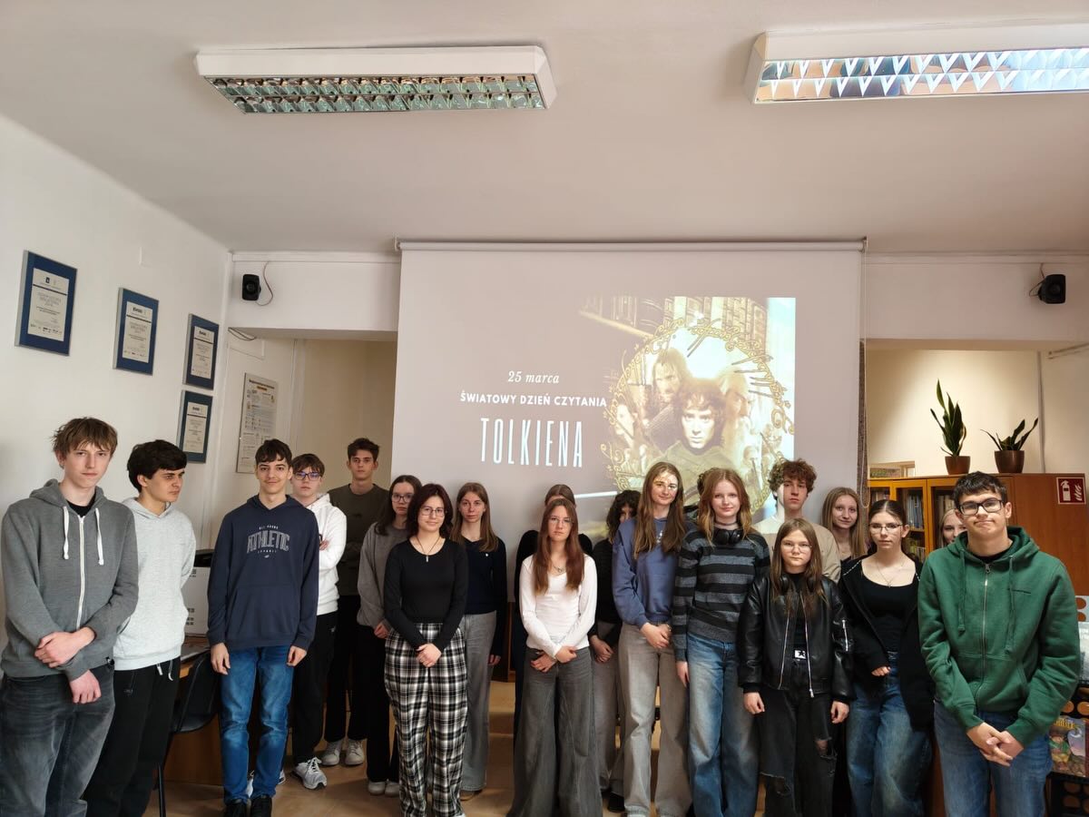admin 6 dni temu Konkursy , Organizacyjne25 marca 2026 roku w czytelni biblioteki szkolnej licealiści wzięli udział w obchodach Światowego Dnia Czytania Tolkiena. Zanim przystąpili do słuchania i czytania fragmentów utworów Johna Ronalda Reuela Tolkiena, zostali zapoznani z informacjami biograficznymi jednego z najważniejszych autorów fantasy XX wieku. Angielski pisarz jest na całym świecie znany miłośnikom literatury dzięki m. in. powieściom pt. „Hobbit, czyli tam i z powrotem” czy „Władca Pierścieni”, wykorzystującym skandynawskie mity i staroangielskie legendy. Fantastyczny świat Tolkiena zdobył uznanie milionów czytelników, a dla ludzi sztuki stał się niewyczerpanym źródłem inspiracji.
