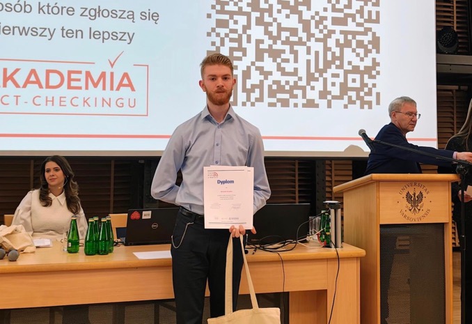 admin 1 tydzień temu Konkursy , Organizacyjne , OsiągnięciaZ przyjemnością informujemy, że Michał Ksiądz z klasy IV A wziął udział w etapie centralnym XII Olimpiady Wiedzy o Mediach, który odbył się w dniach 20–21.03.2026 r. na Uniwersytecie Warszawskim.To duże osiągnięcie, ponieważ do finału kwalifikują się najlepsi uczestnicy z całej Polski, wykazujący się szeroką wiedzą z zakresu mediów, komunikacji społecznej oraz współczesnych środków przekazu, a także dowód jego rozległej wiedzy, zaangażowania i pasji do tematyki medialnej.Pierwszego dnia uczestnicy przystąpili do testu finałowego, a następnie wzięli udział w spotkaniach: z Mariuszem Szczygłem — dziennikarzem, reporterem i pisarzem, laureatem Nagrody Literackiej Nike 2019 oraz Sławomirem Matczakiem — dyrektorem Akademii Telewizyjnej TVP i członkiem Rady Etyki Mediów. Drugiego dnia odbyła się część ustna Olimpiady, po której ogłoszono końcowe wyniki oraz wręczono nagrody i dyplomy.Warto dodać, że Michał, jako uczestnik etapu centralnego OWM, otrzymał możliwość rozwijania wiedzy i umiejętności dziennikarskich, ponieważ został zakwalifikowany do Akademii Fact-checkingu – projektu edukacyjnego Stowarzyszenia Demagog – najstarszej w Polsce organizacji fact-checkingowej.