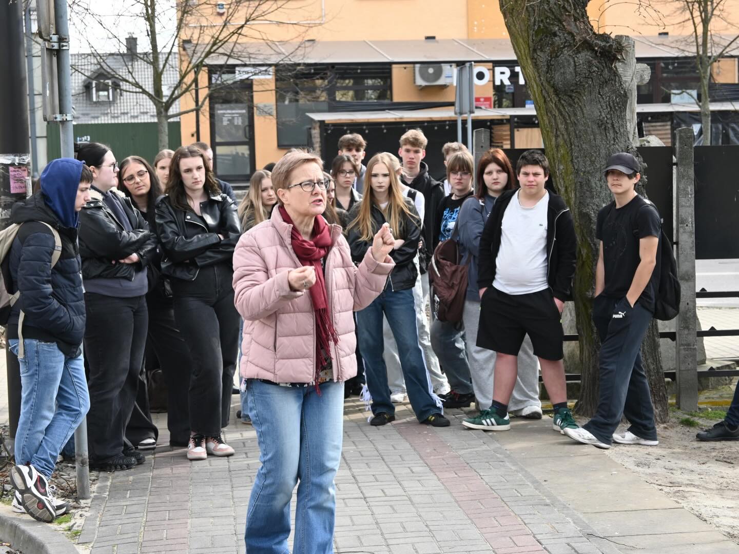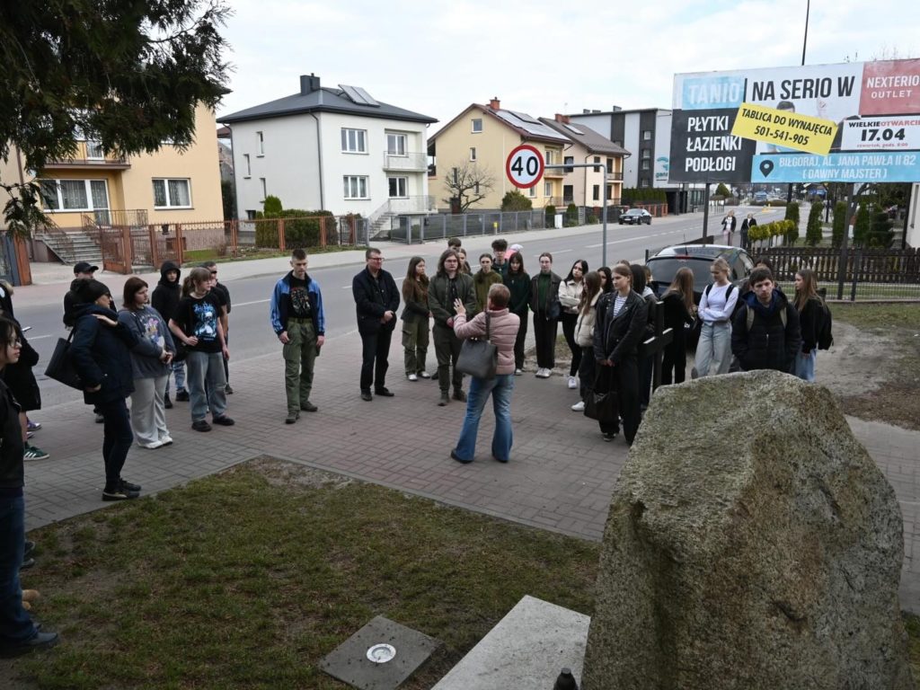 24 marca 2026 roku uczniowie klasy III E uczestniczyli w niezwykłej lekcji historii. Z okazji Narodowego Dnia Pamięci Polaków Ratujących Żydów wybrali się na spacer po Biłgoraju śladami rodziny Trzcińskich. Podczas plenerowych zajęć poznali tragiczne losy małżeństwa Pawła i Wisławy, mieszkańców Biłgoraja zamordowanych za udzielenie schronienia dwóm żydowskim rodzinom podczas II wojny światowej. O okupacyjnej historii opowiedziała młodzieży pani dr Dorota Skakuj z Muzeum Ziemi Biłgorajskiej. Ta wyjątkowa lekcja była okazją do refleksji nad losami bohaterskich Polaków, którzy, wykazując się niezwykłą odwagą i solidarnością, nieśli pomoc prześladowanym Żydom w czasie II wojny światowej.