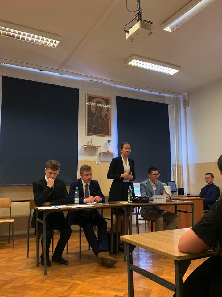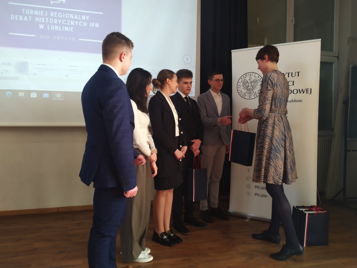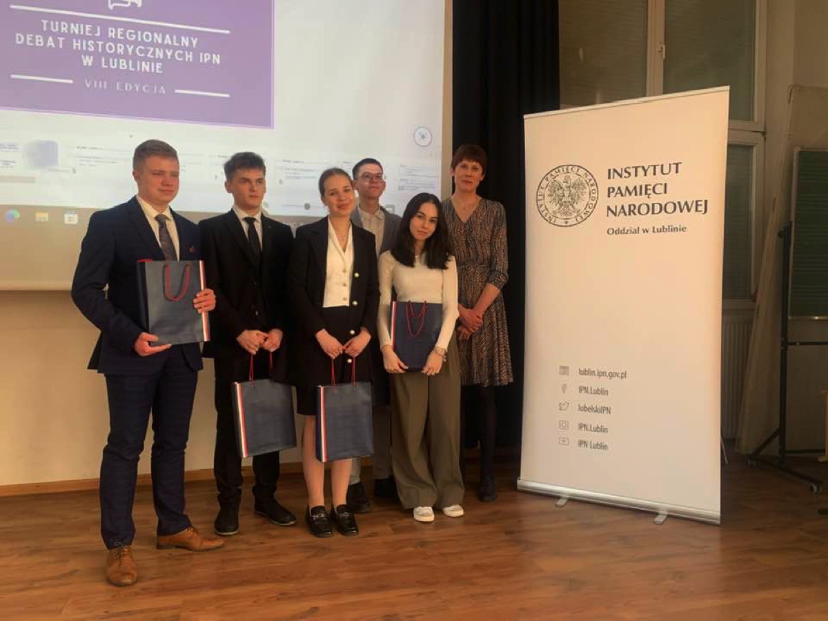 admin 3 lata temu Konkursy , Organizacyjne , OsiągnięciaSukcesem dla naszej drużyny zakończył się regionalny Turniej Debat Historycznych Instytutu Pamięci Narodowej. Po bardzo zaciętej rywalizacji licealiści dotarli do półfinału. W etapie grupowym nasz zespół uzyskał najlepszy wynik punktowy ze wszystkich drużyn biorących udział w turnieju, w półfinale jednak nasi przegrali niewielką liczbą punktów 214:217 z zespołem z Lubartowa. Skład naszej drużyny: Laura Karpik (kl. II D), Maciej Bukarewicz, Miłosz Stelmach (kl. III D) oraz Maciej Oleszczuk (kl. III E). Uczestnikiem rezerwowym była Natalia Pawełko (kl. III D), a w przygotowaniach do turnieju pomagała Marta Myszka (kl. III D).