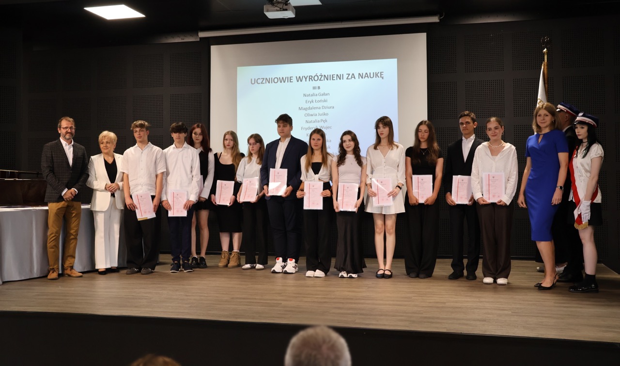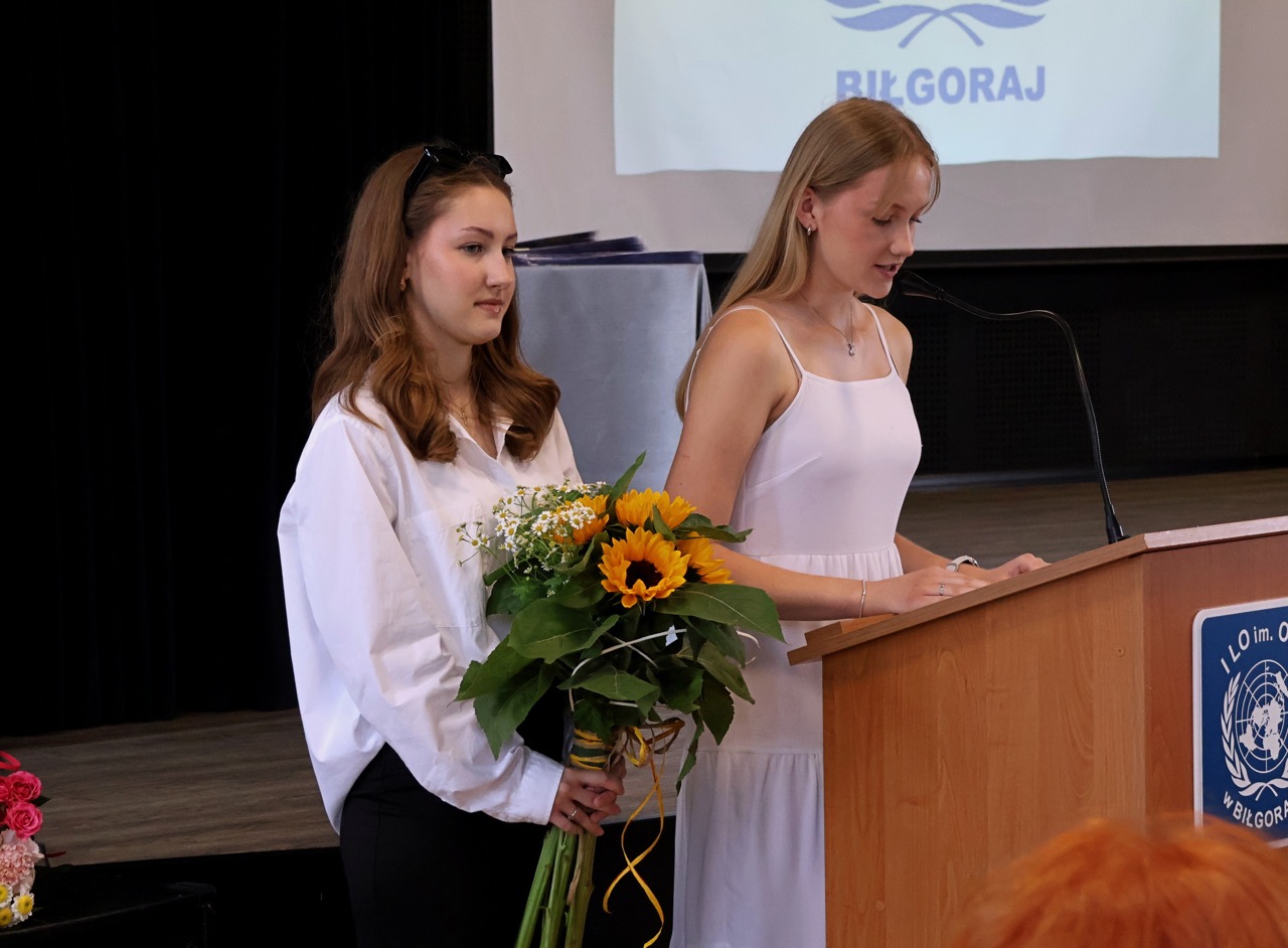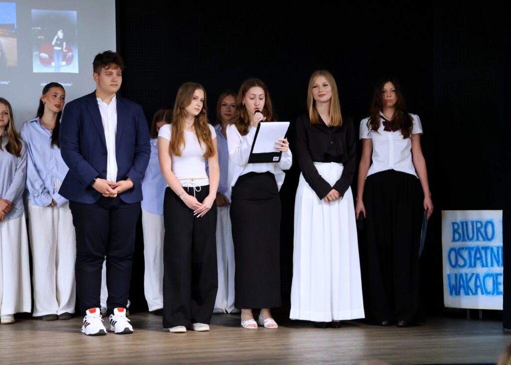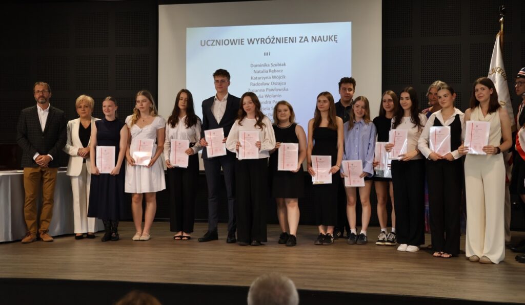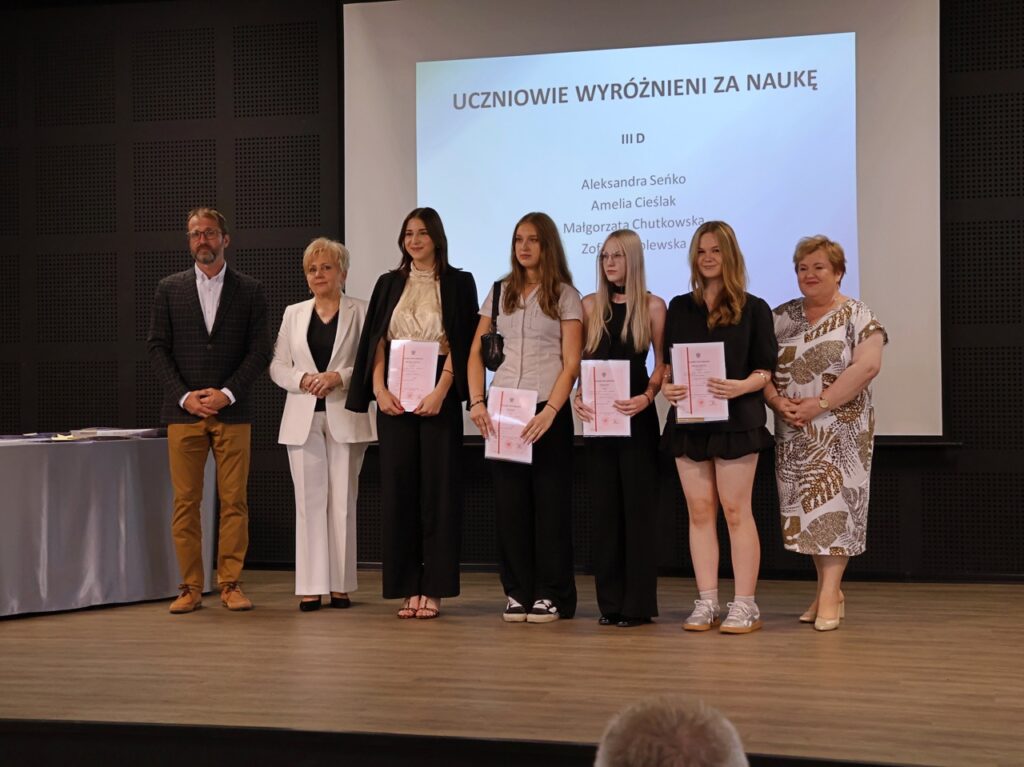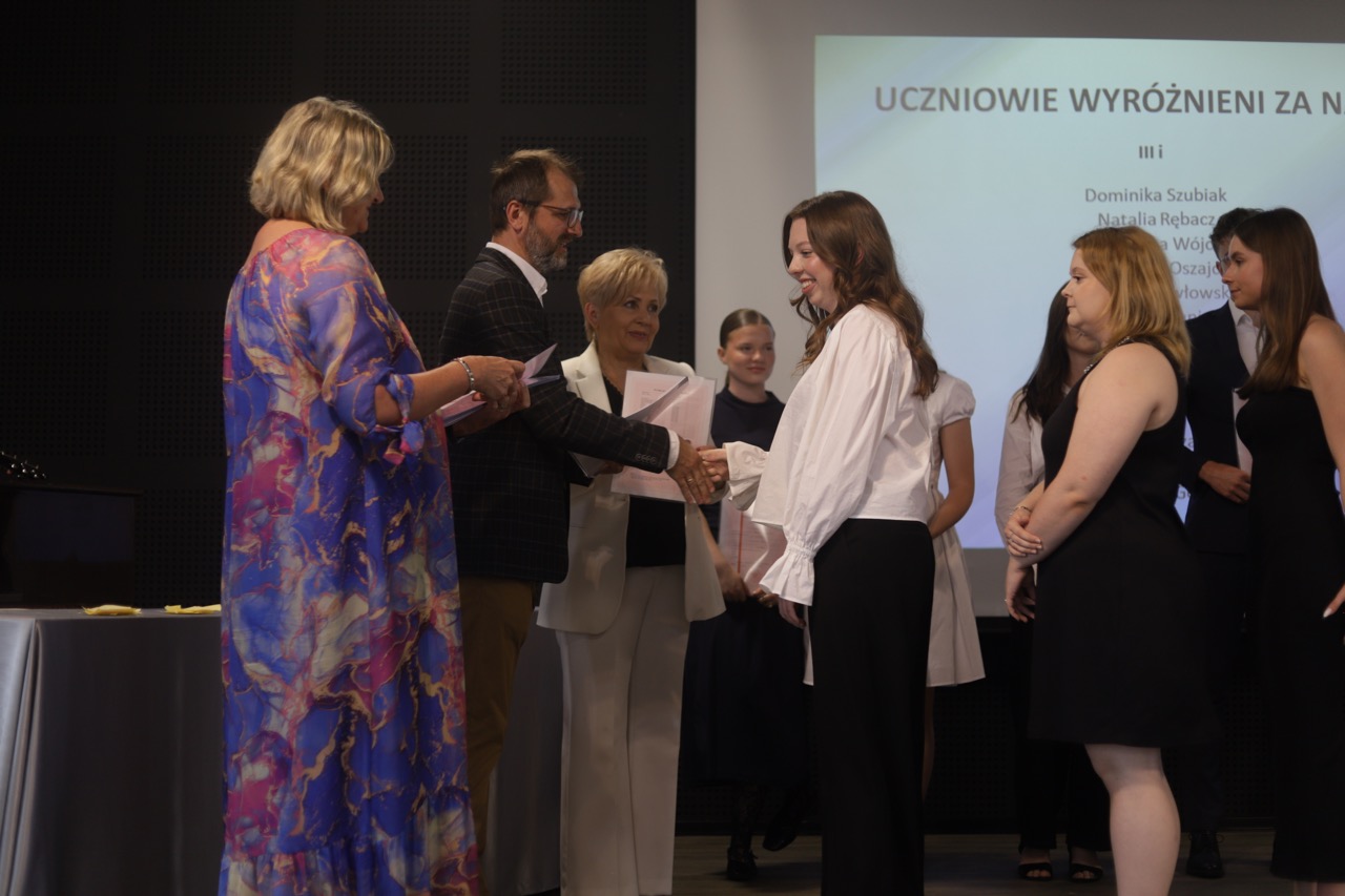 admin 9 miesięcy temu Organizacyjne , Uroczystości27 czerwca w auli obchodziliśmy uroczystość zakończenia roku szkolnego 2024/2025. Z tej okazji swoją obecnością zaszczycili nas goście: Starosta Biłgorajski Andrzej Szarlip oraz Przewodniczący Rady Rodziców Jarosław Świtała. Tegoroczną uroczystość rozpoczęła wzruszająca chwila – pożegnanie nauczycieli odchodzących na emeryturę. Dyrektor Jolanta Rycyk podziękowała panu Wojciechowi Krawcowi, panu Krzysztofowi Litwiniukowi i pani Jolancie Tor za wszystkie lata pracy, życzliwość, zaangażowanie i trud włożony w wychowanie wielu pokoleń młodzieży oraz oddanie sprawom szkoły, młodzież wręczyła kwiaty, a wszyscy zebrani wyrazili wdzięczność gromkimi brawami.