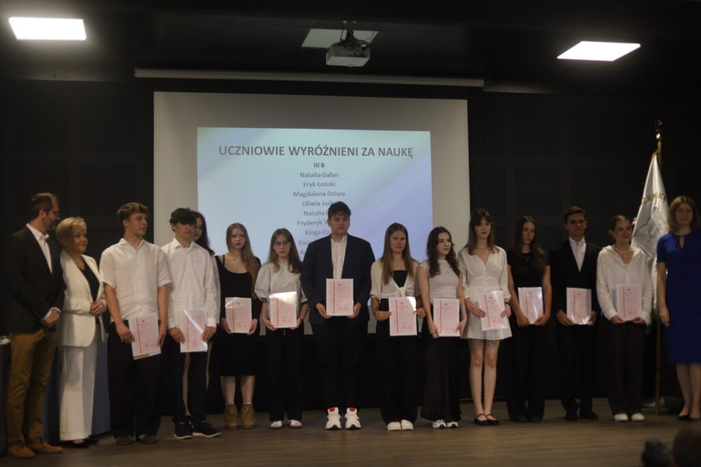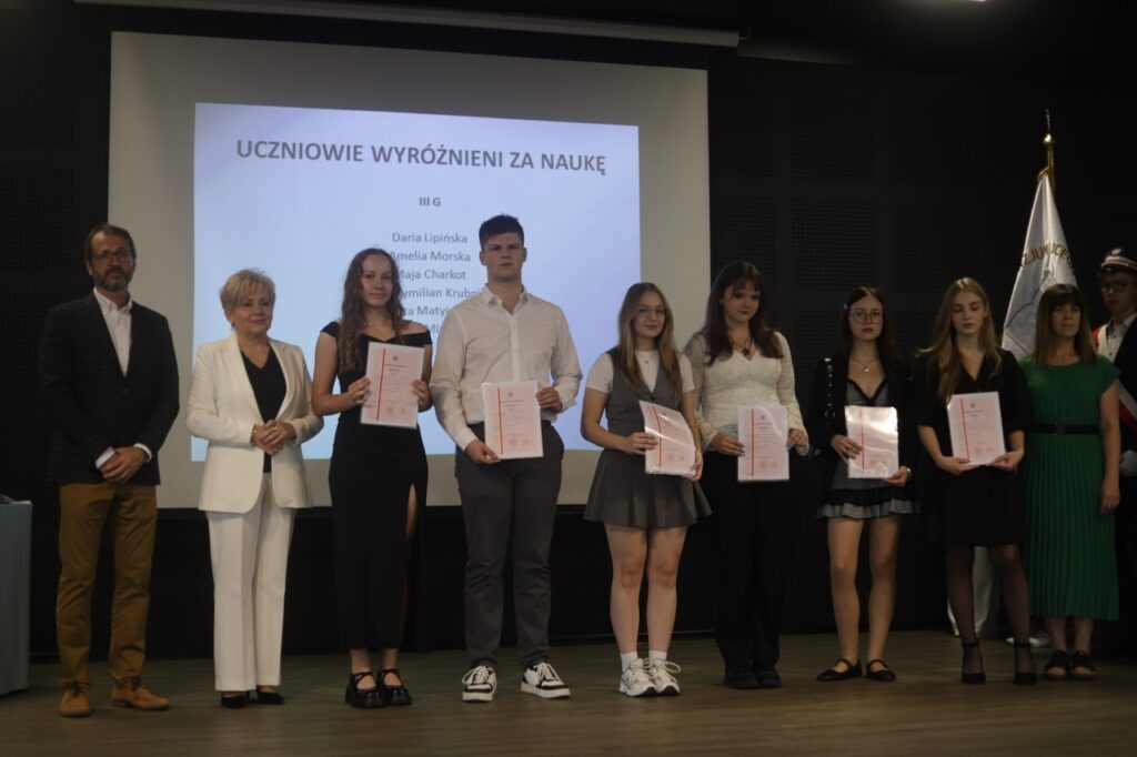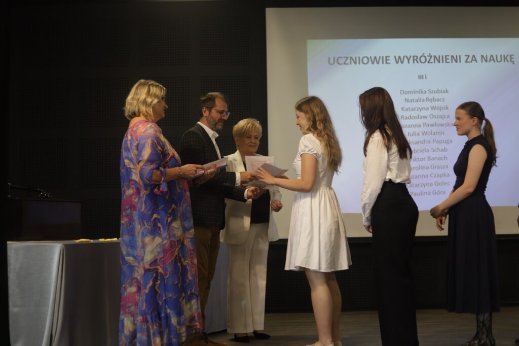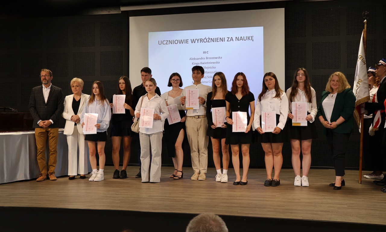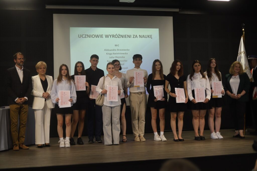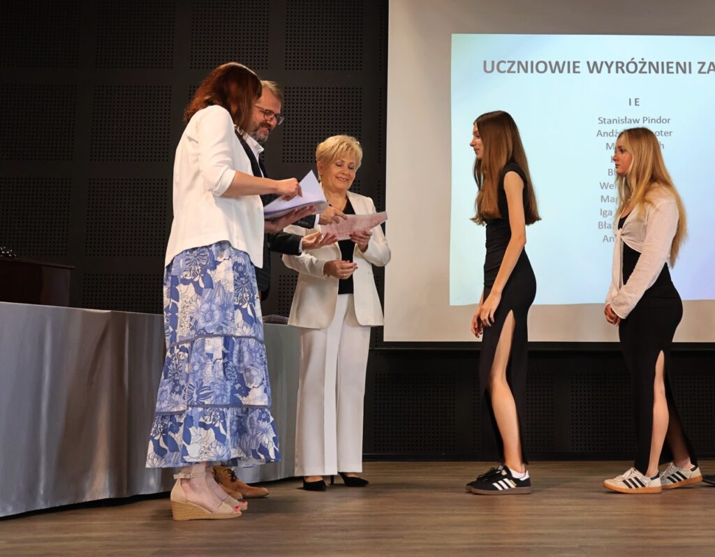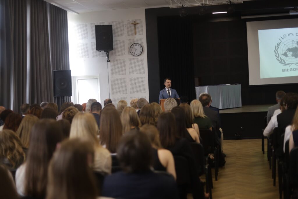 admin 9 miesięcy temu Organizacyjne , Uroczystości27 czerwca w auli obchodziliśmy uroczystość zakończenia roku szkolnego 2024/2025. Z tej okazji swoją obecnością zaszczycili nas goście: Starosta Biłgorajski Andrzej Szarlip oraz Przewodniczący Rady Rodziców Jarosław Świtała. Tegoroczną uroczystość rozpoczęła wzruszająca chwila – pożegnanie nauczycieli odchodzących na emeryturę. Dyrektor Jolanta Rycyk podziękowała panu Wojciechowi Krawcowi, panu Krzysztofowi Litwiniukowi i pani Jolancie Tor za wszystkie lata pracy, życzliwość, zaangażowanie i trud włożony w wychowanie wielu pokoleń młodzieży oraz oddanie sprawom szkoły, młodzież wręczyła kwiaty, a wszyscy zebrani wyrazili wdzięczność gromkimi brawami.