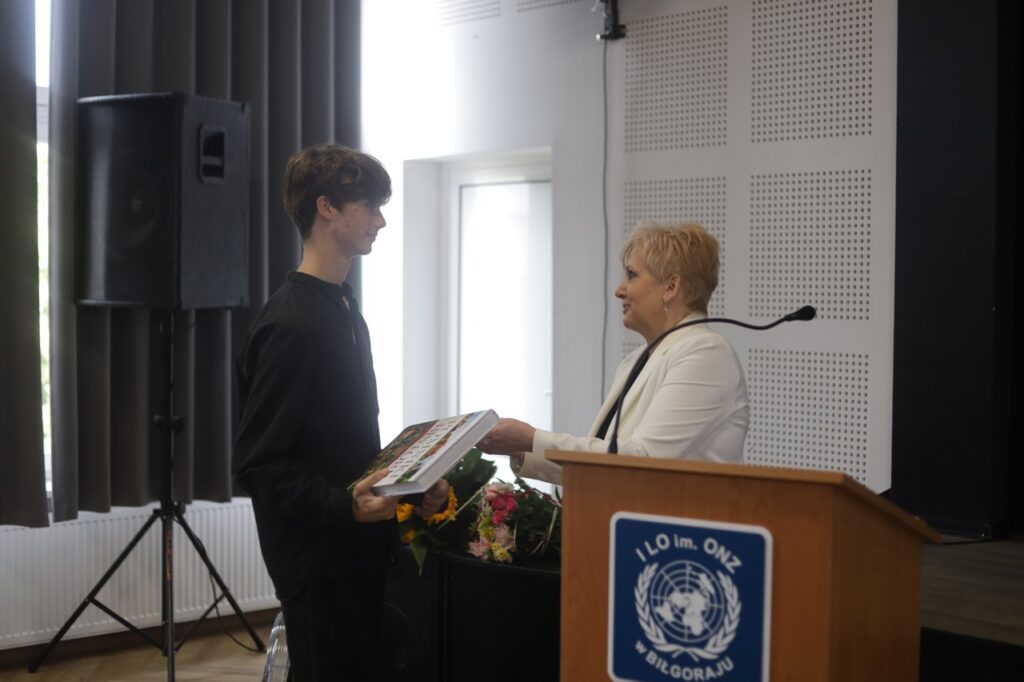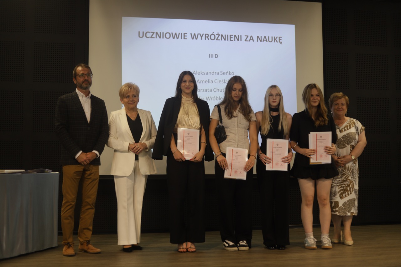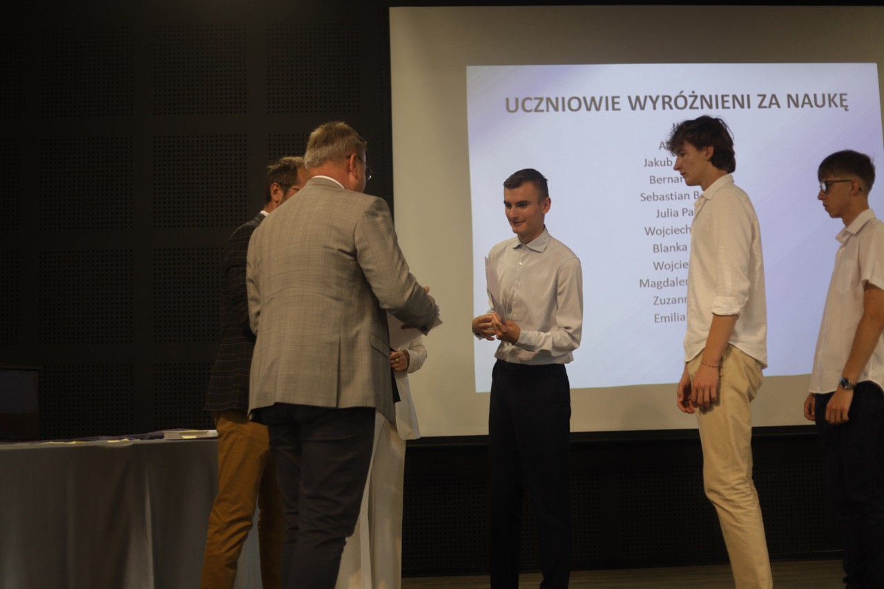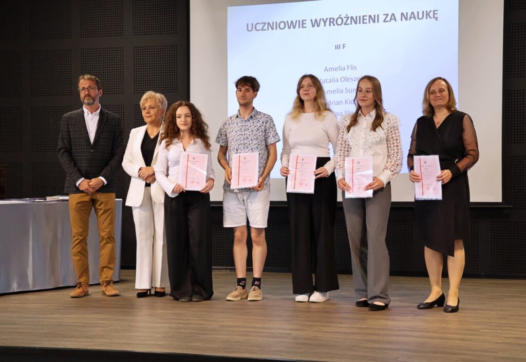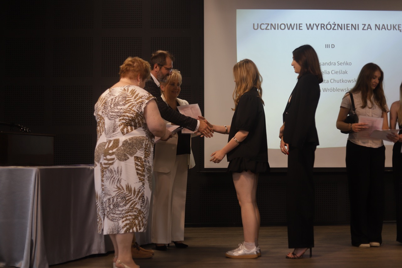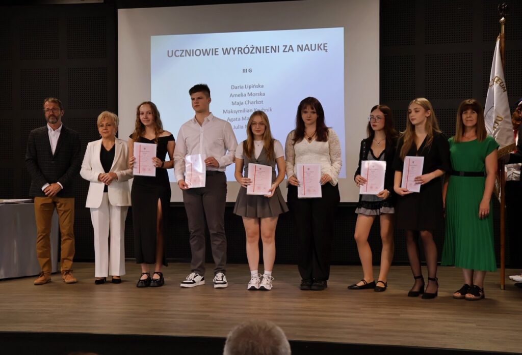 admin 9 miesięcy temu Organizacyjne , Uroczystości27 czerwca w auli obchodziliśmy uroczystość zakończenia roku szkolnego 2024/2025. Z tej okazji swoją obecnością zaszczycili nas goście: Starosta Biłgorajski Andrzej Szarlip oraz Przewodniczący Rady Rodziców Jarosław Świtała. Tegoroczną uroczystość rozpoczęła wzruszająca chwila – pożegnanie nauczycieli odchodzących na emeryturę. Dyrektor Jolanta Rycyk podziękowała panu Wojciechowi Krawcowi, panu Krzysztofowi Litwiniukowi i pani Jolancie Tor za wszystkie lata pracy, życzliwość, zaangażowanie i trud włożony w wychowanie wielu pokoleń młodzieży oraz oddanie sprawom szkoły, młodzież wręczyła kwiaty, a wszyscy zebrani wyrazili wdzięczność gromkimi brawami.