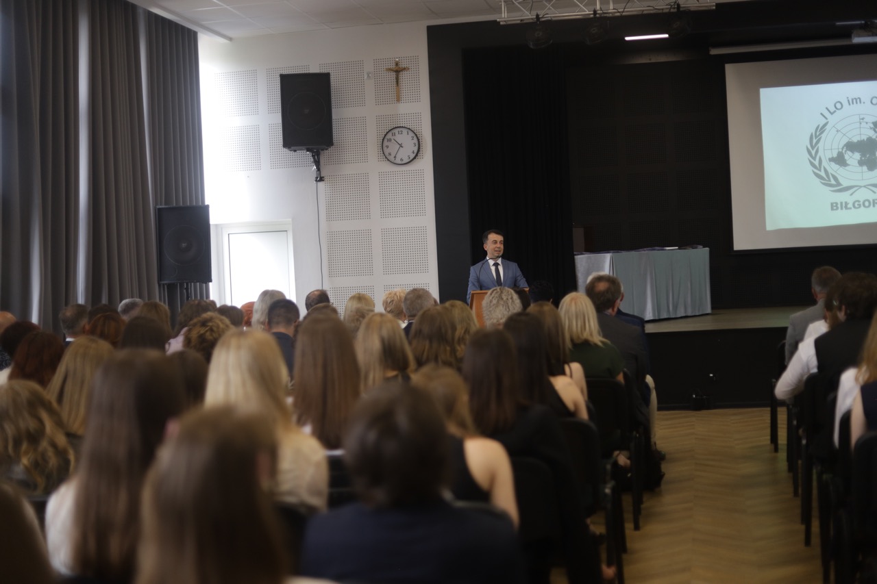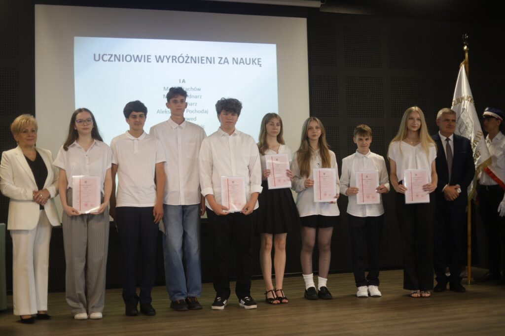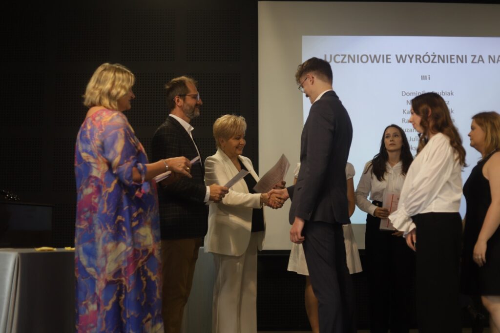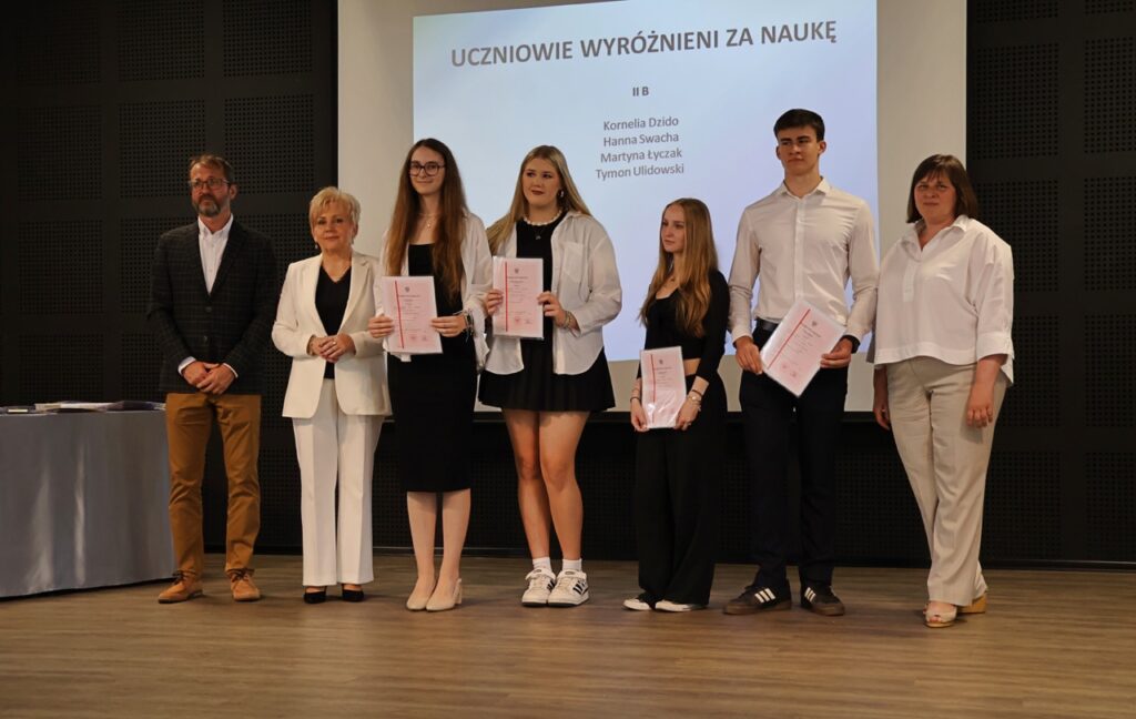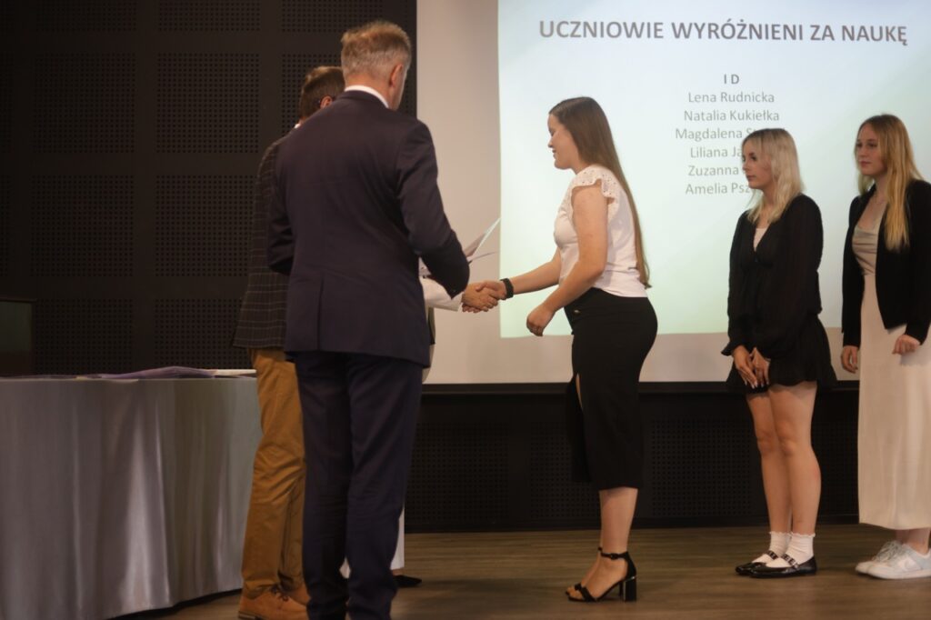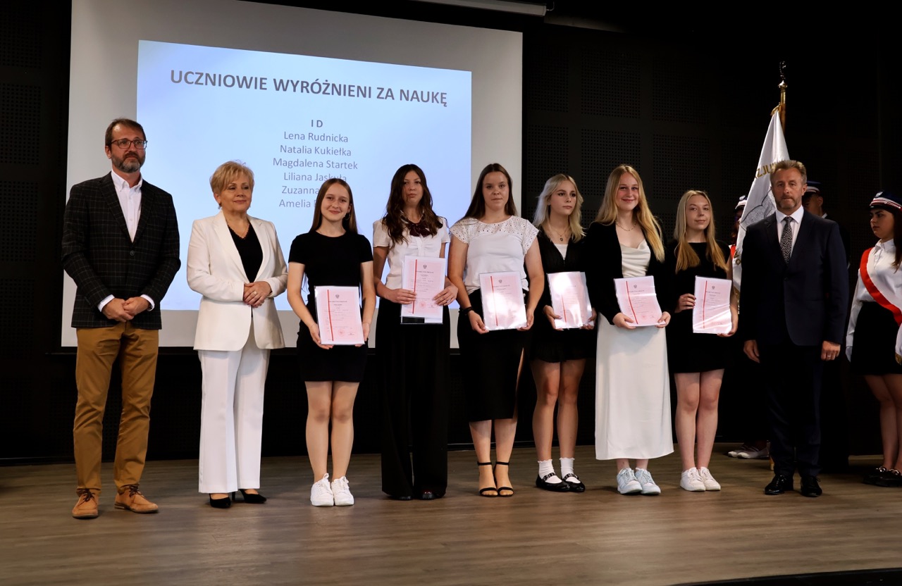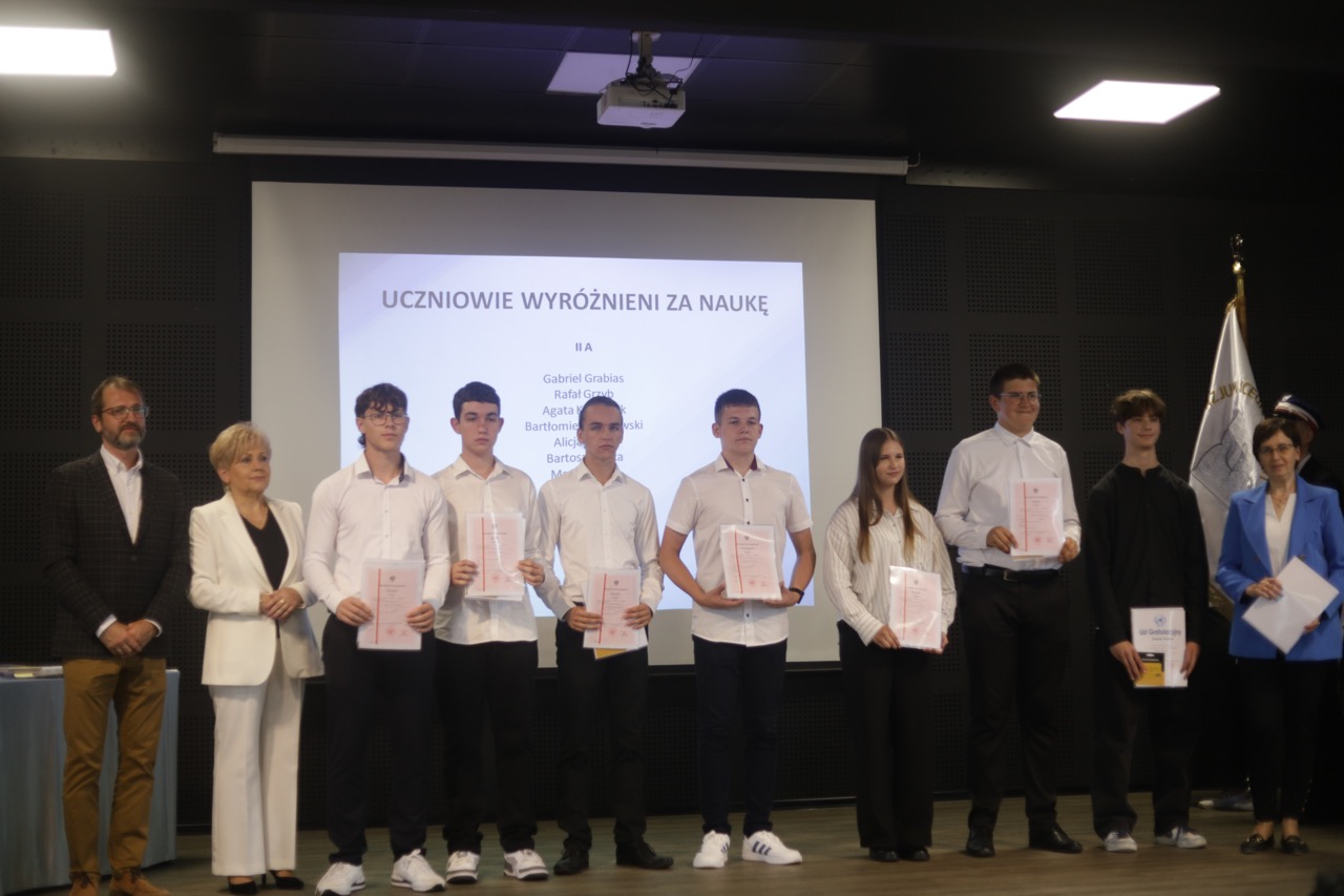 admin 9 miesięcy temu Organizacyjne , Uroczystości27 czerwca w auli obchodziliśmy uroczystość zakończenia roku szkolnego 2024/2025. Z tej okazji swoją obecnością zaszczycili nas goście: Starosta Biłgorajski Andrzej Szarlip oraz Przewodniczący Rady Rodziców Jarosław Świtała. Tegoroczną uroczystość rozpoczęła wzruszająca chwila – pożegnanie nauczycieli odchodzących na emeryturę. Dyrektor Jolanta Rycyk podziękowała panu Wojciechowi Krawcowi, panu Krzysztofowi Litwiniukowi i pani Jolancie Tor za wszystkie lata pracy, życzliwość, zaangażowanie i trud włożony w wychowanie wielu pokoleń młodzieży oraz oddanie sprawom szkoły, młodzież wręczyła kwiaty, a wszyscy zebrani wyrazili wdzięczność gromkimi brawami.