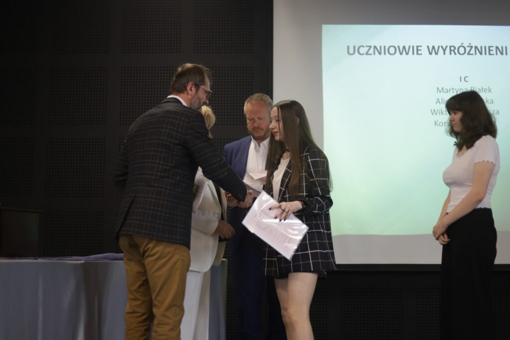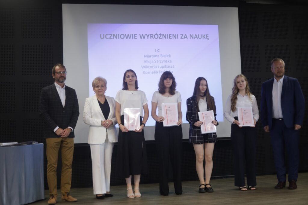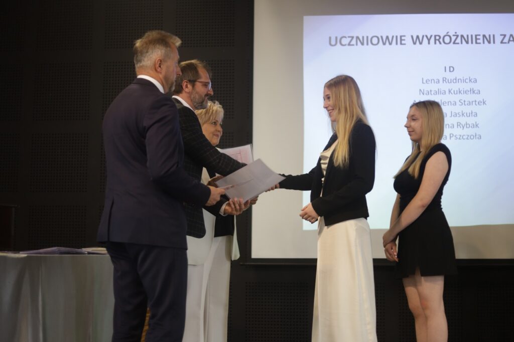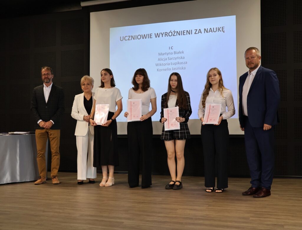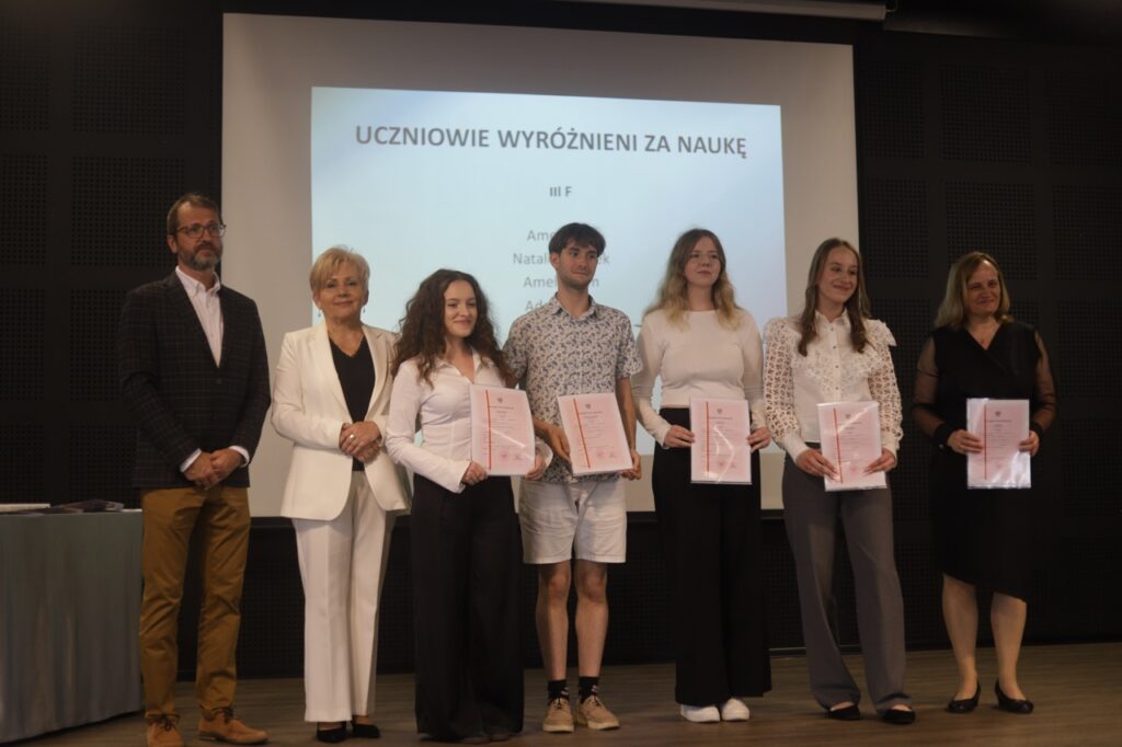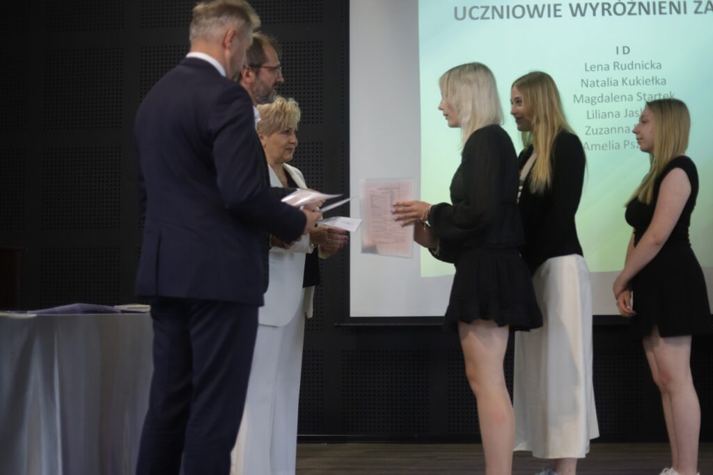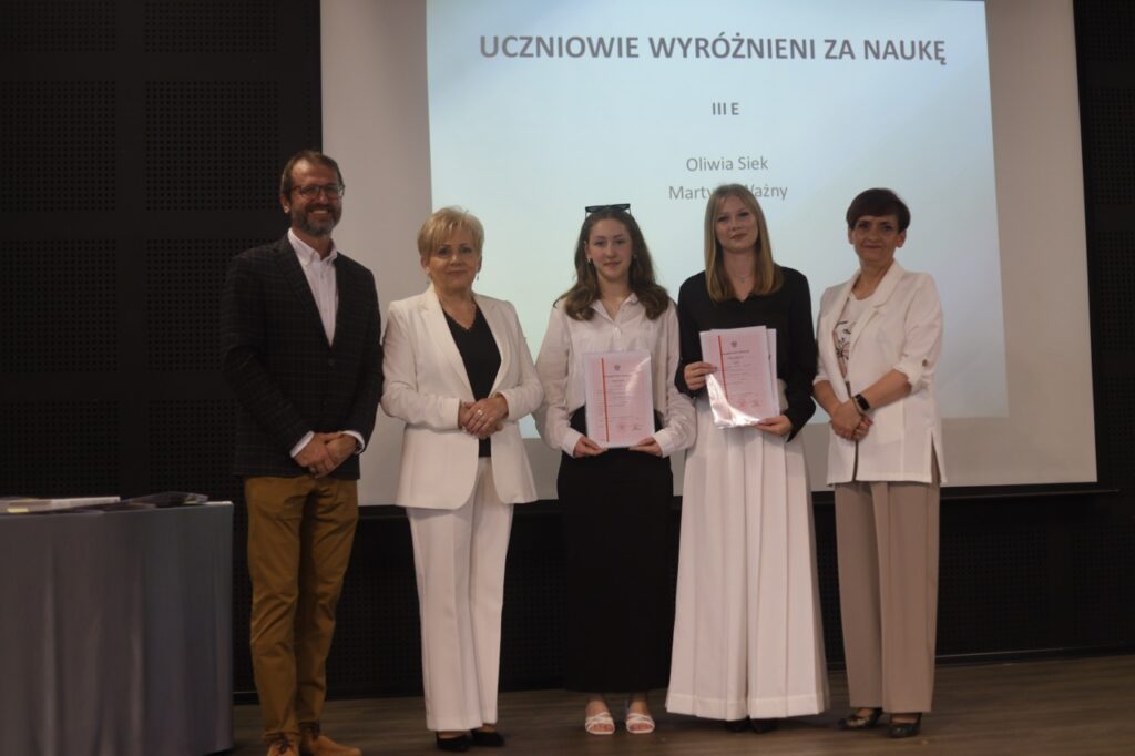 admin 9 miesięcy temu Organizacyjne , Uroczystości27 czerwca w auli obchodziliśmy uroczystość zakończenia roku szkolnego 2024/2025. Z tej okazji swoją obecnością zaszczycili nas goście: Starosta Biłgorajski Andrzej Szarlip oraz Przewodniczący Rady Rodziców Jarosław Świtała. Tegoroczną uroczystość rozpoczęła wzruszająca chwila – pożegnanie nauczycieli odchodzących na emeryturę. Dyrektor Jolanta Rycyk podziękowała panu Wojciechowi Krawcowi, panu Krzysztofowi Litwiniukowi i pani Jolancie Tor za wszystkie lata pracy, życzliwość, zaangażowanie i trud włożony w wychowanie wielu pokoleń młodzieży oraz oddanie sprawom szkoły, młodzież wręczyła kwiaty, a wszyscy zebrani wyrazili wdzięczność gromkimi brawami.