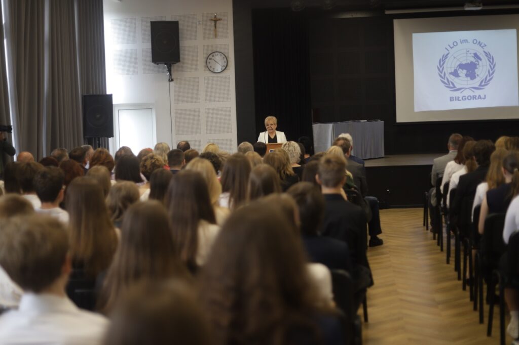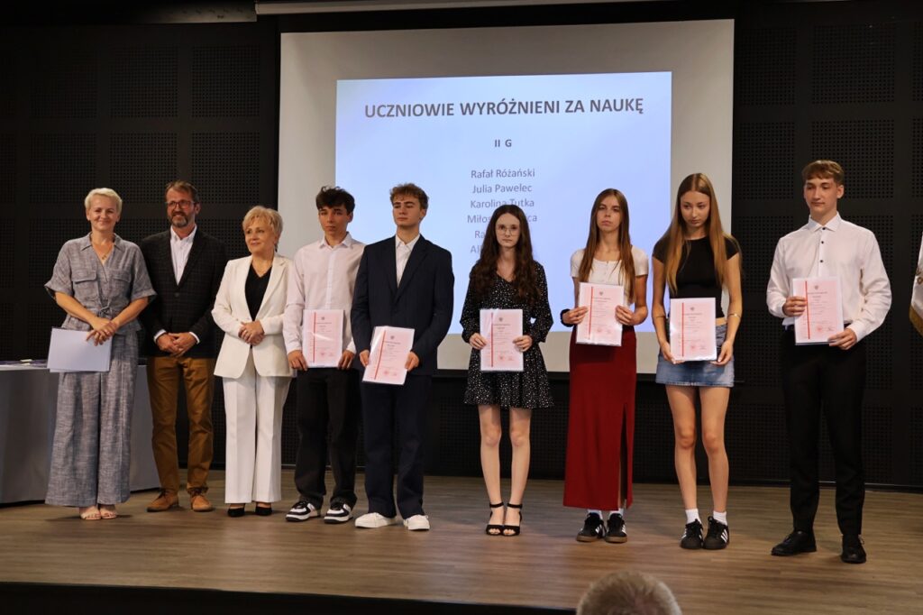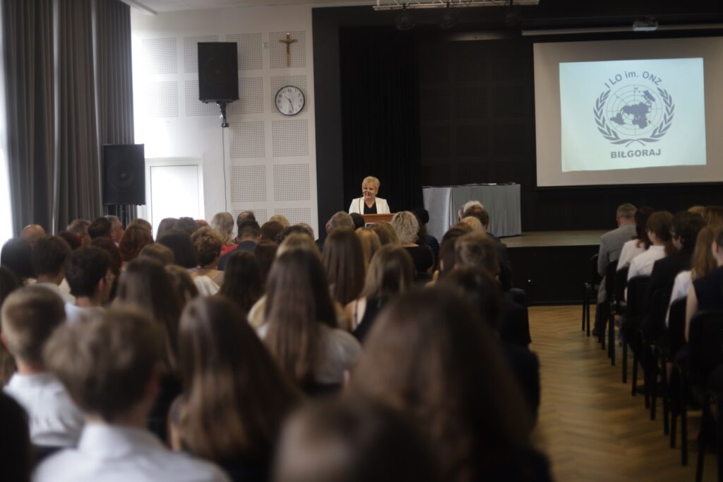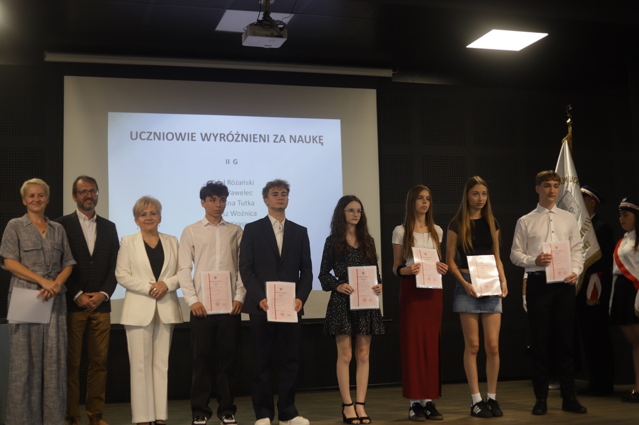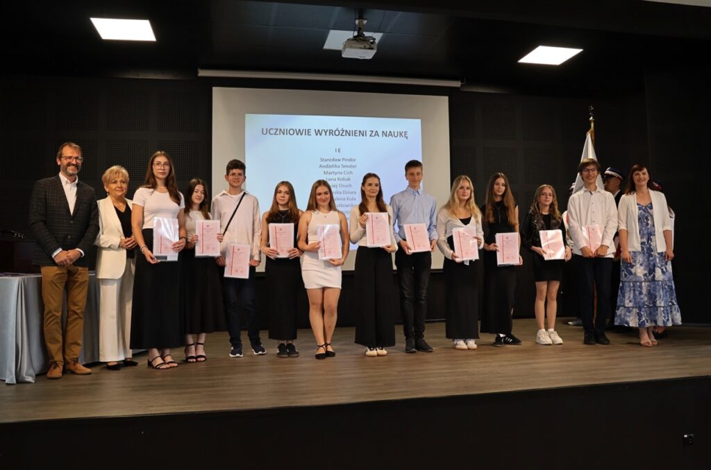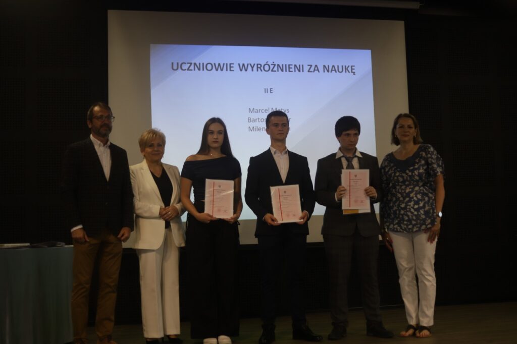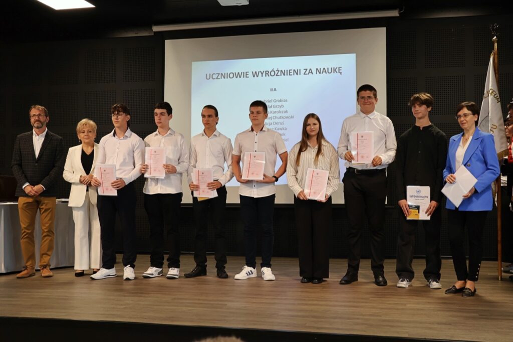 admin 9 miesięcy temu Organizacyjne , Uroczystości27 czerwca w auli obchodziliśmy uroczystość zakończenia roku szkolnego 2024/2025. Z tej okazji swoją obecnością zaszczycili nas goście: Starosta Biłgorajski Andrzej Szarlip oraz Przewodniczący Rady Rodziców Jarosław Świtała. Tegoroczną uroczystość rozpoczęła wzruszająca chwila – pożegnanie nauczycieli odchodzących na emeryturę. Dyrektor Jolanta Rycyk podziękowała panu Wojciechowi Krawcowi, panu Krzysztofowi Litwiniukowi i pani Jolancie Tor za wszystkie lata pracy, życzliwość, zaangażowanie i trud włożony w wychowanie wielu pokoleń młodzieży oraz oddanie sprawom szkoły, młodzież wręczyła kwiaty, a wszyscy zebrani wyrazili wdzięczność gromkimi brawami.