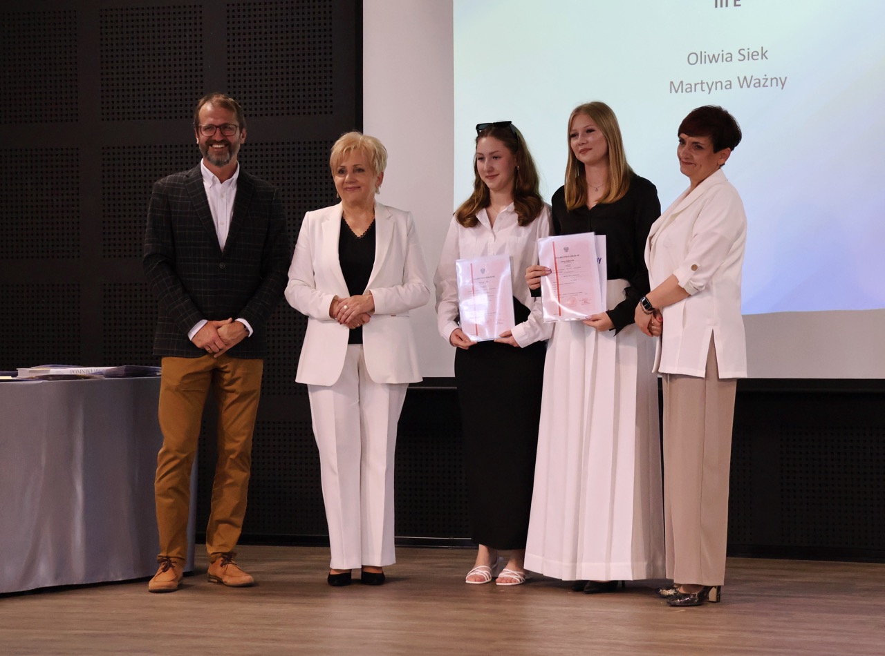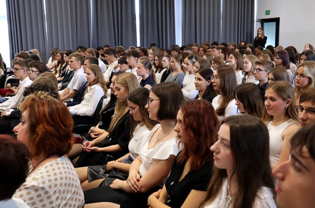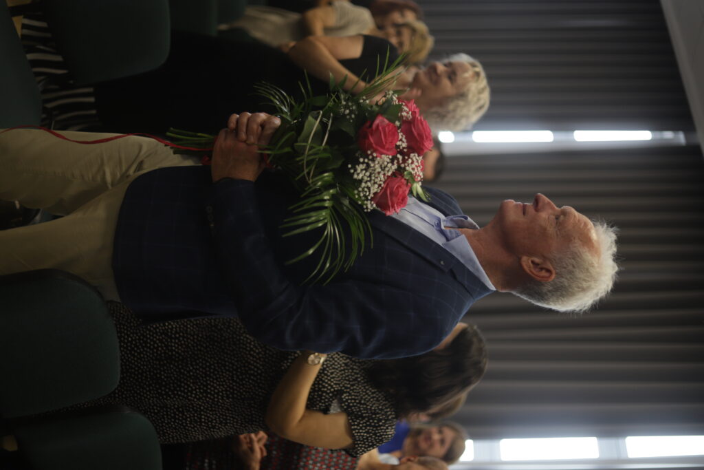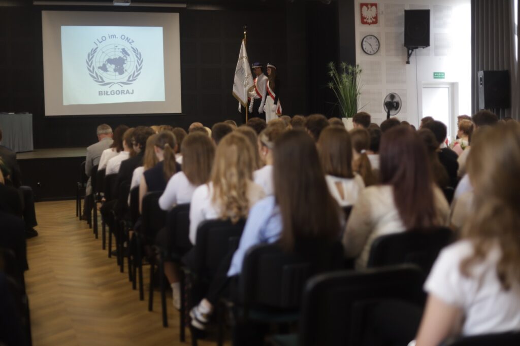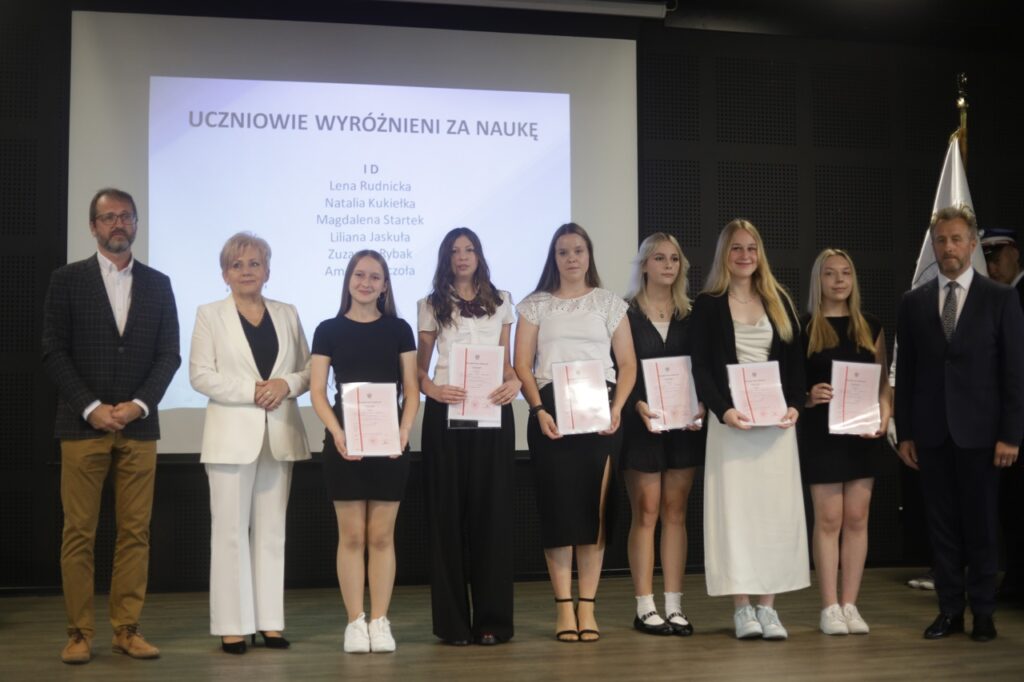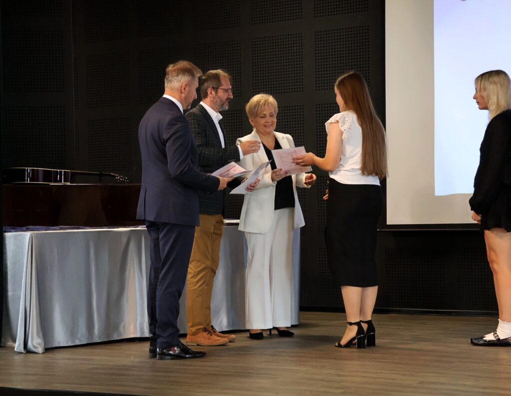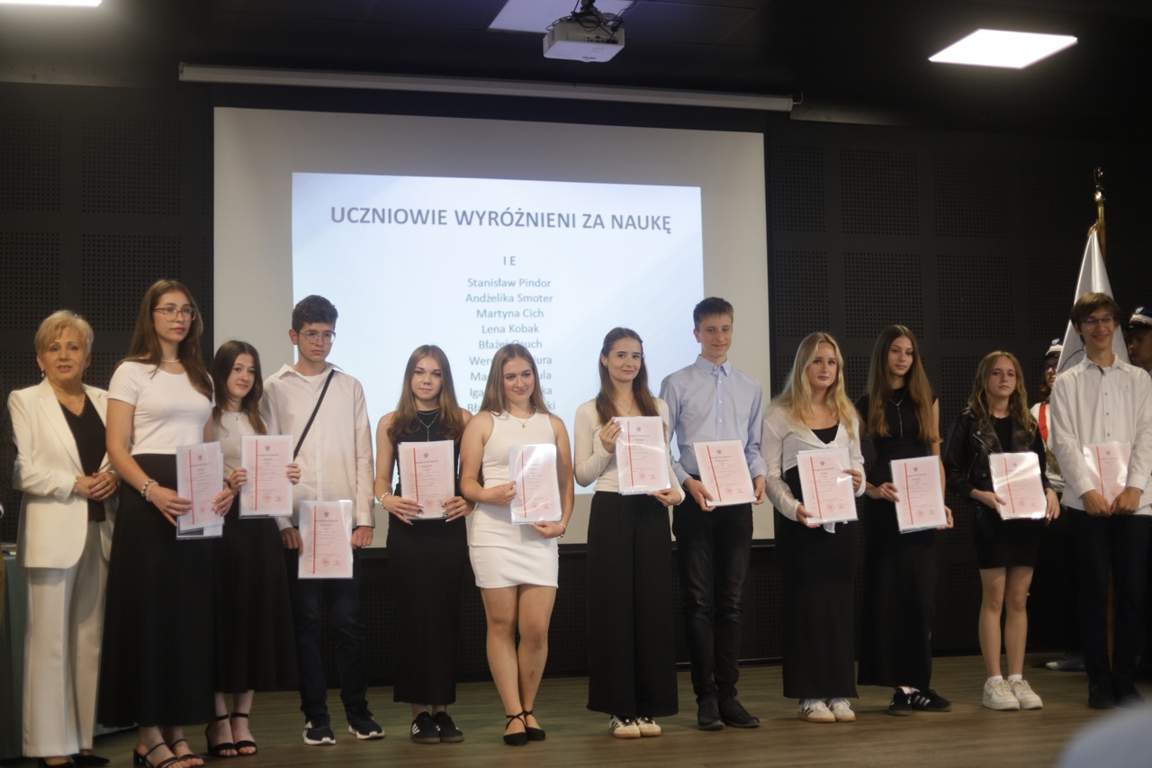 admin 9 miesięcy temu Organizacyjne , Uroczystości27 czerwca w auli obchodziliśmy uroczystość zakończenia roku szkolnego 2024/2025. Z tej okazji swoją obecnością zaszczycili nas goście: Starosta Biłgorajski Andrzej Szarlip oraz Przewodniczący Rady Rodziców Jarosław Świtała. Tegoroczną uroczystość rozpoczęła wzruszająca chwila – pożegnanie nauczycieli odchodzących na emeryturę. Dyrektor Jolanta Rycyk podziękowała panu Wojciechowi Krawcowi, panu Krzysztofowi Litwiniukowi i pani Jolancie Tor za wszystkie lata pracy, życzliwość, zaangażowanie i trud włożony w wychowanie wielu pokoleń młodzieży oraz oddanie sprawom szkoły, młodzież wręczyła kwiaty, a wszyscy zebrani wyrazili wdzięczność gromkimi brawami.