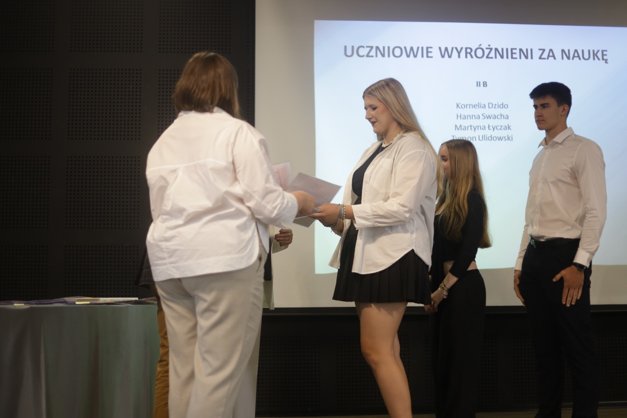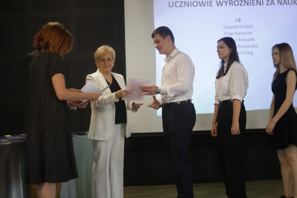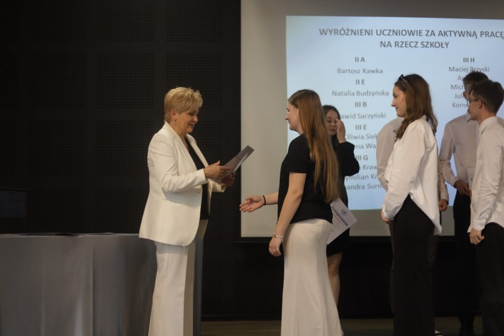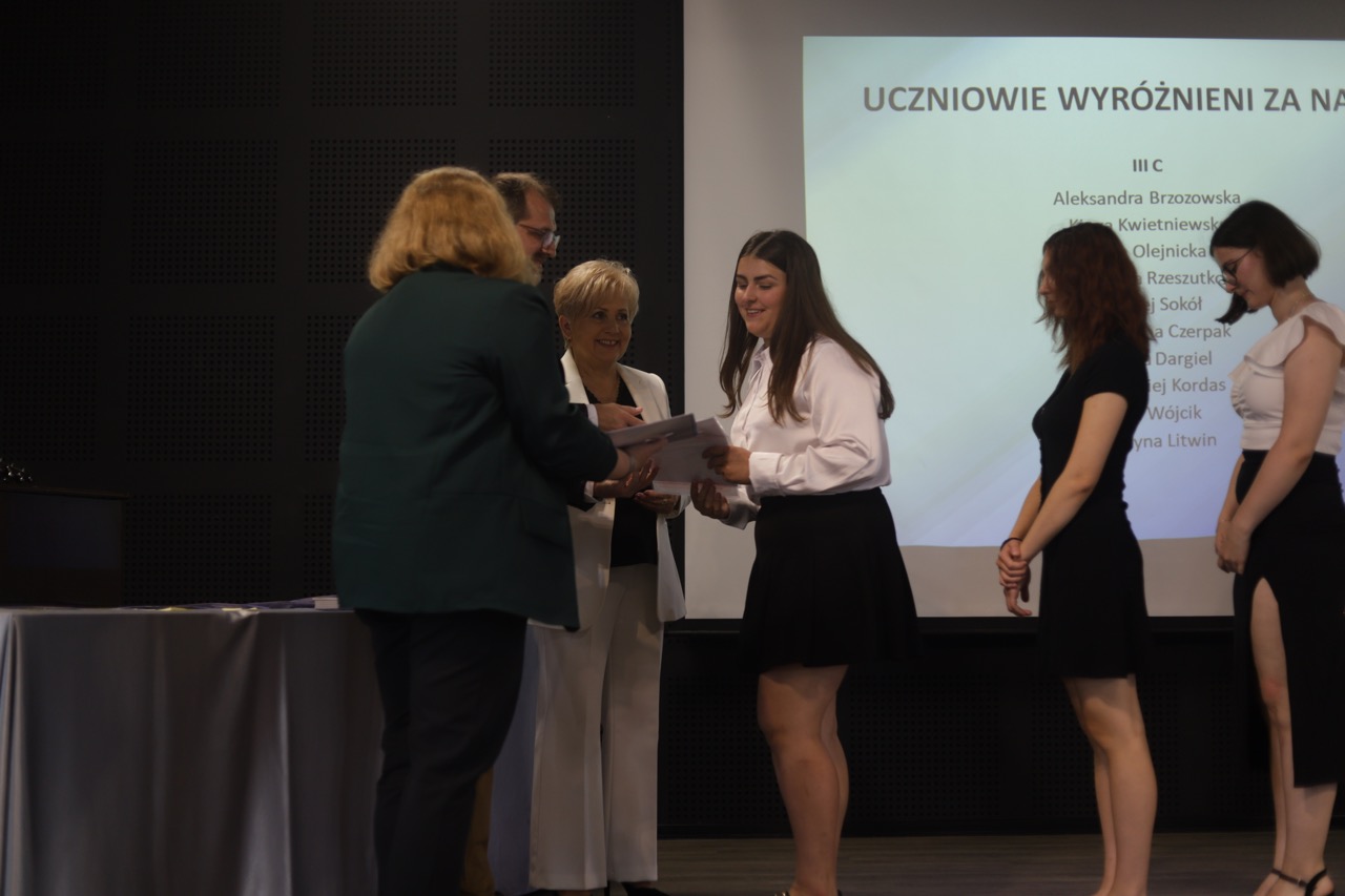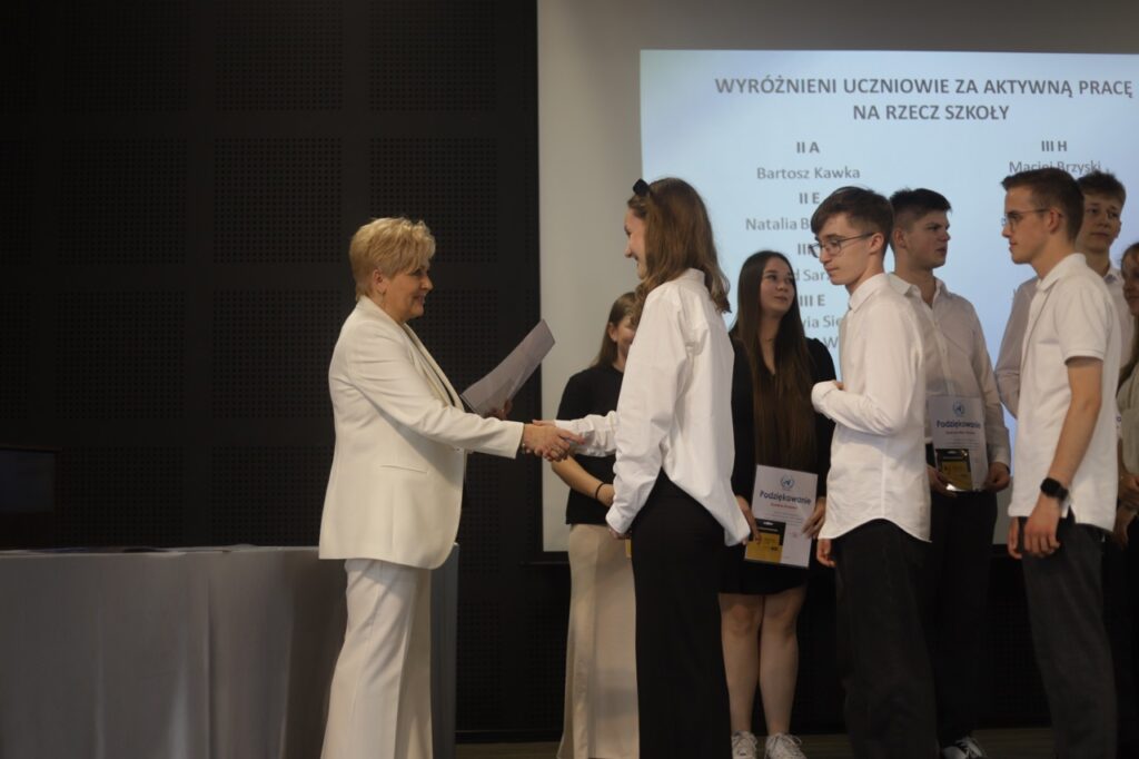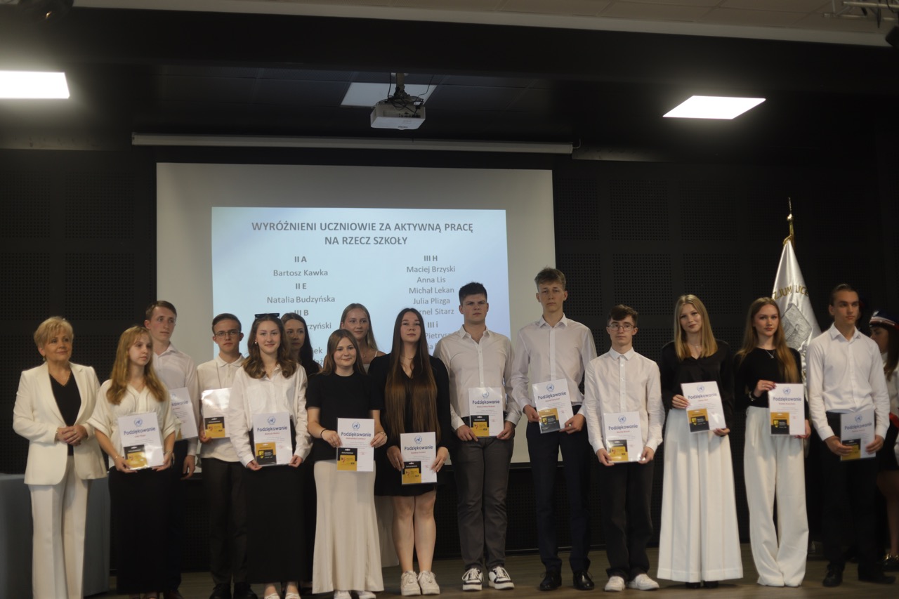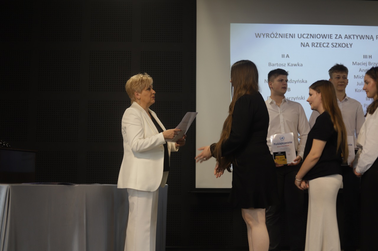 Następnie pani dyrektor podsumowała mijający rok i z wychowawcami oraz zaproszonymi gośćmi wręczyła listy gratulacyjne i karty podarunkowe licealistom, którzy otrzymali świadectwa z czerwonym paskiem, laureatom oraz finalistom olimpiad przedmiotowych i konkursów, uczniom ze 100% frekwencją oraz szczególnie aktywnie działającym na rzecz społeczności szkolnej.