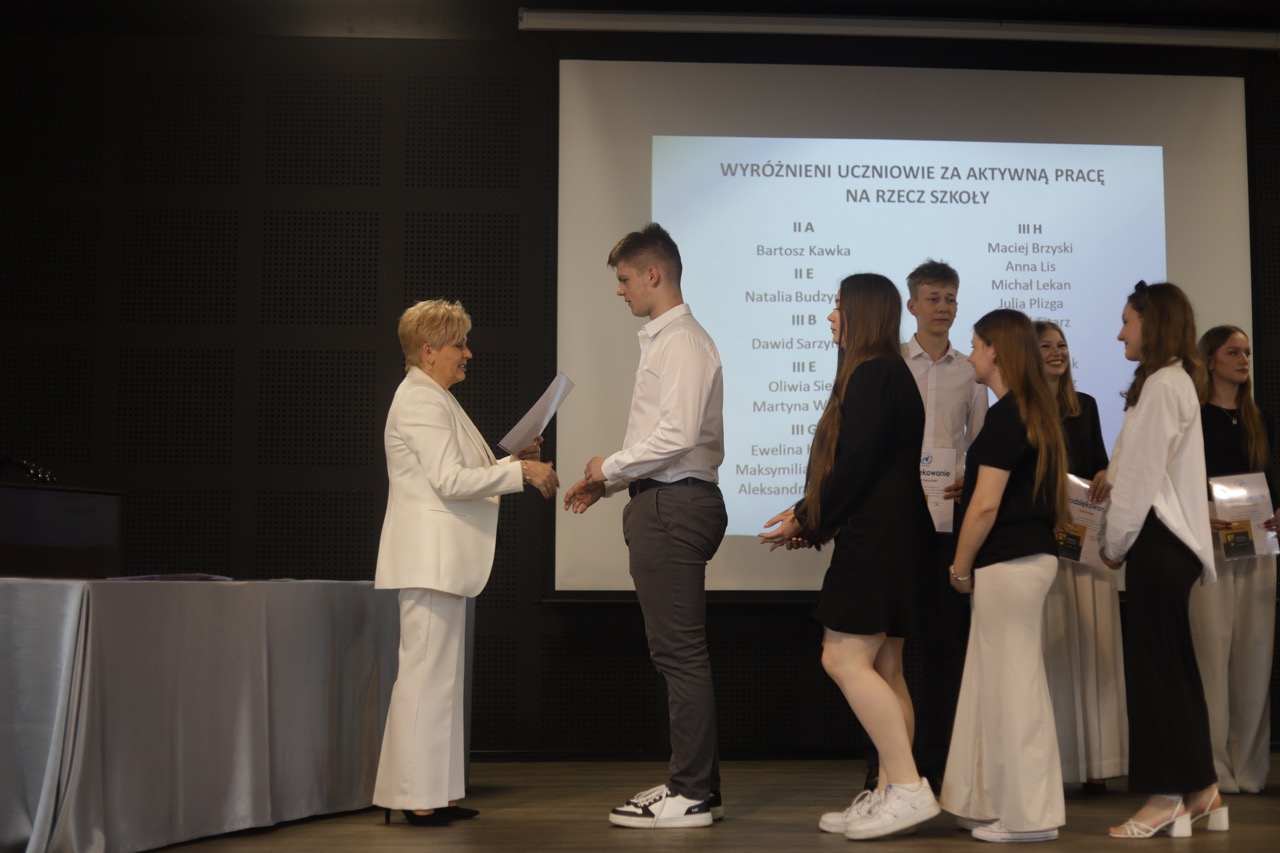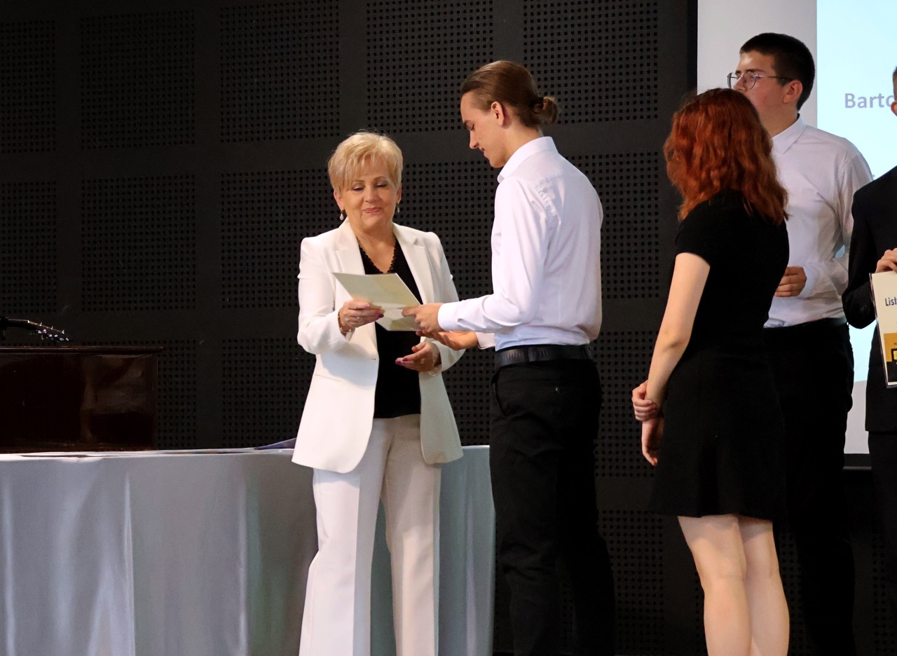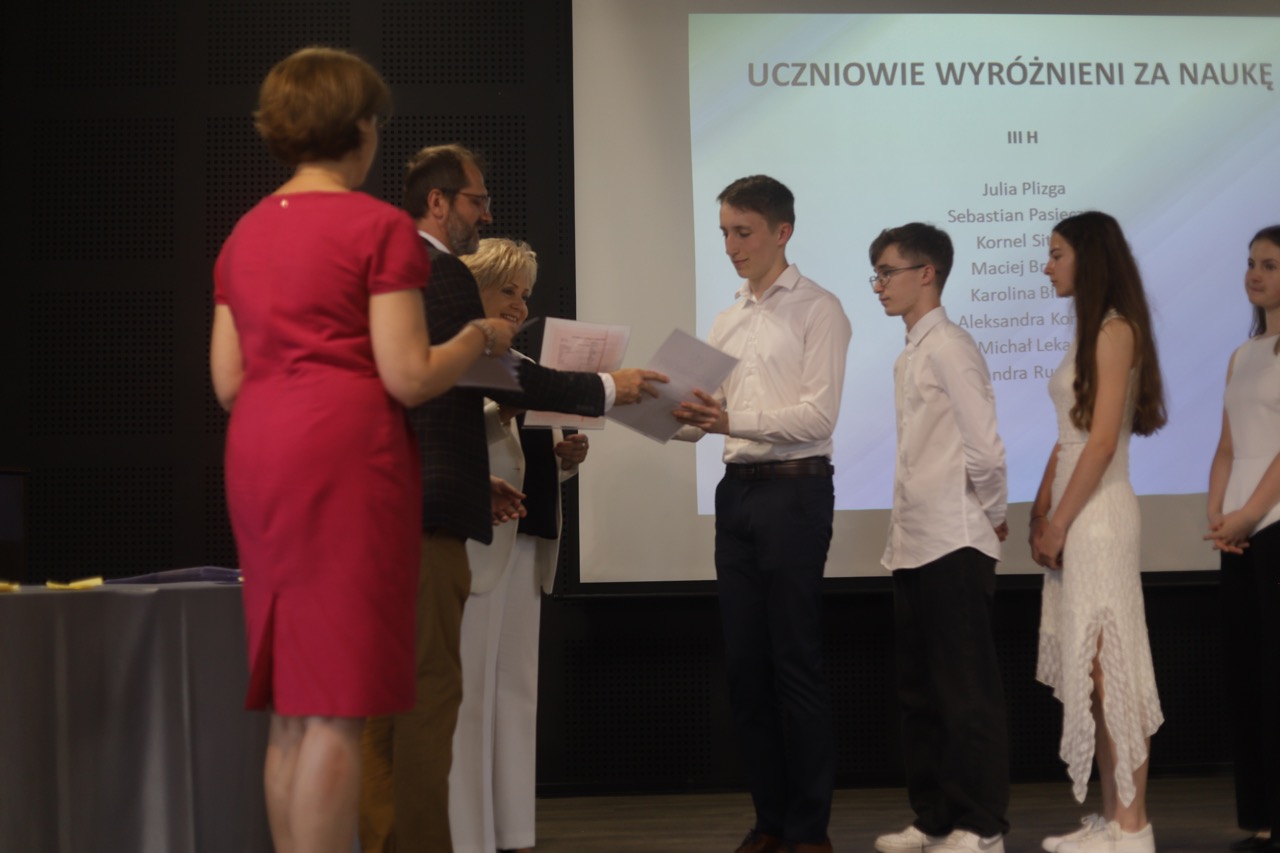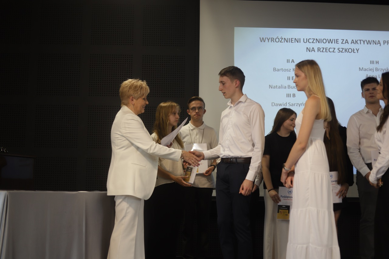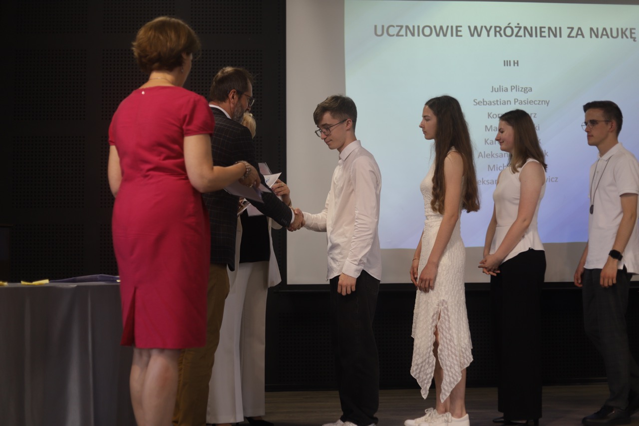 Następnie pani dyrektor podsumowała mijający rok i z wychowawcami oraz zaproszonymi gośćmi wręczyła listy gratulacyjne i karty podarunkowe licealistom, którzy otrzymali świadectwa z czerwonym paskiem, laureatom oraz finalistom olimpiad przedmiotowych i konkursów, uczniom ze 100% frekwencją oraz szczególnie aktywnie działającym na rzecz społeczności szkolnej.