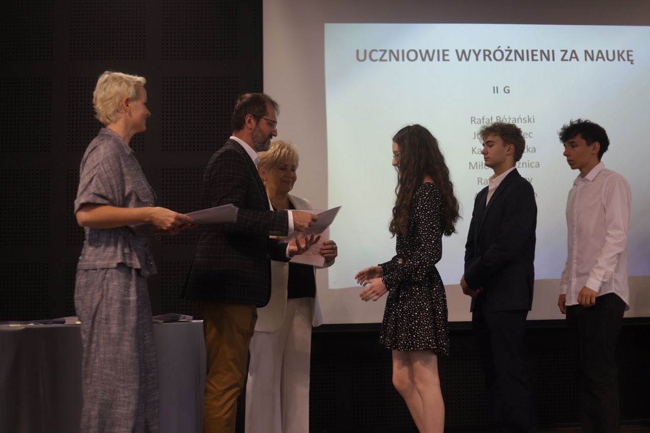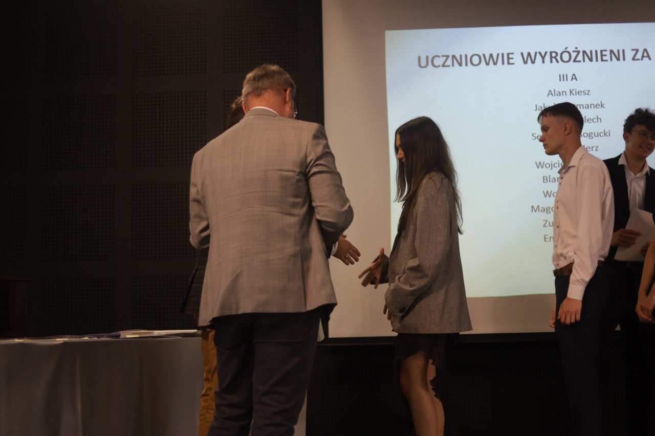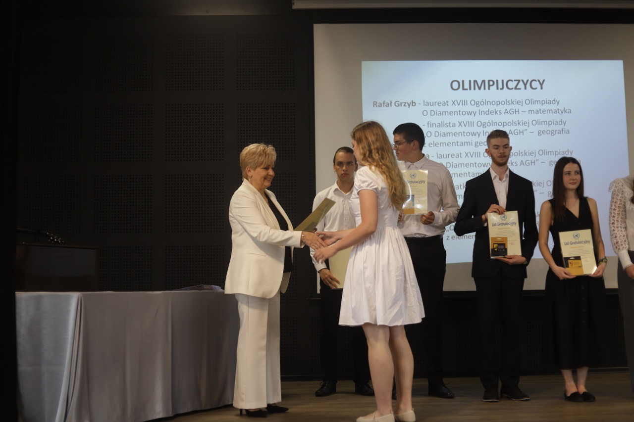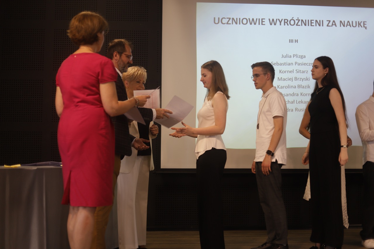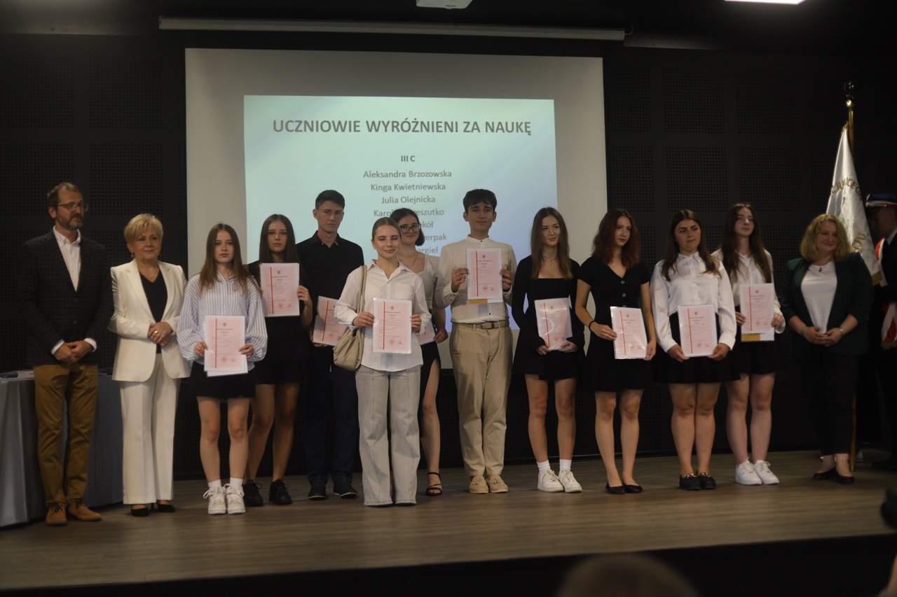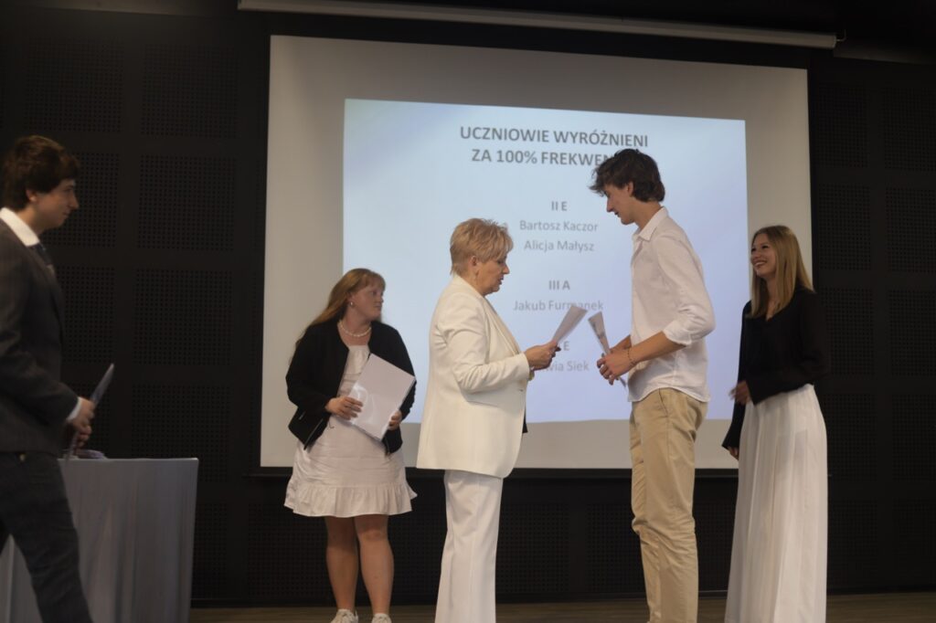 Następnie pani dyrektor podsumowała mijający rok i z wychowawcami oraz zaproszonymi gośćmi wręczyła listy gratulacyjne i karty podarunkowe licealistom, którzy otrzymali świadectwa z czerwonym paskiem, laureatom oraz finalistom olimpiad przedmiotowych i konkursów, uczniom ze 100% frekwencją oraz szczególnie aktywnie działającym na rzecz społeczności szkolnej.