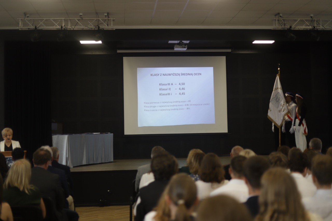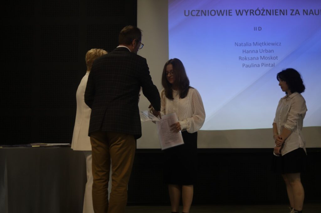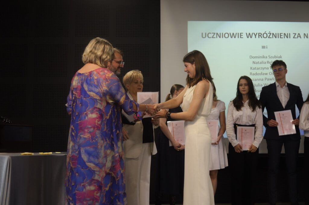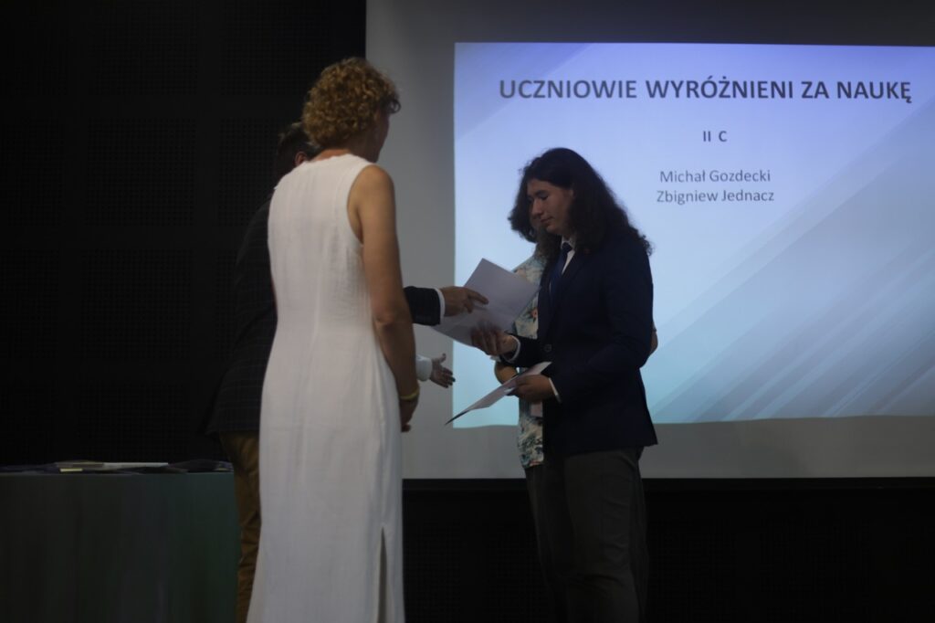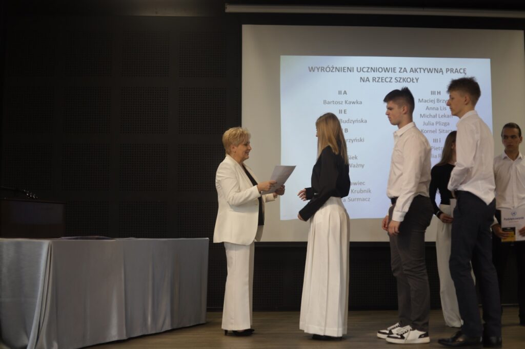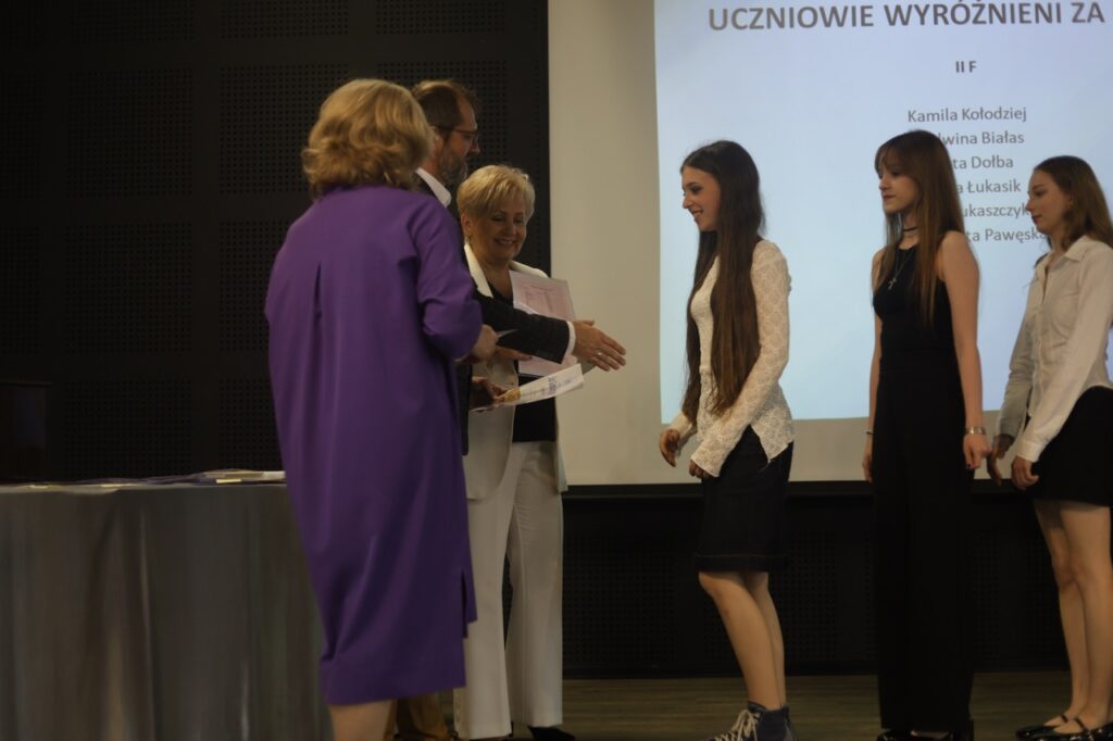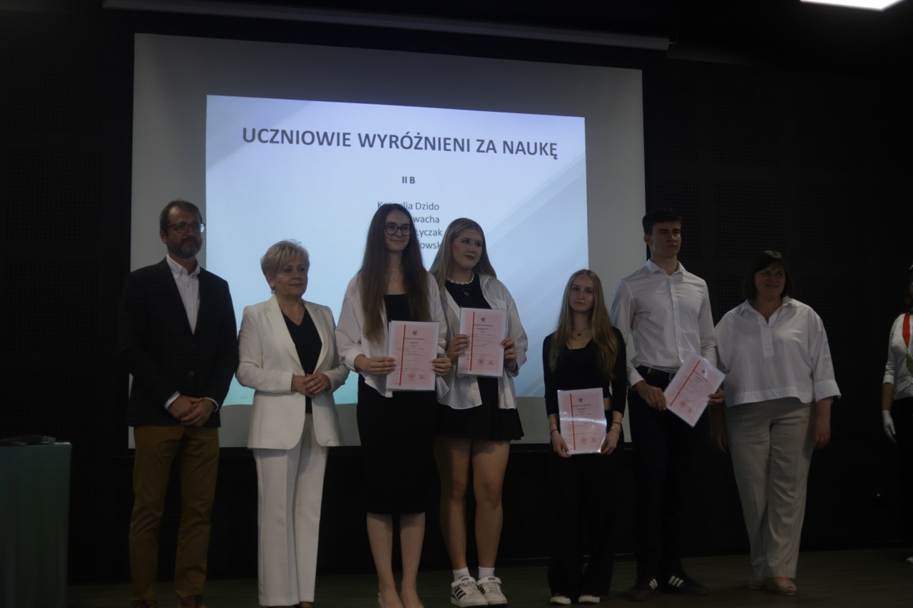 Następnie pani dyrektor podsumowała mijający rok i z wychowawcami oraz zaproszonymi gośćmi wręczyła listy gratulacyjne i karty podarunkowe licealistom, którzy otrzymali świadectwa z czerwonym paskiem, laureatom oraz finalistom olimpiad przedmiotowych i konkursów, uczniom ze 100% frekwencją oraz szczególnie aktywnie działającym na rzecz społeczności szkolnej.