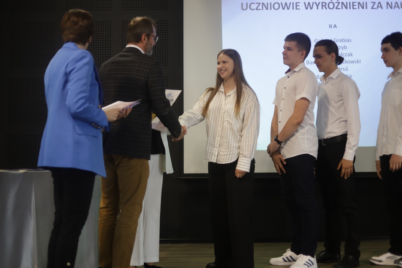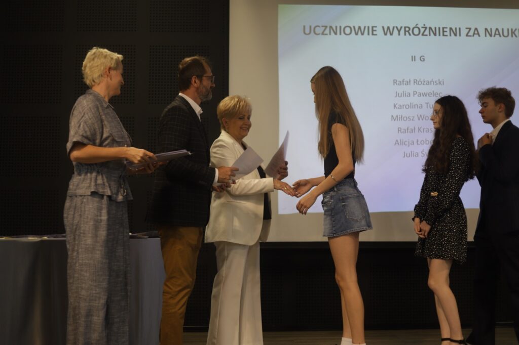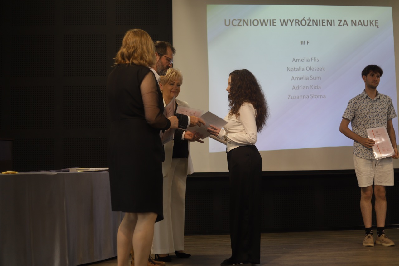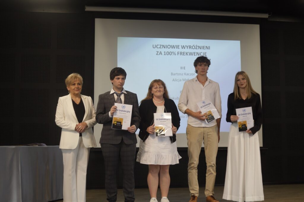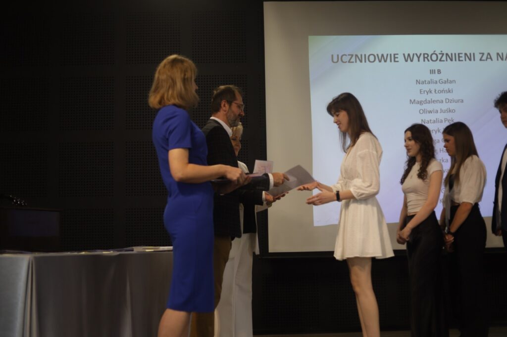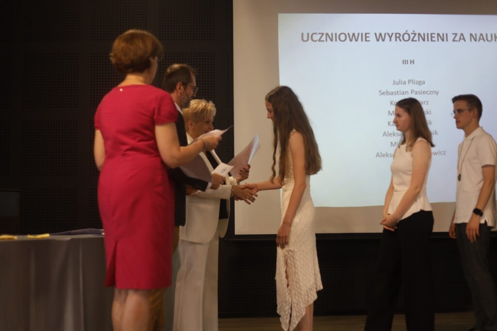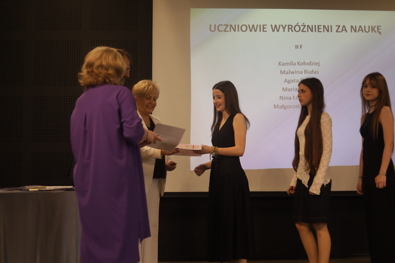 Następnie pani dyrektor podsumowała mijający rok i z wychowawcami oraz zaproszonymi gośćmi wręczyła listy gratulacyjne i karty podarunkowe licealistom, którzy otrzymali świadectwa z czerwonym paskiem, laureatom oraz finalistom olimpiad przedmiotowych i konkursów, uczniom ze 100% frekwencją oraz szczególnie aktywnie działającym na rzecz społeczności szkolnej.