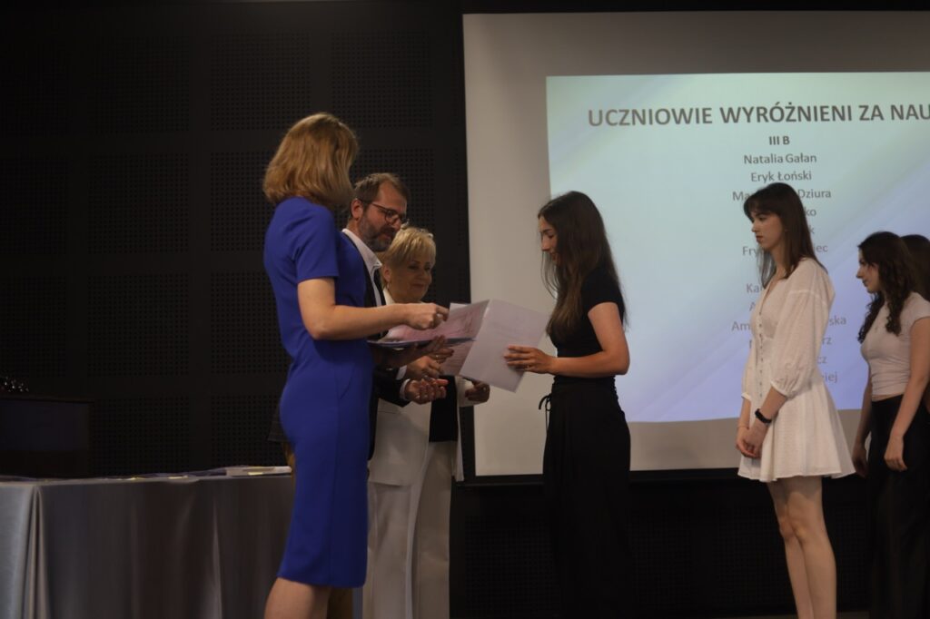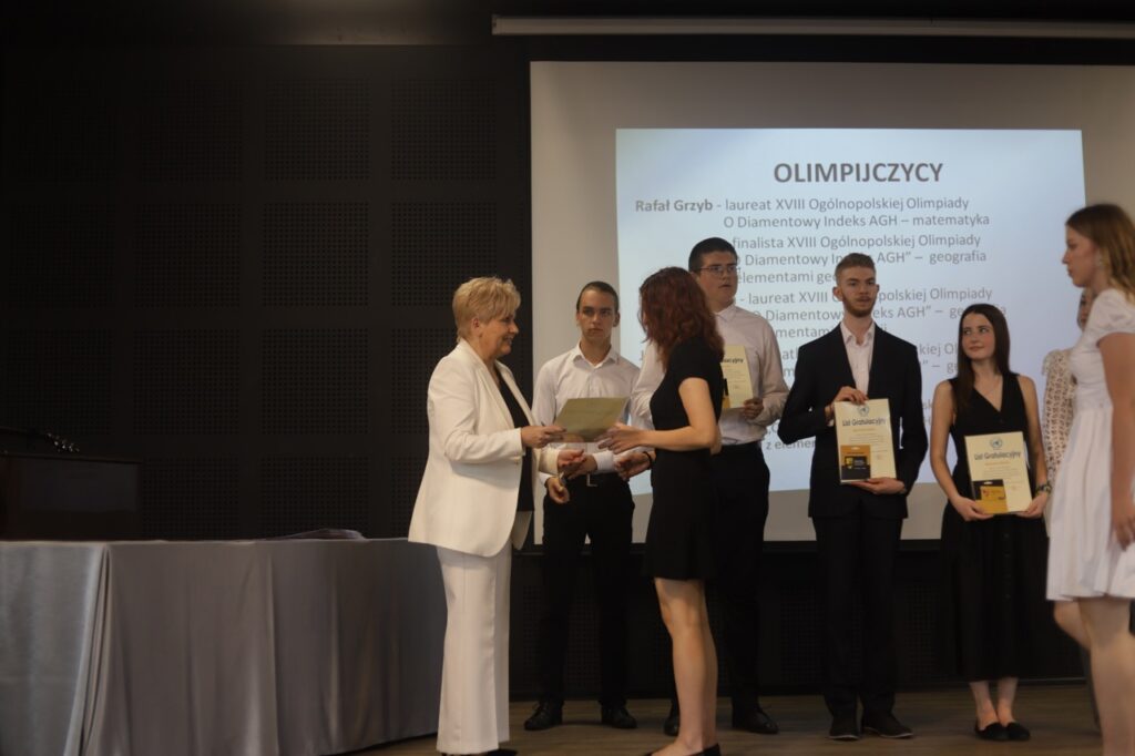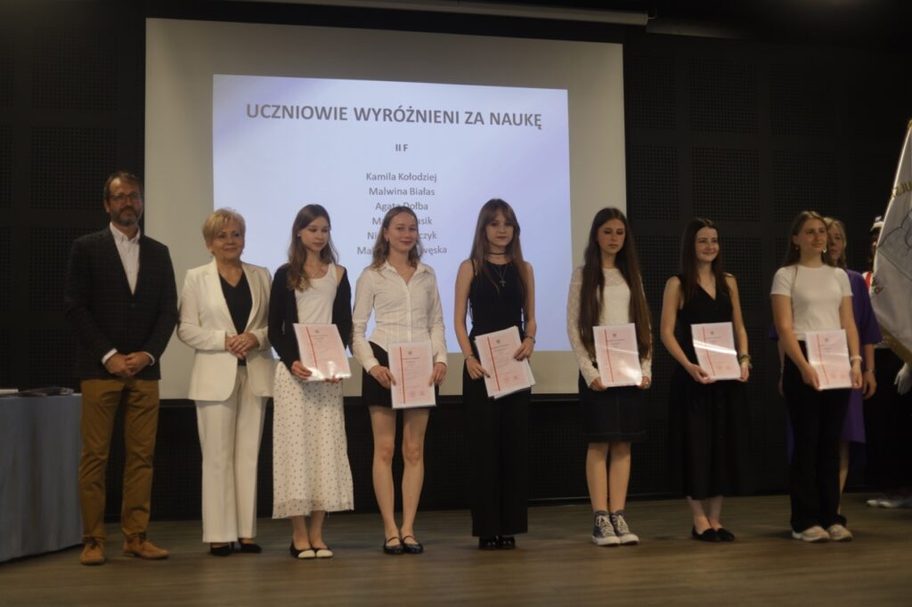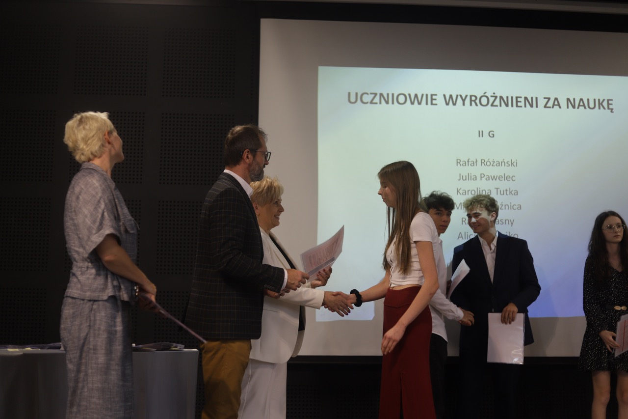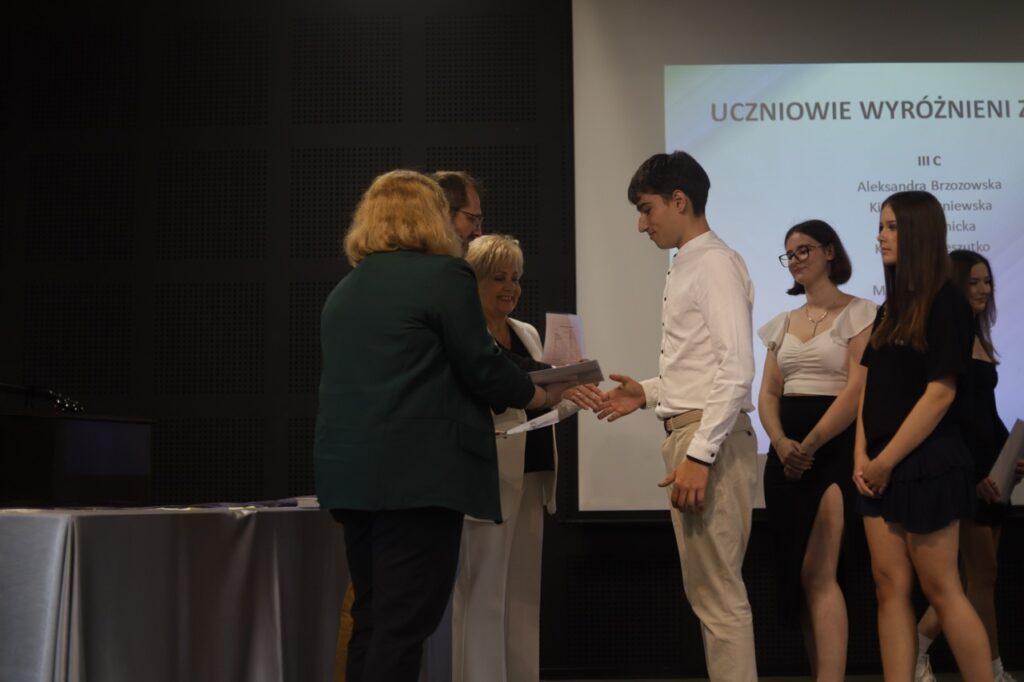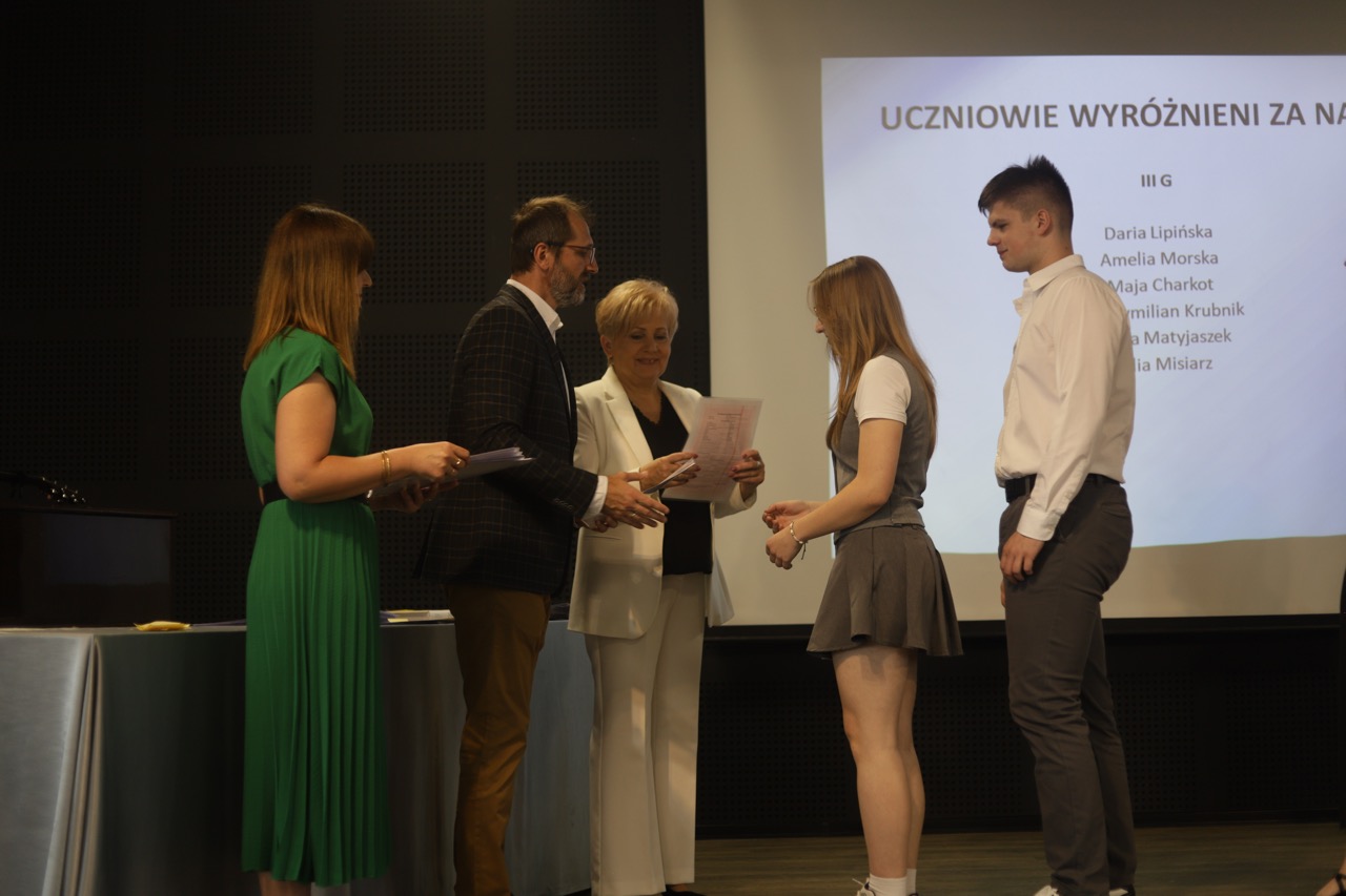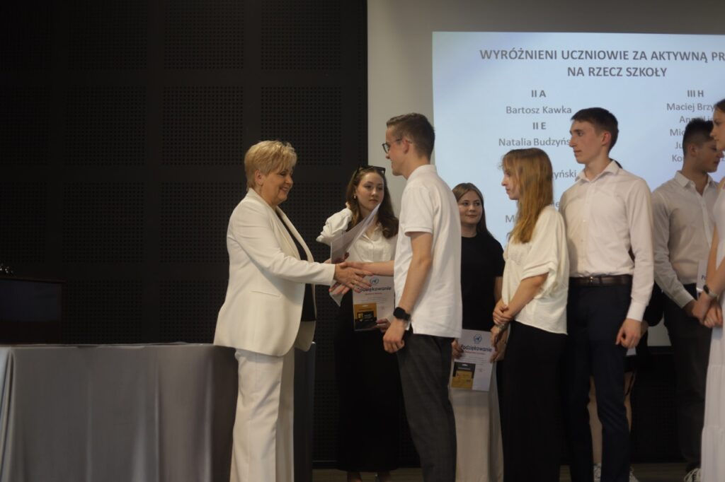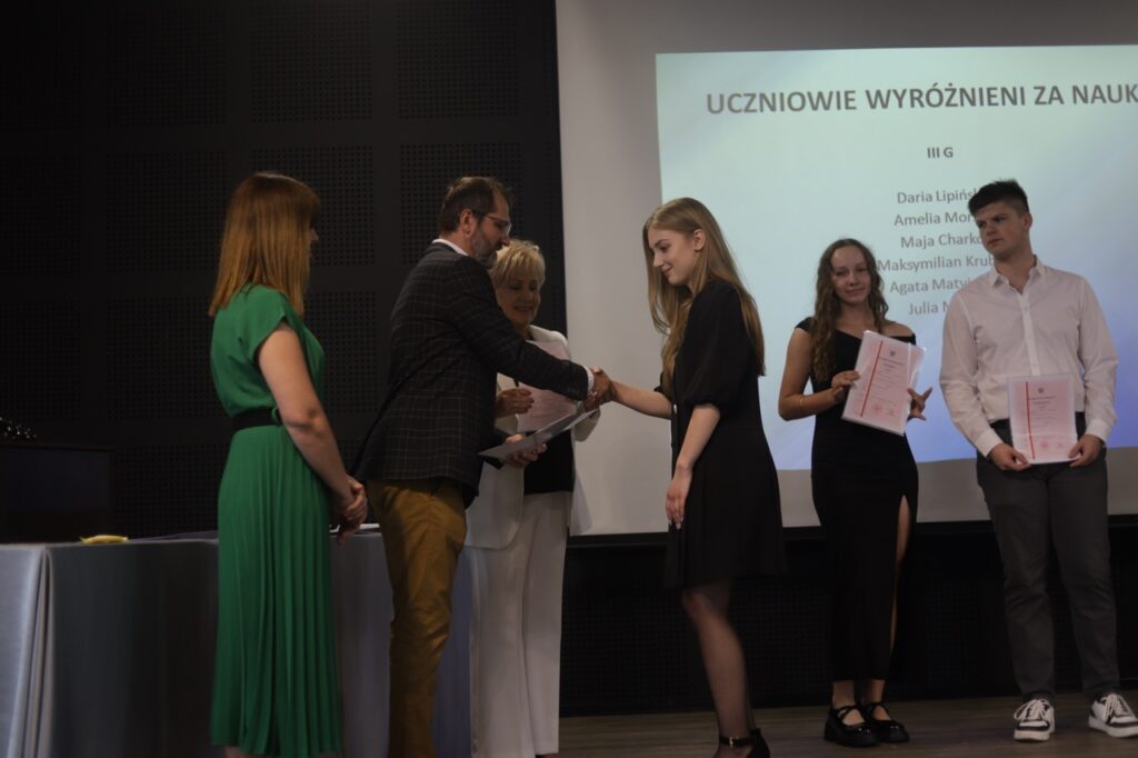 Następnie pani dyrektor podsumowała mijający rok i z wychowawcami oraz zaproszonymi gośćmi wręczyła listy gratulacyjne i karty podarunkowe licealistom, którzy otrzymali świadectwa z czerwonym paskiem, laureatom oraz finalistom olimpiad przedmiotowych i konkursów, uczniom ze 100% frekwencją oraz szczególnie aktywnie działającym na rzecz społeczności szkolnej.