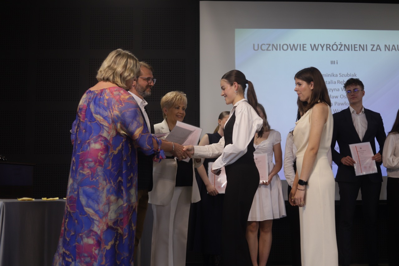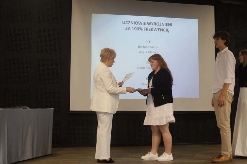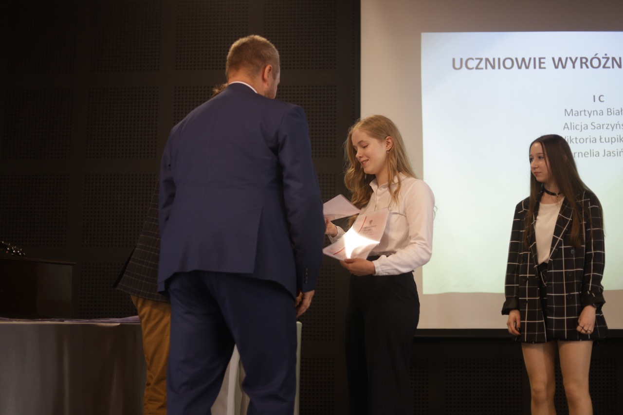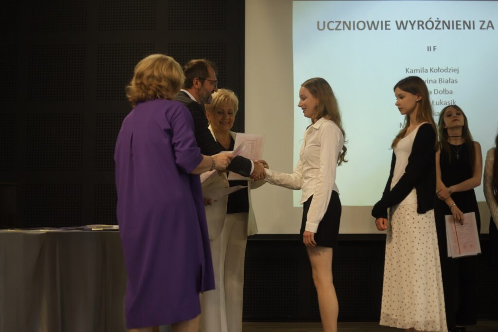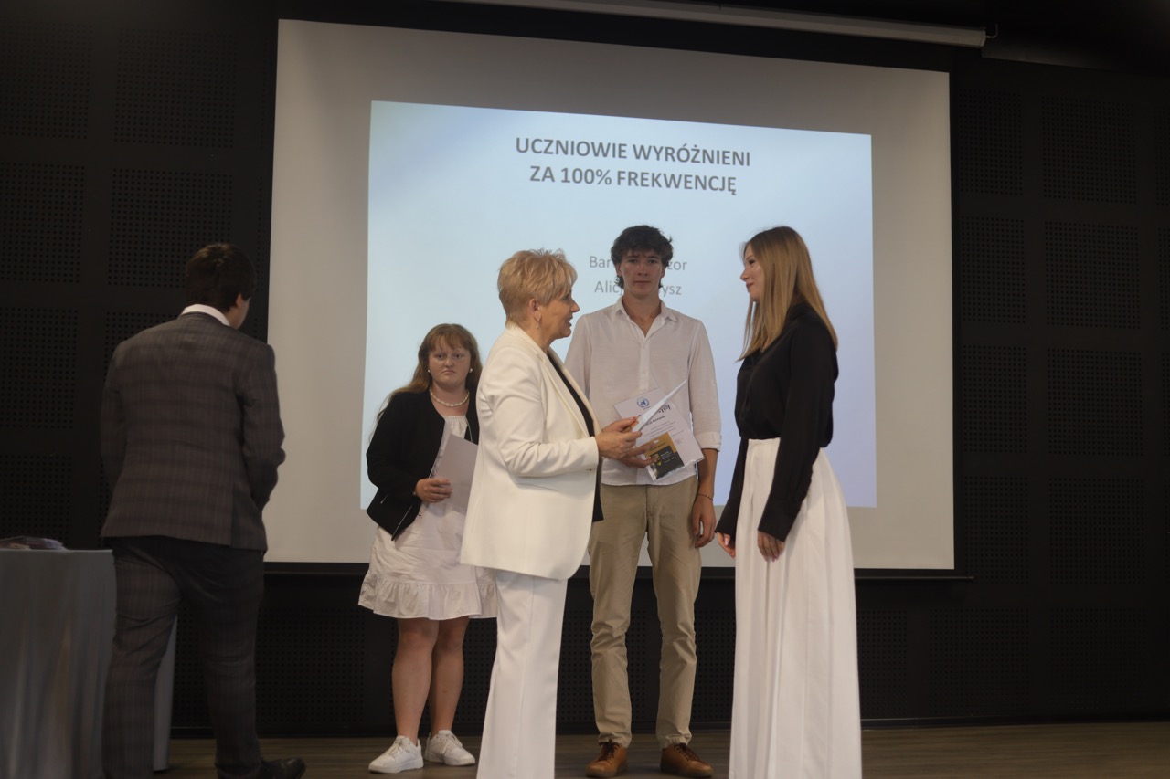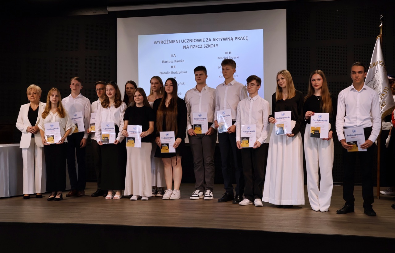 Następnie pani dyrektor podsumowała mijający rok i z wychowawcami oraz zaproszonymi gośćmi wręczyła listy gratulacyjne i karty podarunkowe licealistom, którzy otrzymali świadectwa z czerwonym paskiem, laureatom oraz finalistom olimpiad przedmiotowych i konkursów, uczniom ze 100% frekwencją oraz szczególnie aktywnie działającym na rzecz społeczności szkolnej.