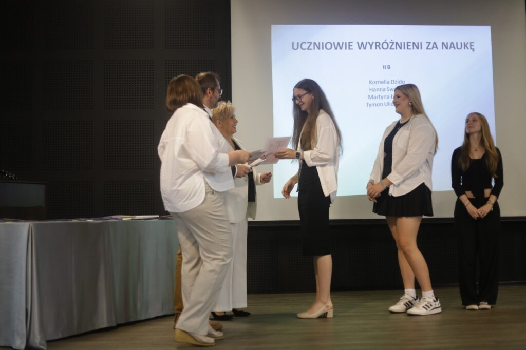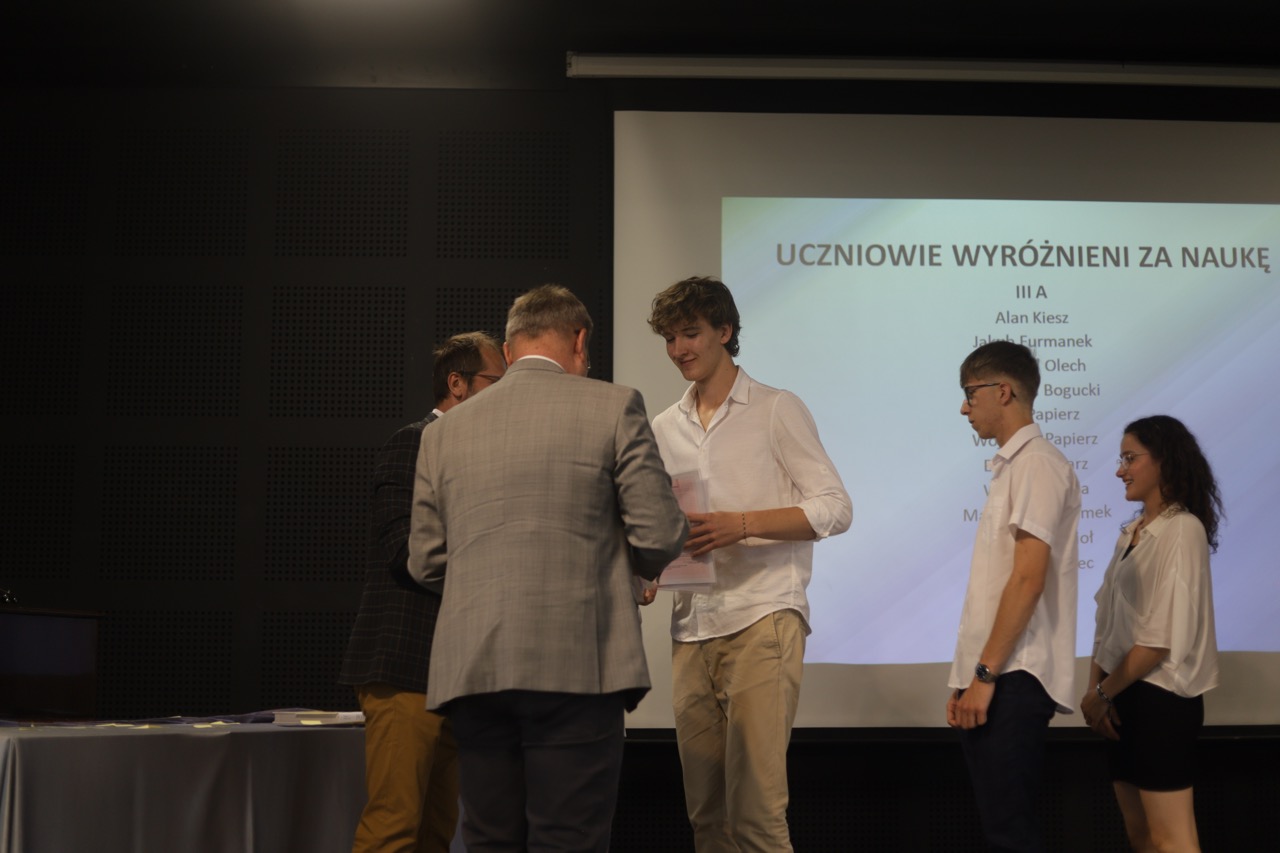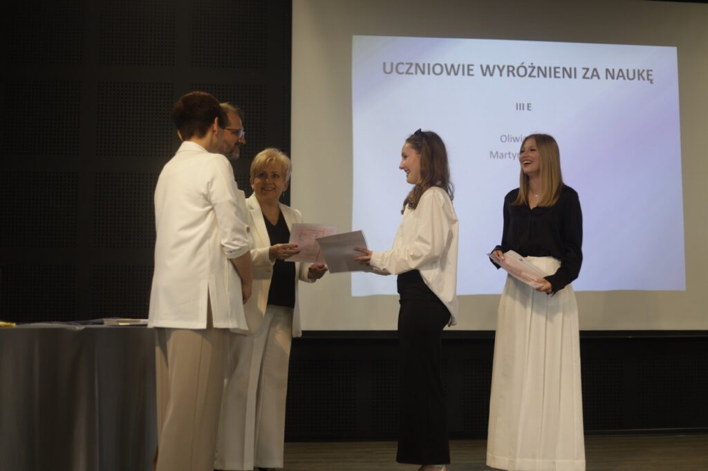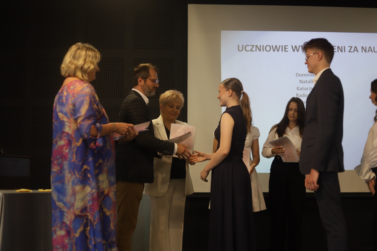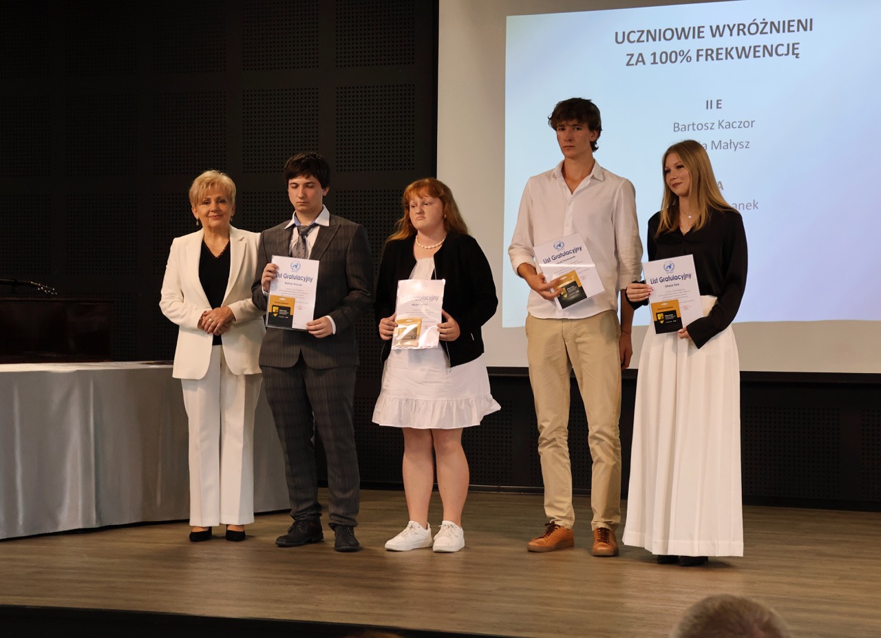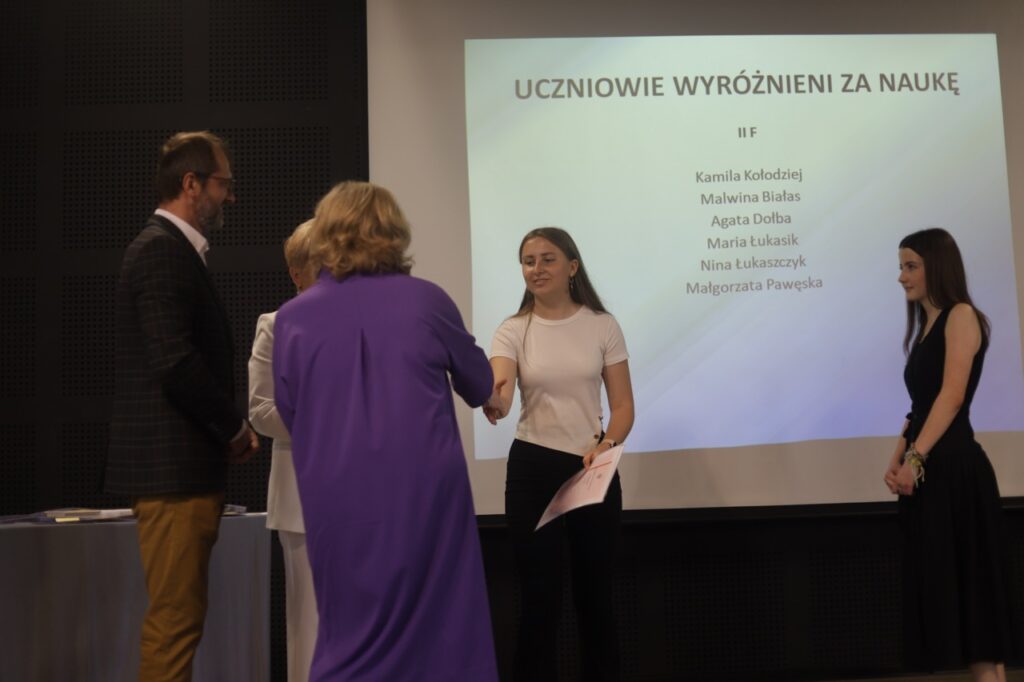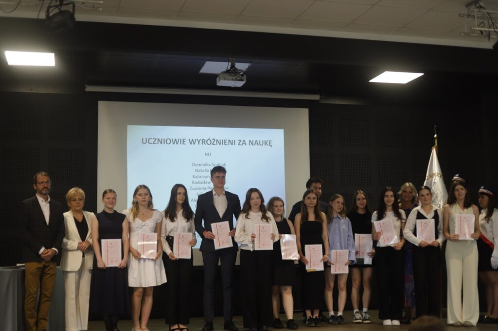 Następnie pani dyrektor podsumowała mijający rok i z wychowawcami oraz zaproszonymi gośćmi wręczyła listy gratulacyjne i karty podarunkowe licealistom, którzy otrzymali świadectwa z czerwonym paskiem, laureatom oraz finalistom olimpiad przedmiotowych i konkursów, uczniom ze 100% frekwencją oraz szczególnie aktywnie działającym na rzecz społeczności szkolnej.
