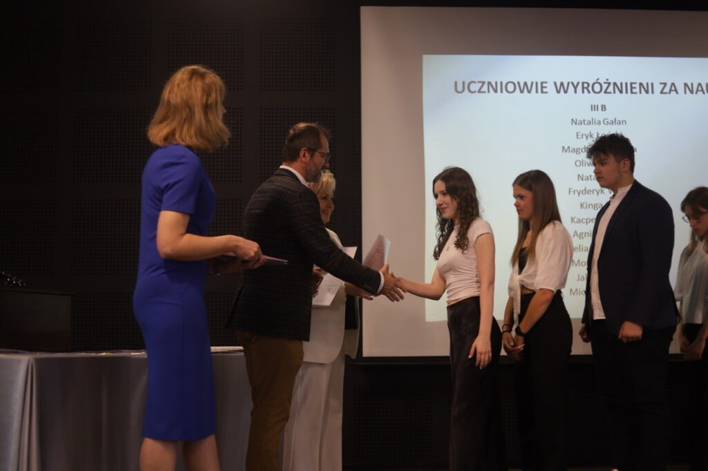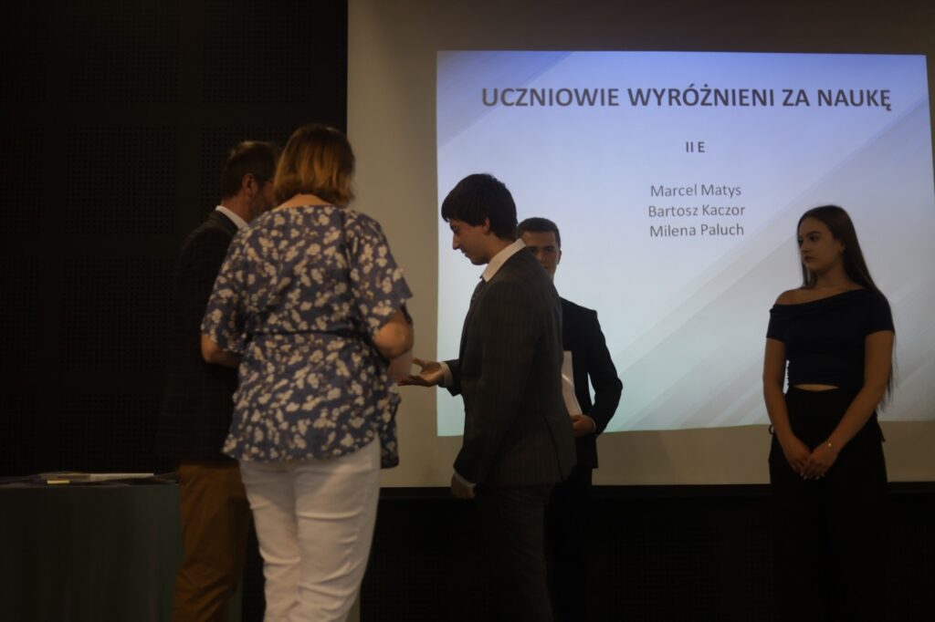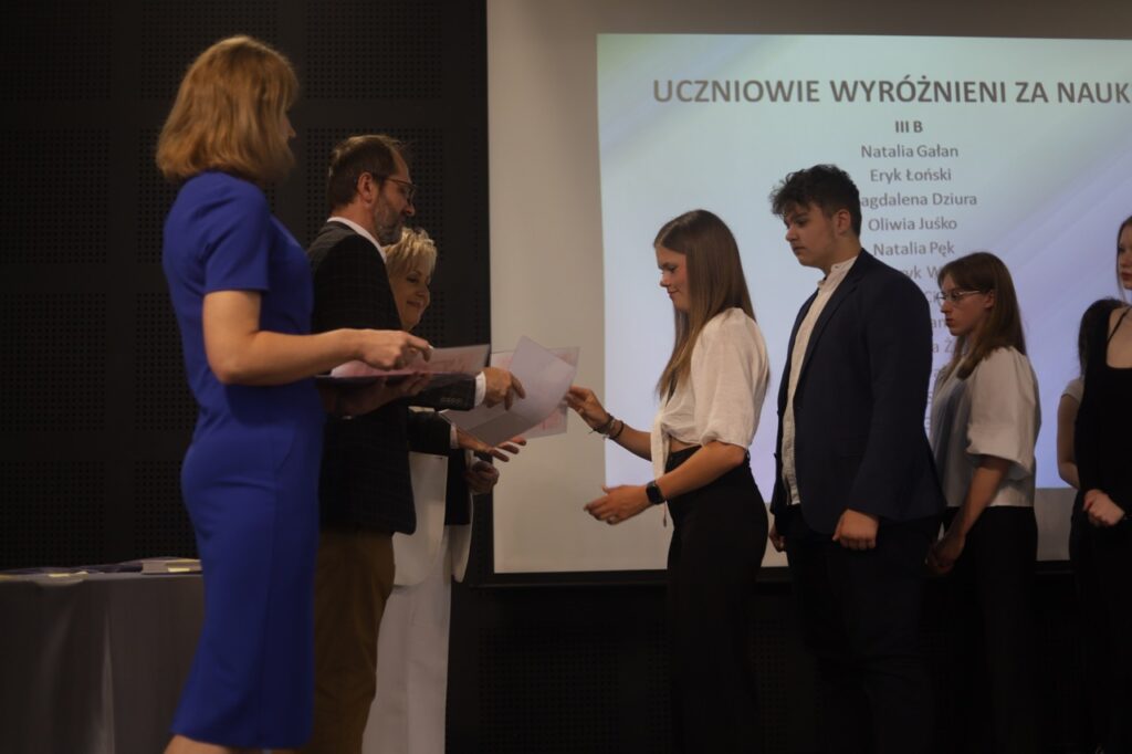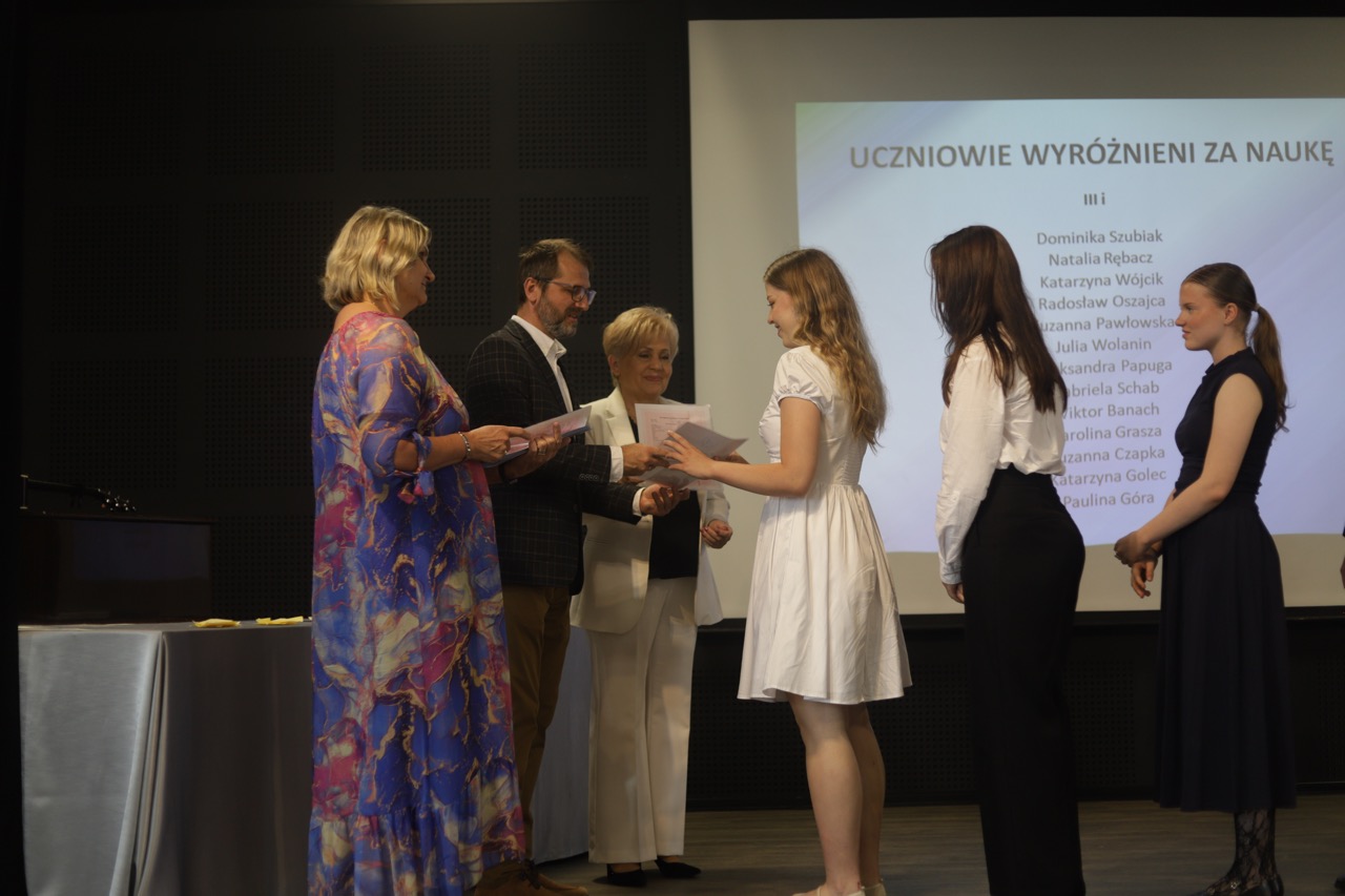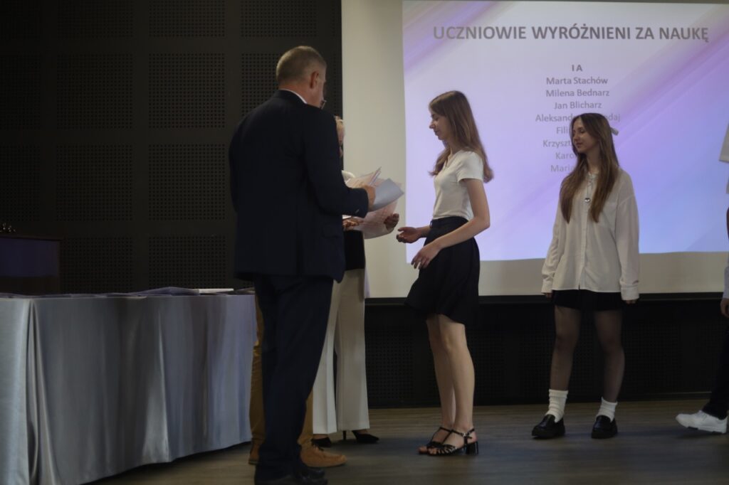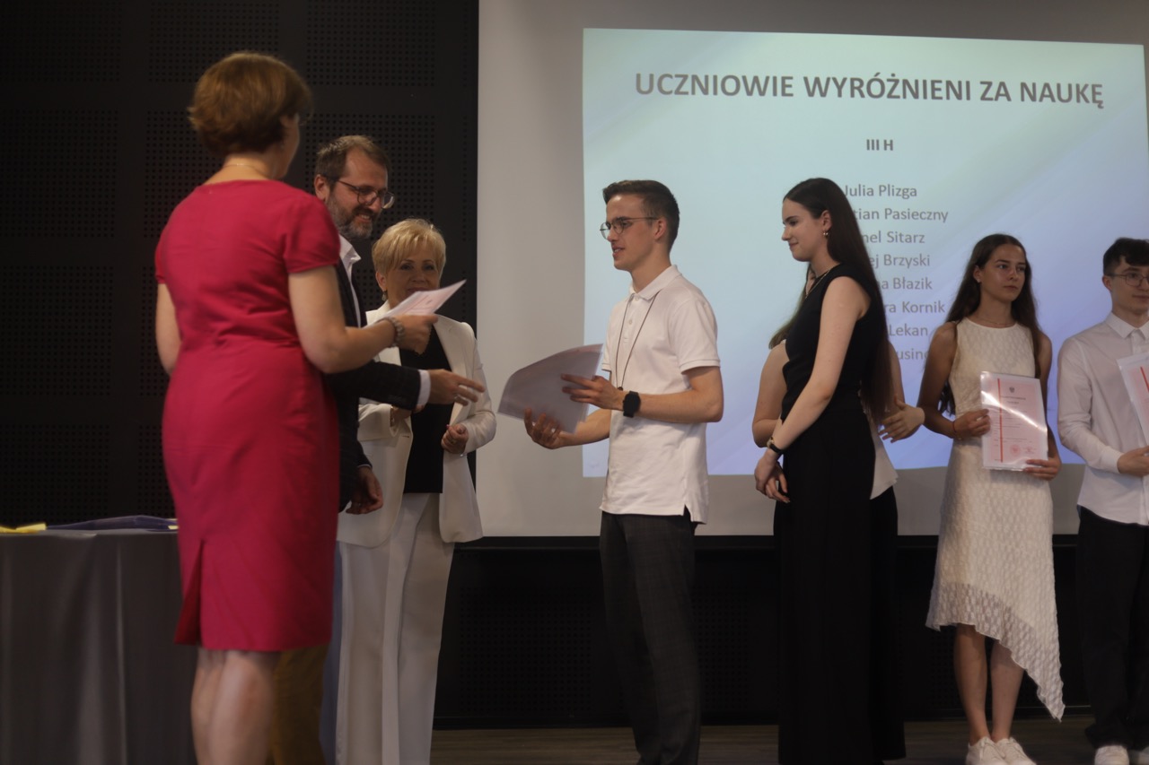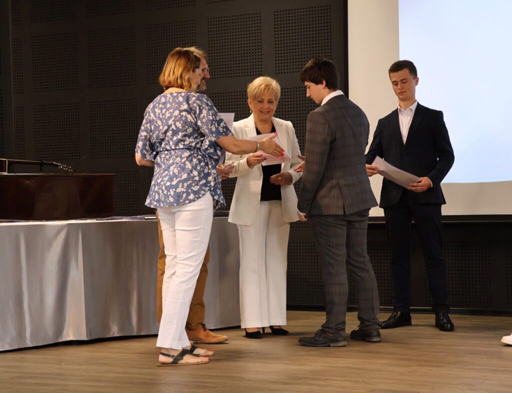 Następnie pani dyrektor podsumowała mijający rok i z wychowawcami oraz zaproszonymi gośćmi wręczyła listy gratulacyjne i karty podarunkowe licealistom, którzy otrzymali świadectwa z czerwonym paskiem, laureatom oraz finalistom olimpiad przedmiotowych i konkursów, uczniom ze 100% frekwencją oraz szczególnie aktywnie działającym na rzecz społeczności szkolnej.