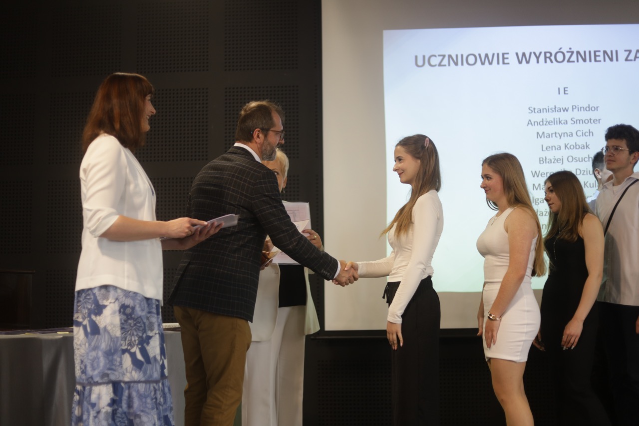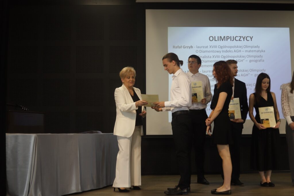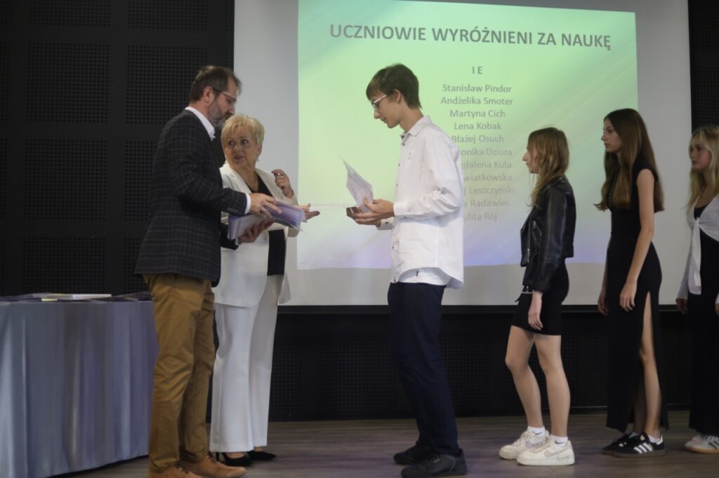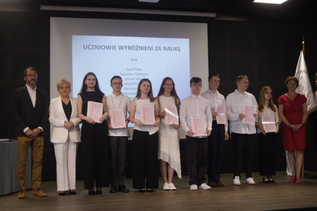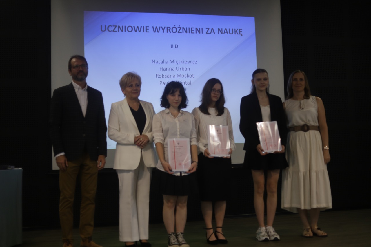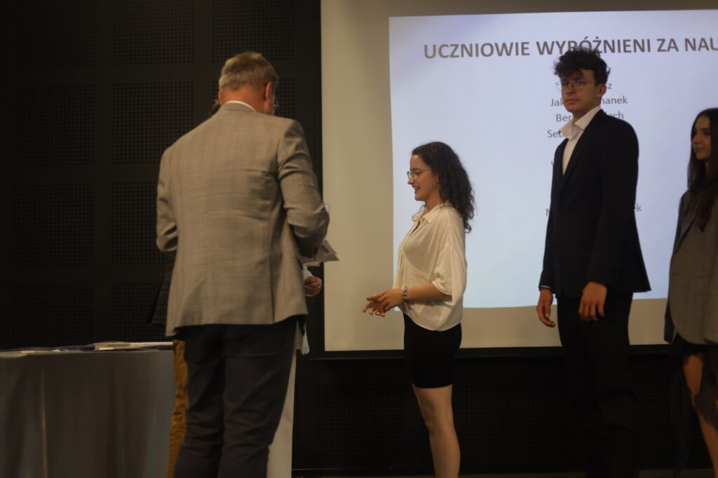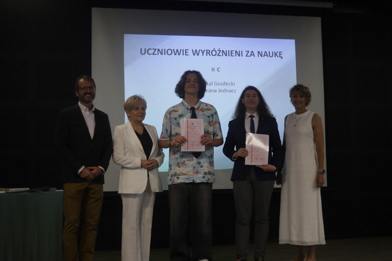 Następnie pani dyrektor podsumowała mijający rok i z wychowawcami oraz zaproszonymi gośćmi wręczyła listy gratulacyjne i karty podarunkowe licealistom, którzy otrzymali świadectwa z czerwonym paskiem, laureatom oraz finalistom olimpiad przedmiotowych i konkursów, uczniom ze 100% frekwencją oraz szczególnie aktywnie działającym na rzecz społeczności szkolnej.