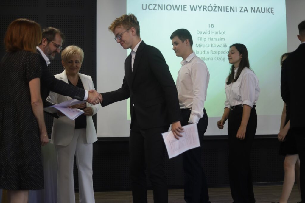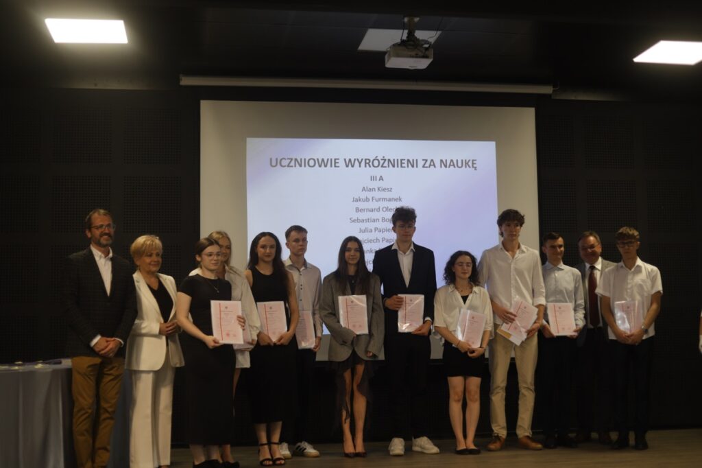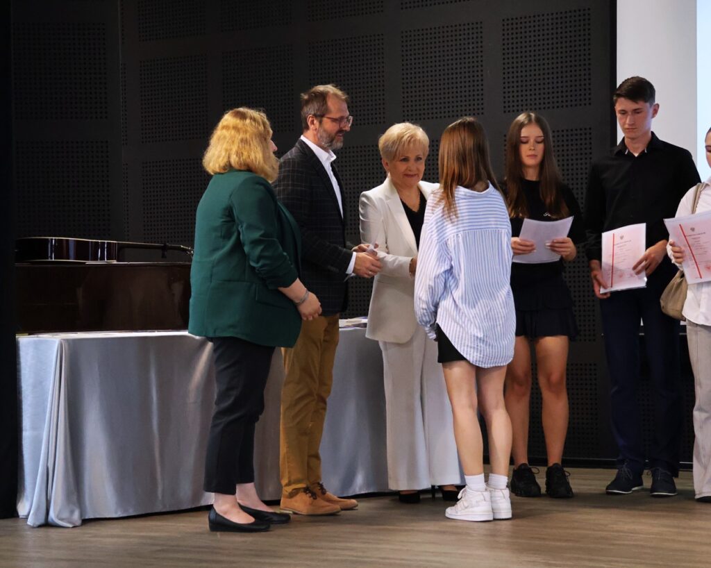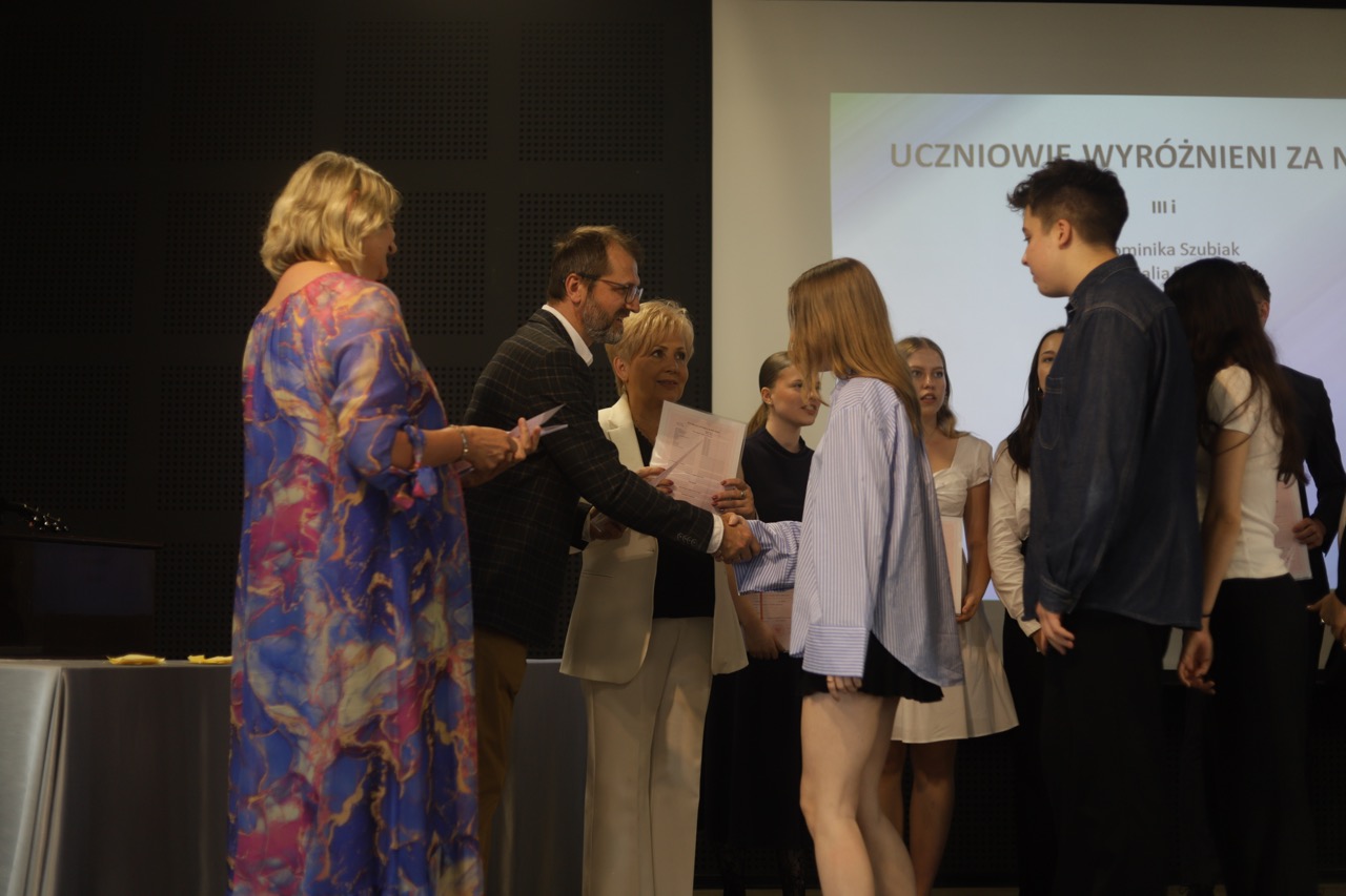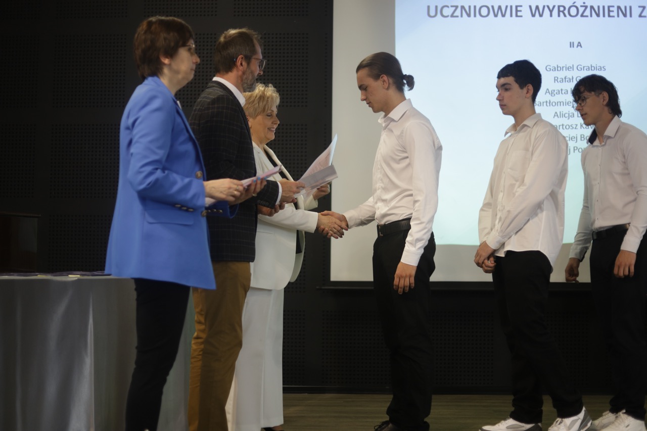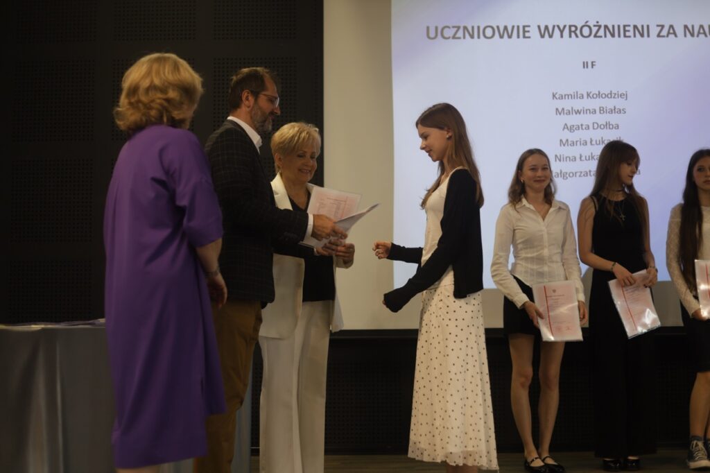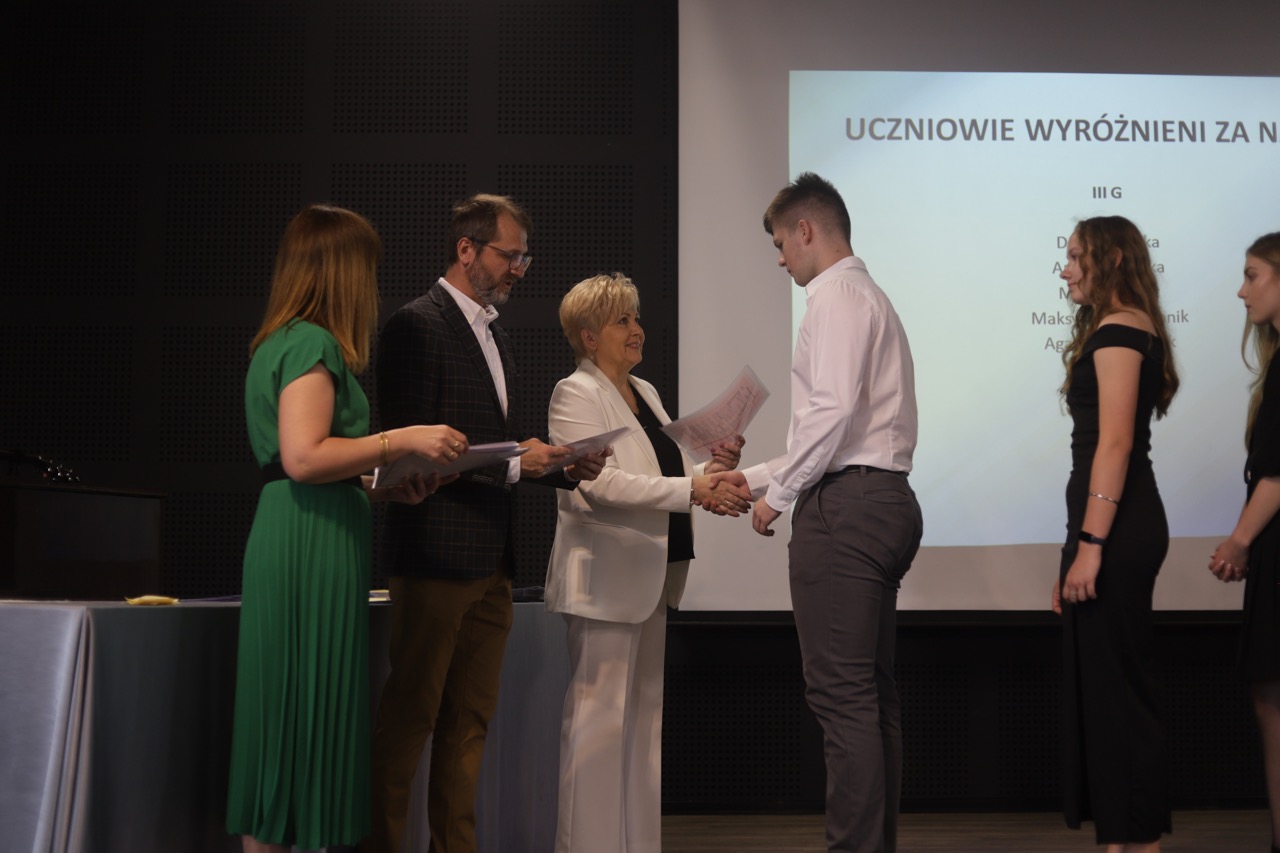 Następnie pani dyrektor podsumowała mijający rok i z wychowawcami oraz zaproszonymi gośćmi wręczyła listy gratulacyjne i karty podarunkowe licealistom, którzy otrzymali świadectwa z czerwonym paskiem, laureatom oraz finalistom olimpiad przedmiotowych i konkursów, uczniom ze 100% frekwencją oraz szczególnie aktywnie działającym na rzecz społeczności szkolnej.