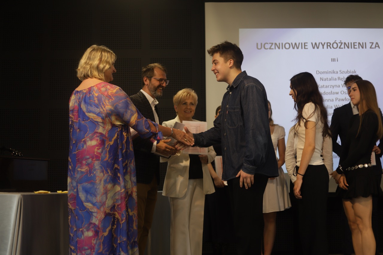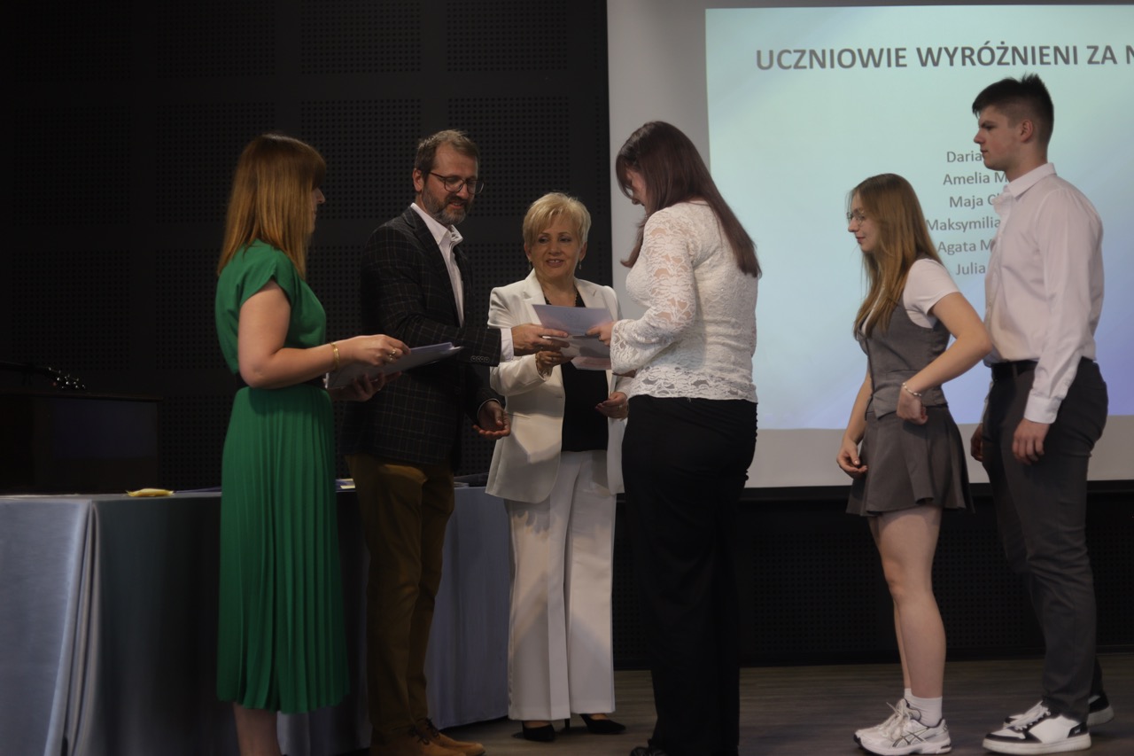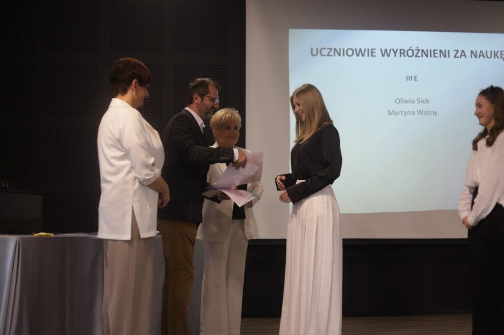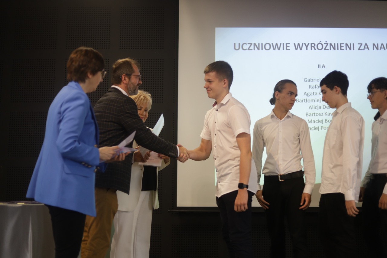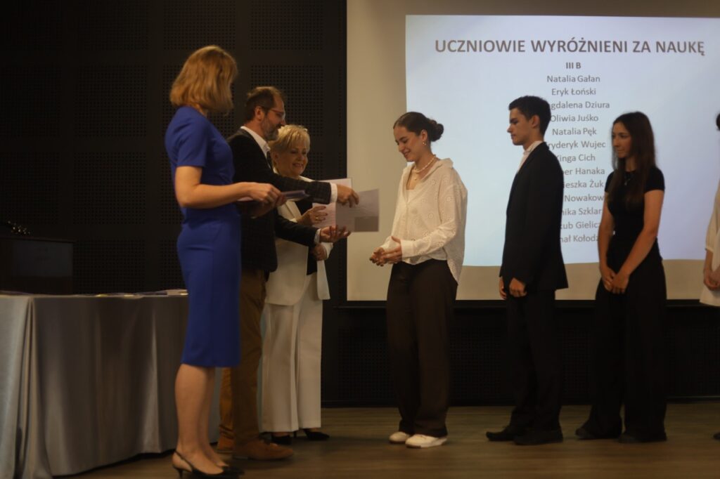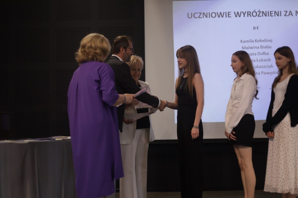 Następnie pani dyrektor podsumowała mijający rok i z wychowawcami oraz zaproszonymi gośćmi wręczyła listy gratulacyjne i karty podarunkowe licealistom, którzy otrzymali świadectwa z czerwonym paskiem, laureatom oraz finalistom olimpiad przedmiotowych i konkursów, uczniom ze 100% frekwencją oraz szczególnie aktywnie działającym na rzecz społeczności szkolnej.