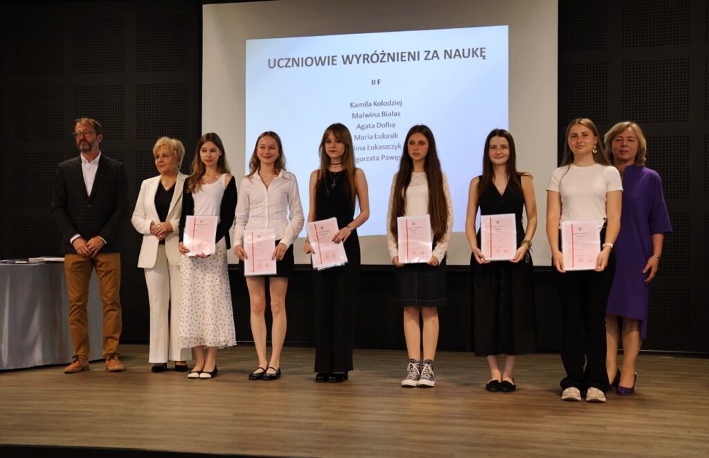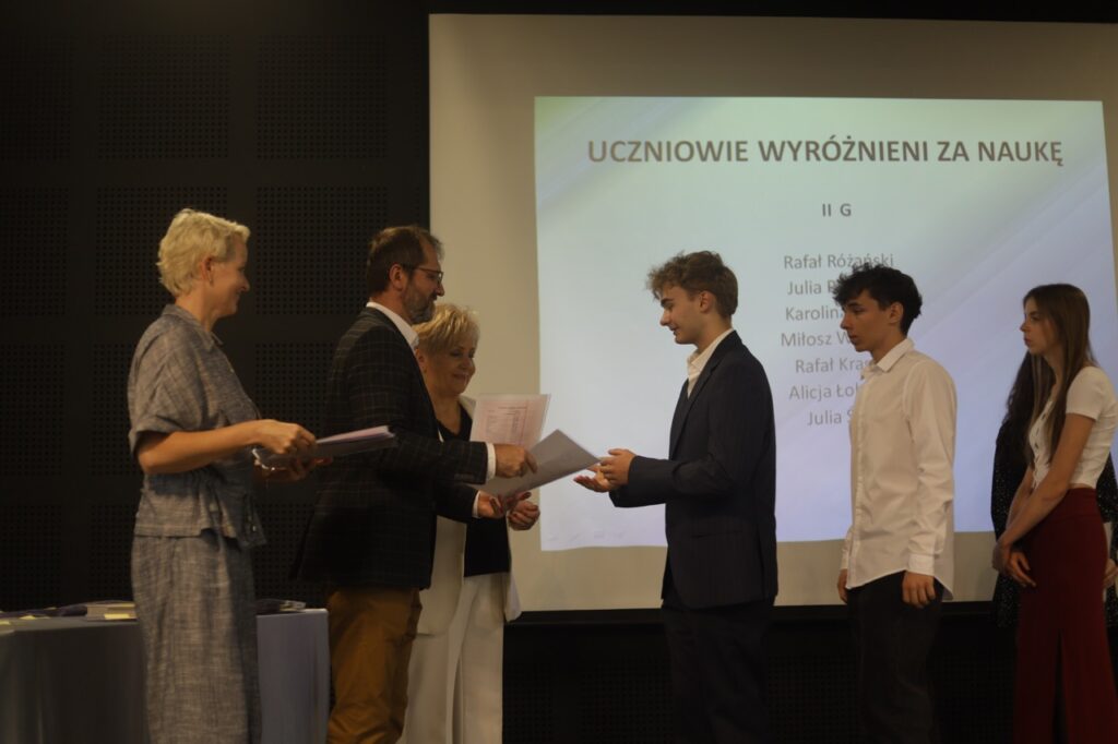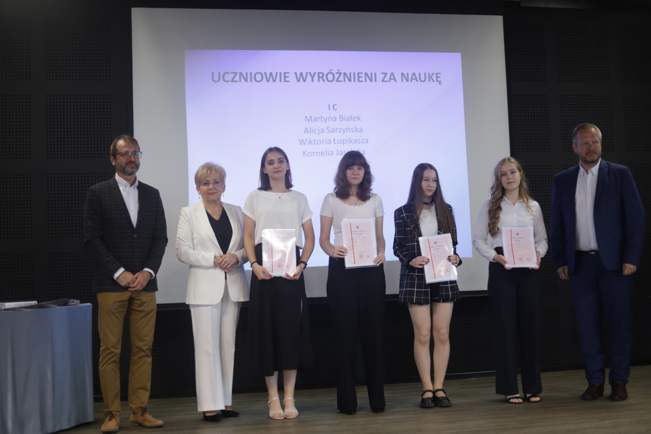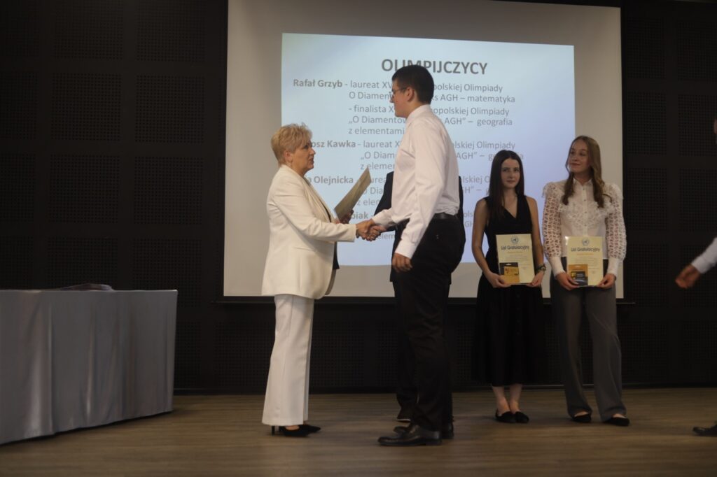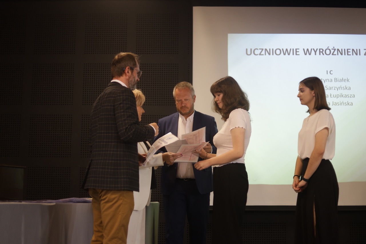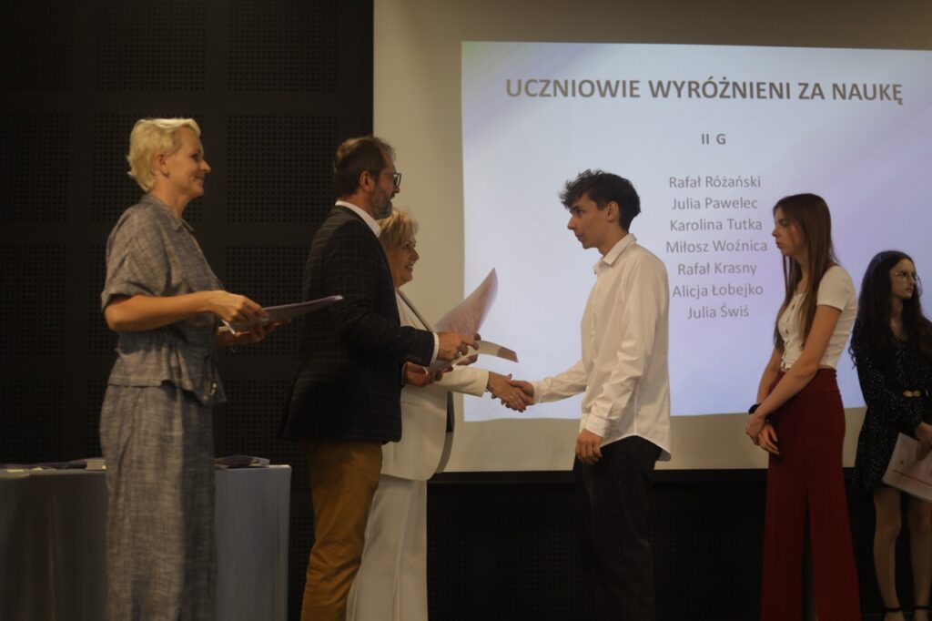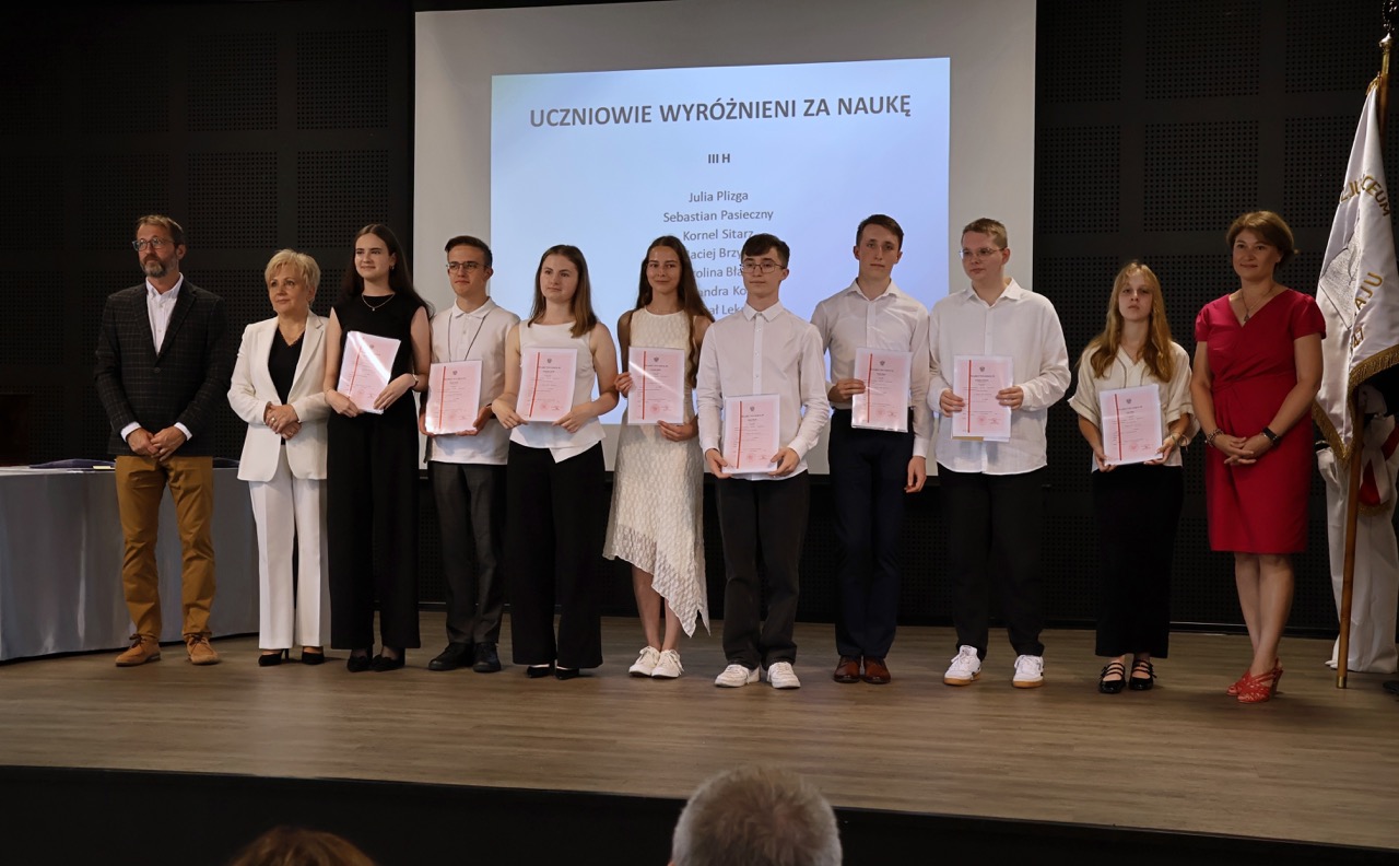 Następnie pani dyrektor podsumowała mijający rok i z wychowawcami oraz zaproszonymi gośćmi wręczyła listy gratulacyjne i karty podarunkowe licealistom, którzy otrzymali świadectwa z czerwonym paskiem, laureatom oraz finalistom olimpiad przedmiotowych i konkursów, uczniom ze 100% frekwencją oraz szczególnie aktywnie działającym na rzecz społeczności szkolnej.