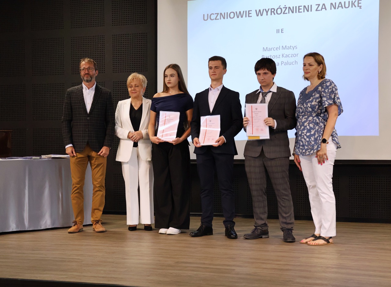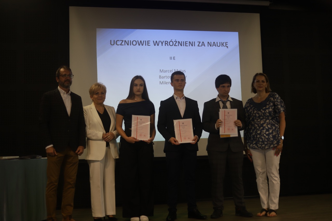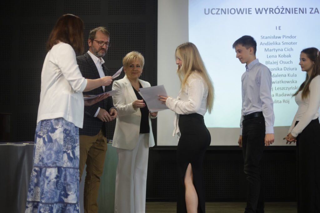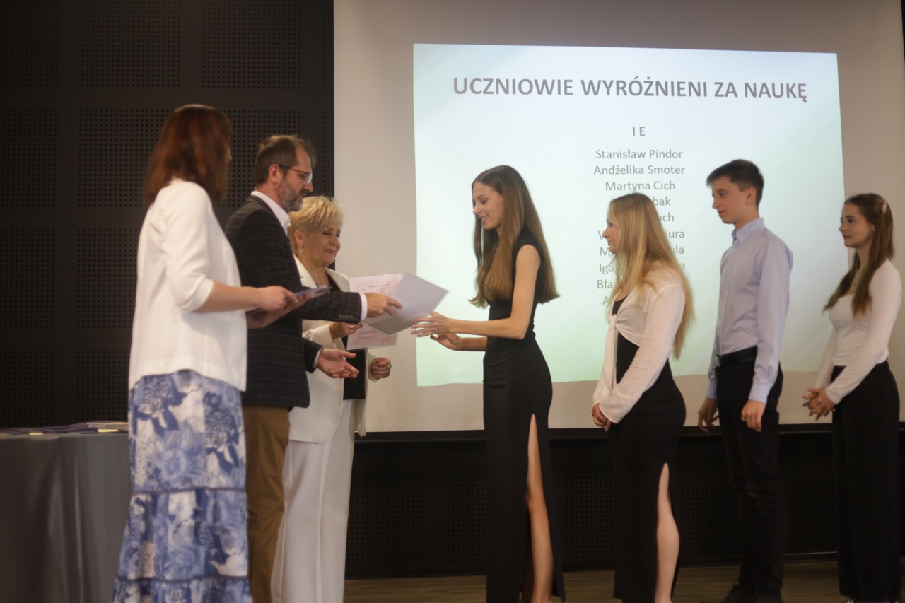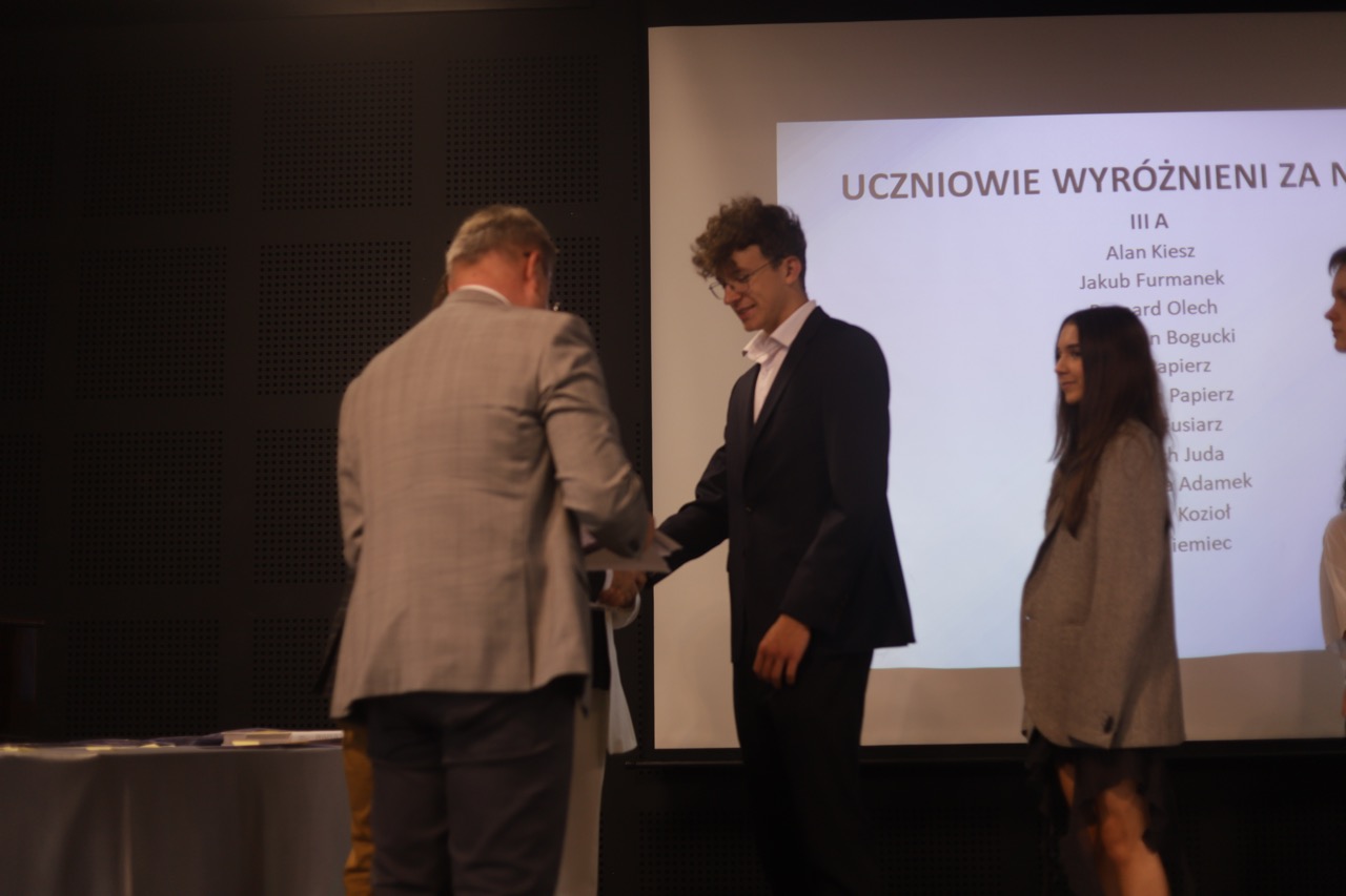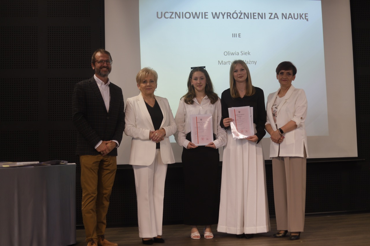 Następnie pani dyrektor podsumowała mijający rok i z wychowawcami oraz zaproszonymi gośćmi wręczyła listy gratulacyjne i karty podarunkowe licealistom, którzy otrzymali świadectwa z czerwonym paskiem, laureatom oraz finalistom olimpiad przedmiotowych i konkursów, uczniom ze 100% frekwencją oraz szczególnie aktywnie działającym na rzecz społeczności szkolnej.