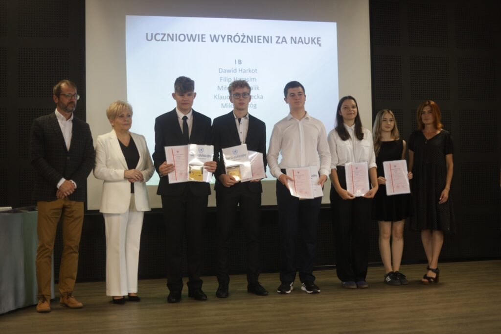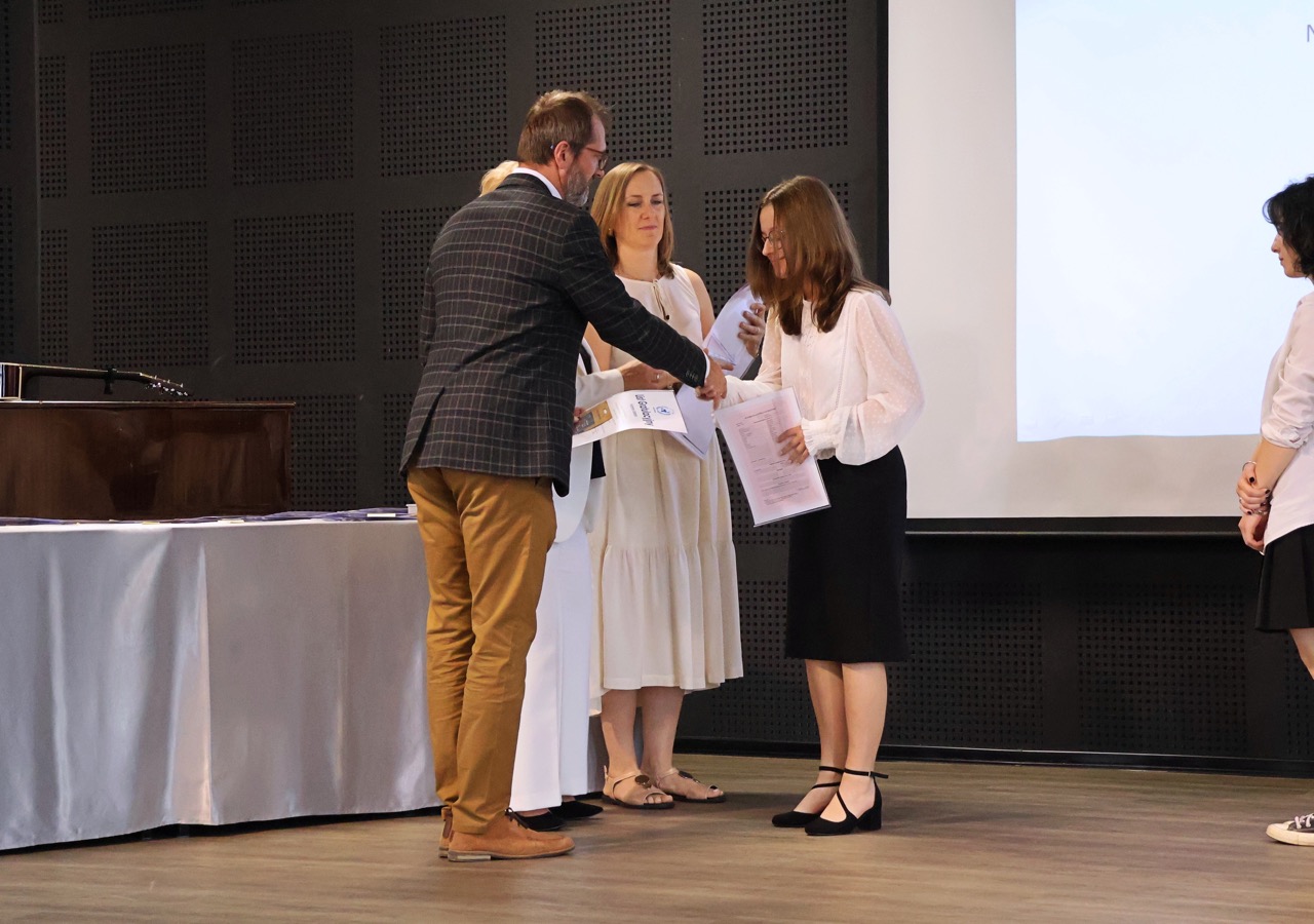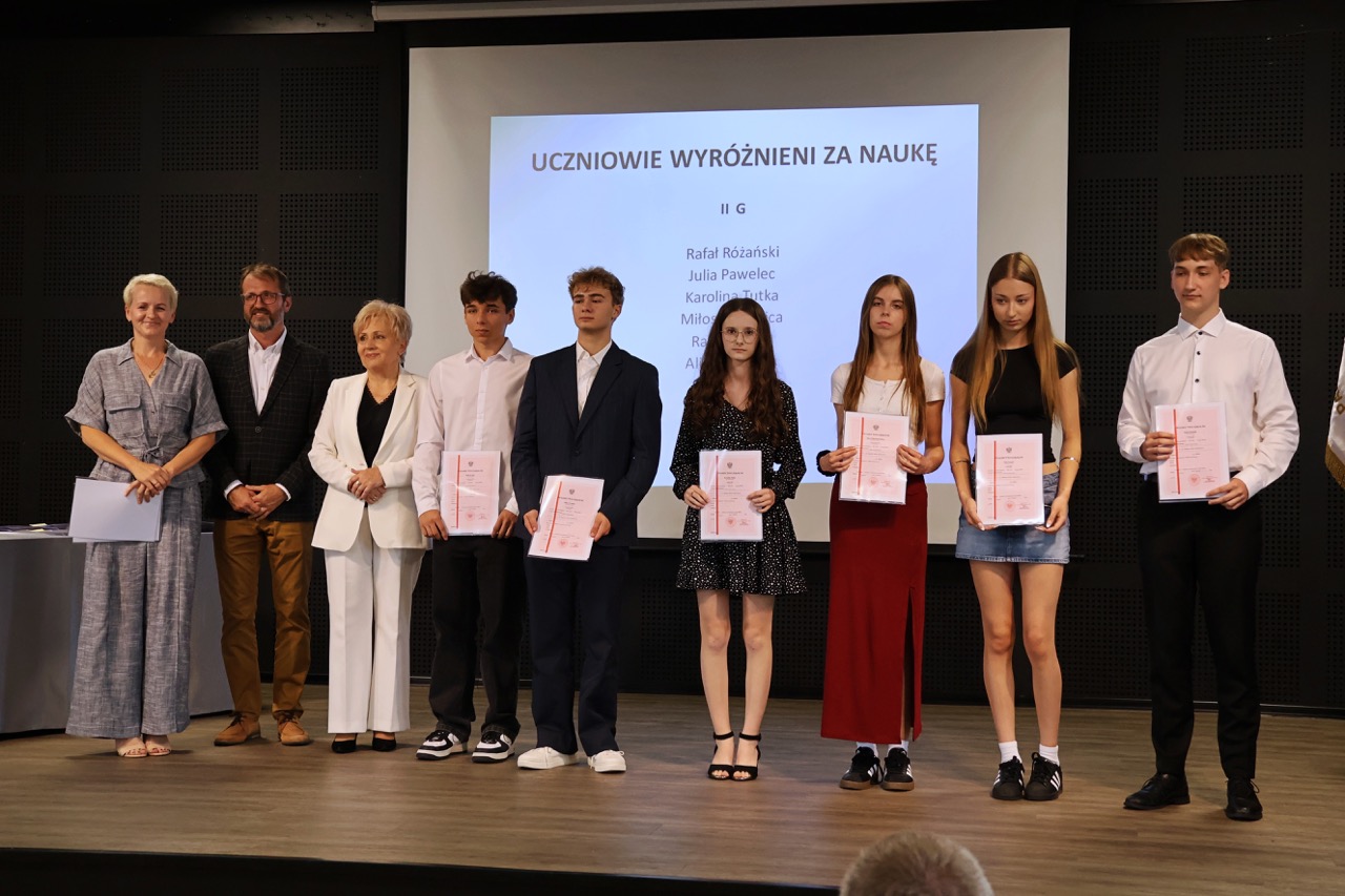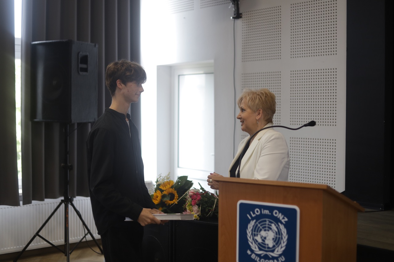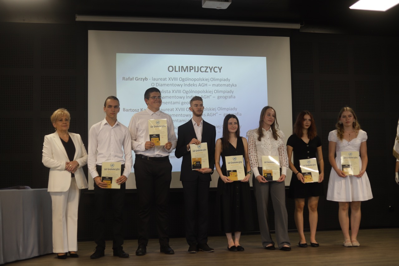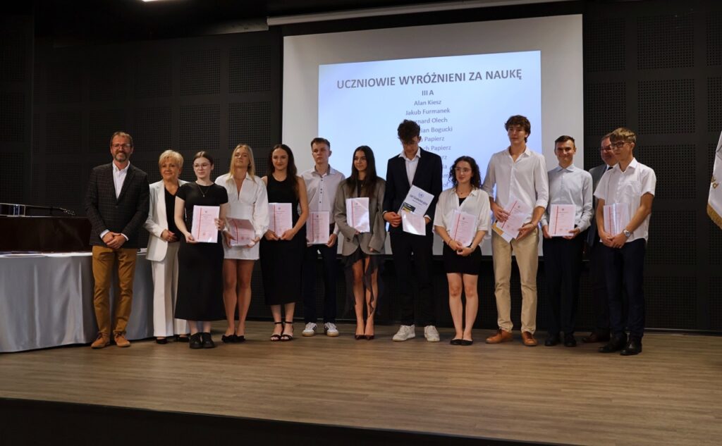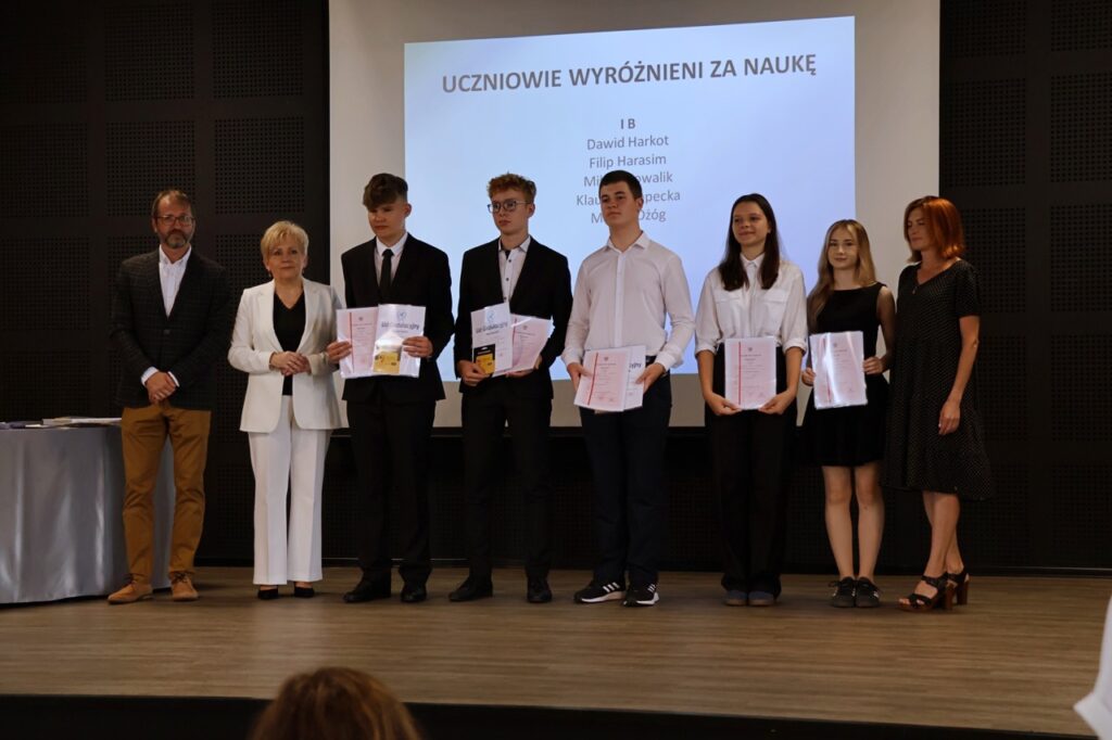 Następnie pani dyrektor podsumowała mijający rok i z wychowawcami oraz zaproszonymi gośćmi wręczyła listy gratulacyjne i karty podarunkowe licealistom, którzy otrzymali świadectwa z czerwonym paskiem, laureatom oraz finalistom olimpiad przedmiotowych i konkursów, uczniom ze 100% frekwencją oraz szczególnie aktywnie działającym na rzecz społeczności szkolnej.