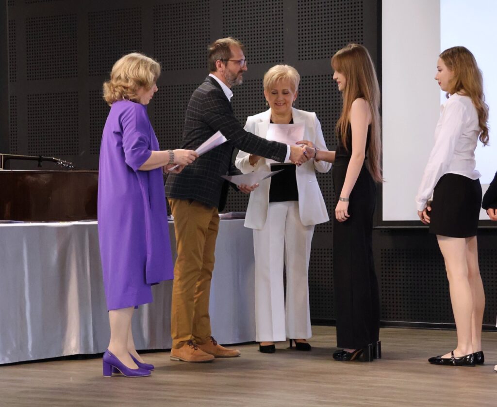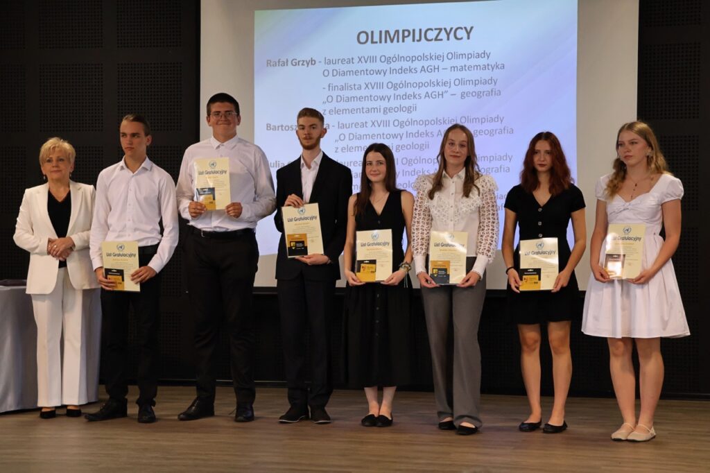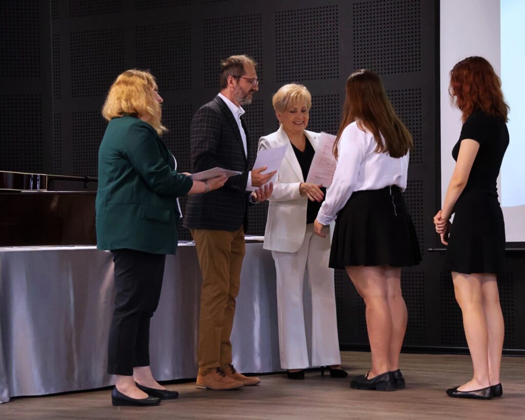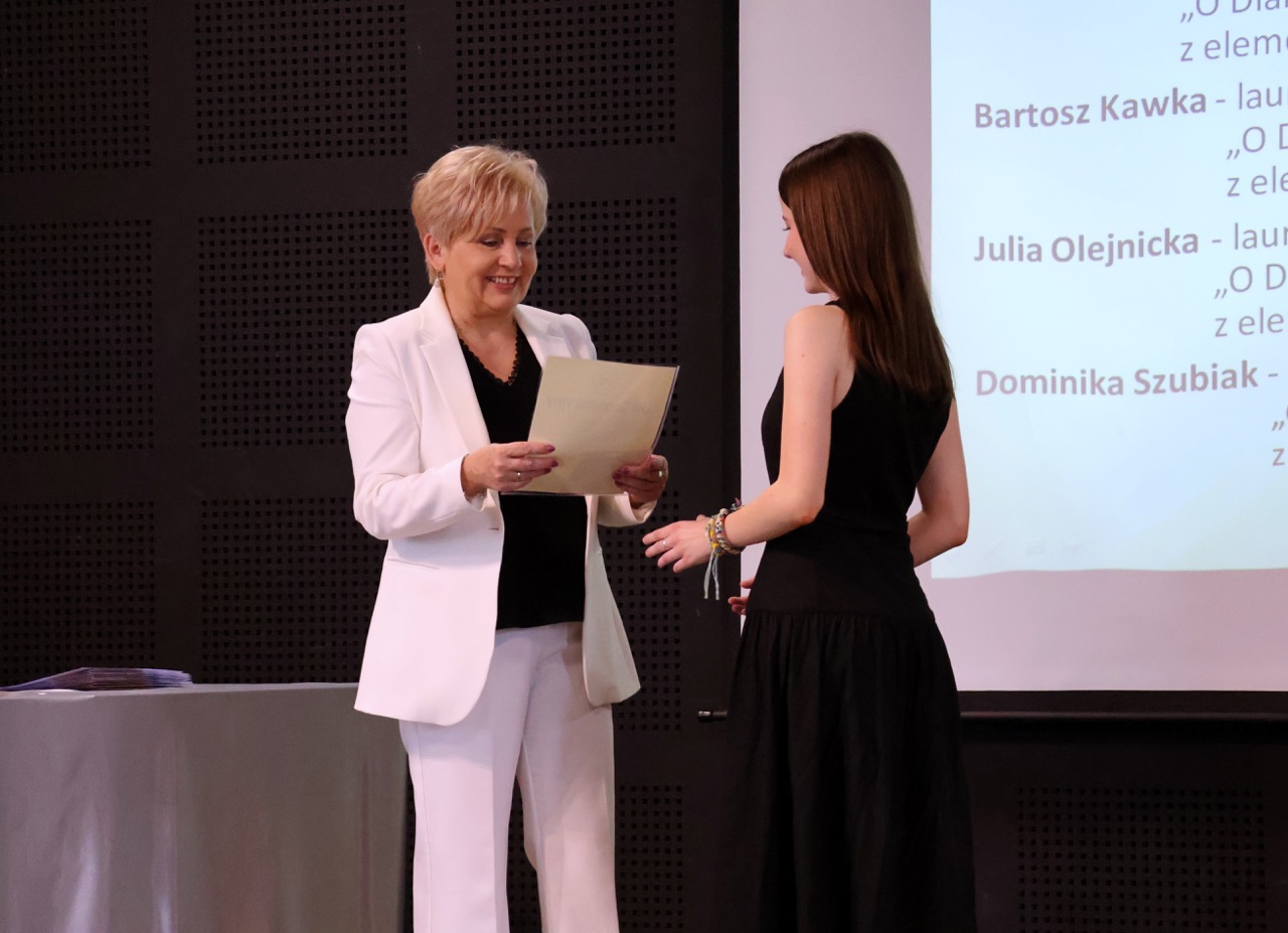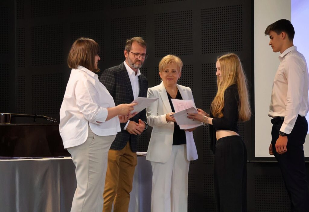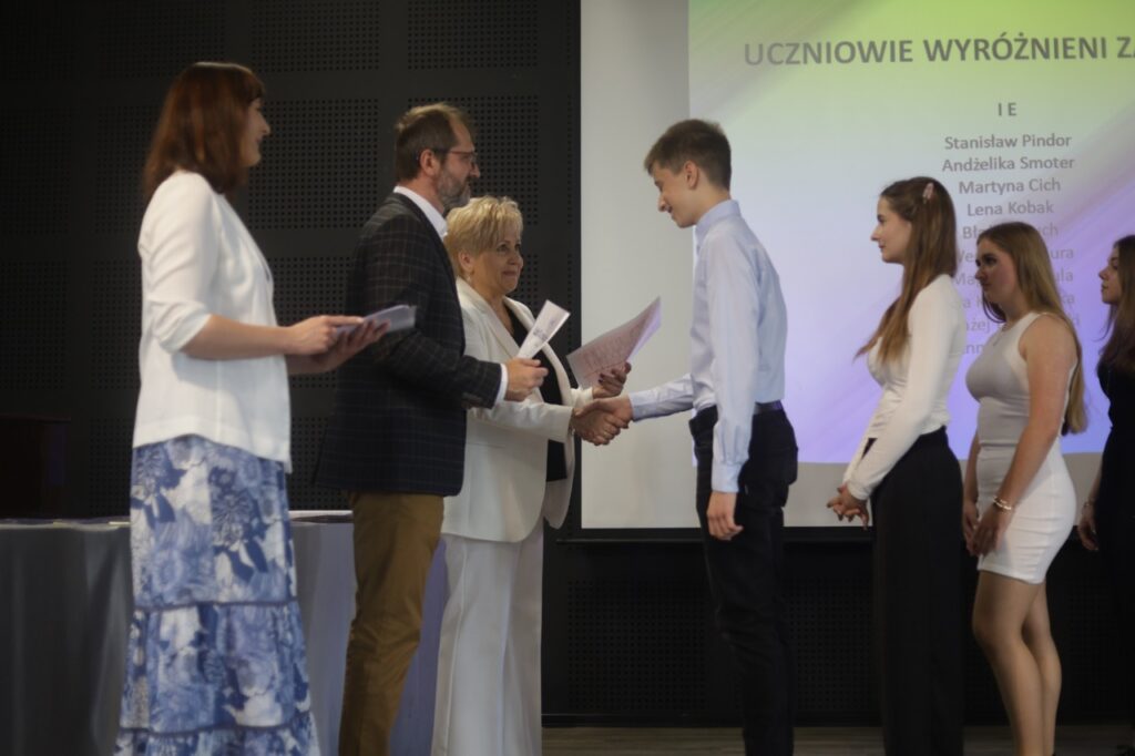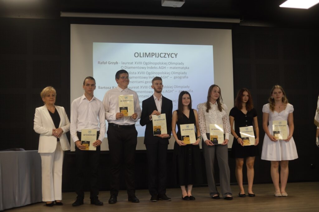 Następnie pani dyrektor podsumowała mijający rok i z wychowawcami oraz zaproszonymi gośćmi wręczyła listy gratulacyjne i karty podarunkowe licealistom, którzy otrzymali świadectwa z czerwonym paskiem, laureatom oraz finalistom olimpiad przedmiotowych i konkursów, uczniom ze 100% frekwencją oraz szczególnie aktywnie działającym na rzecz społeczności szkolnej.
