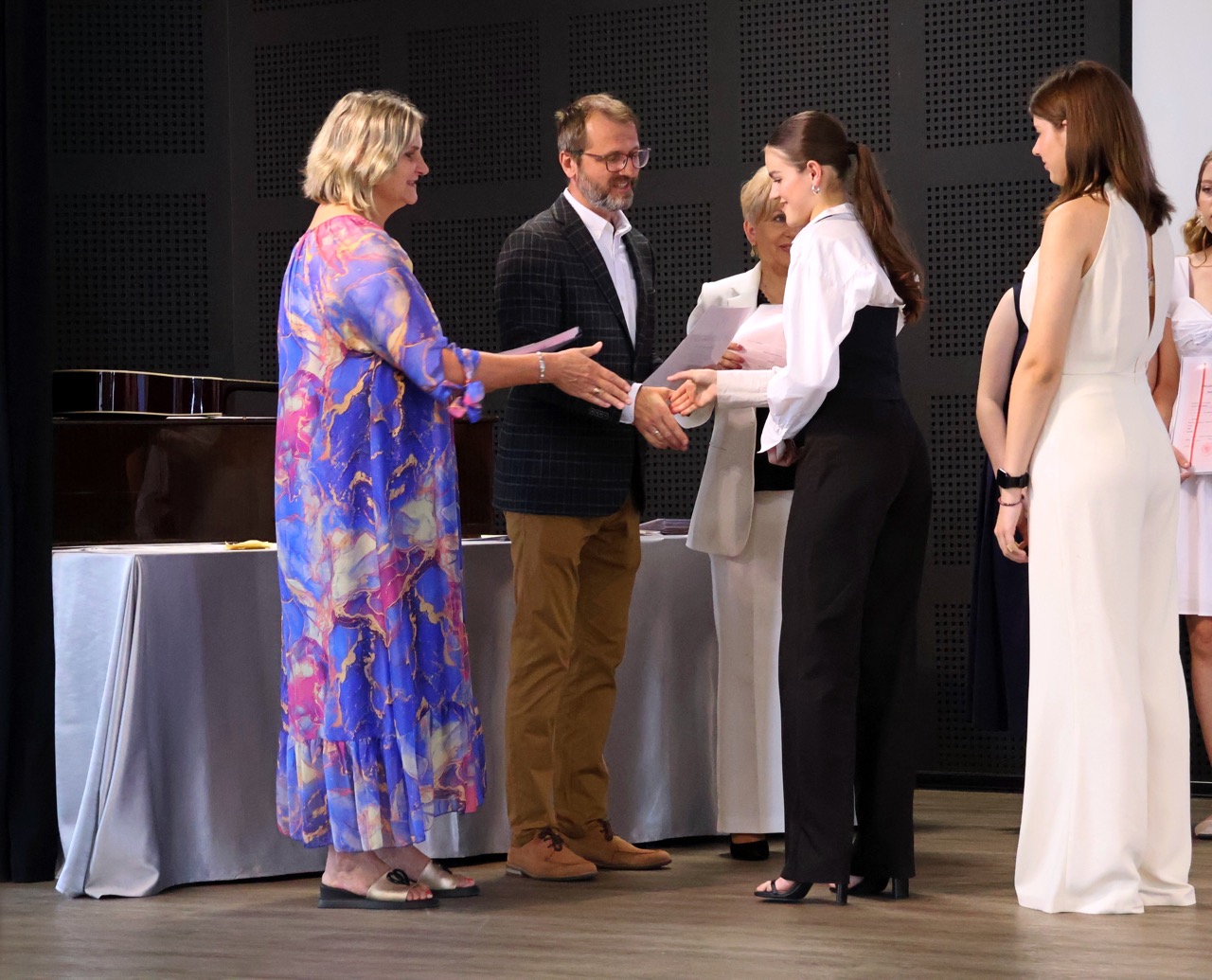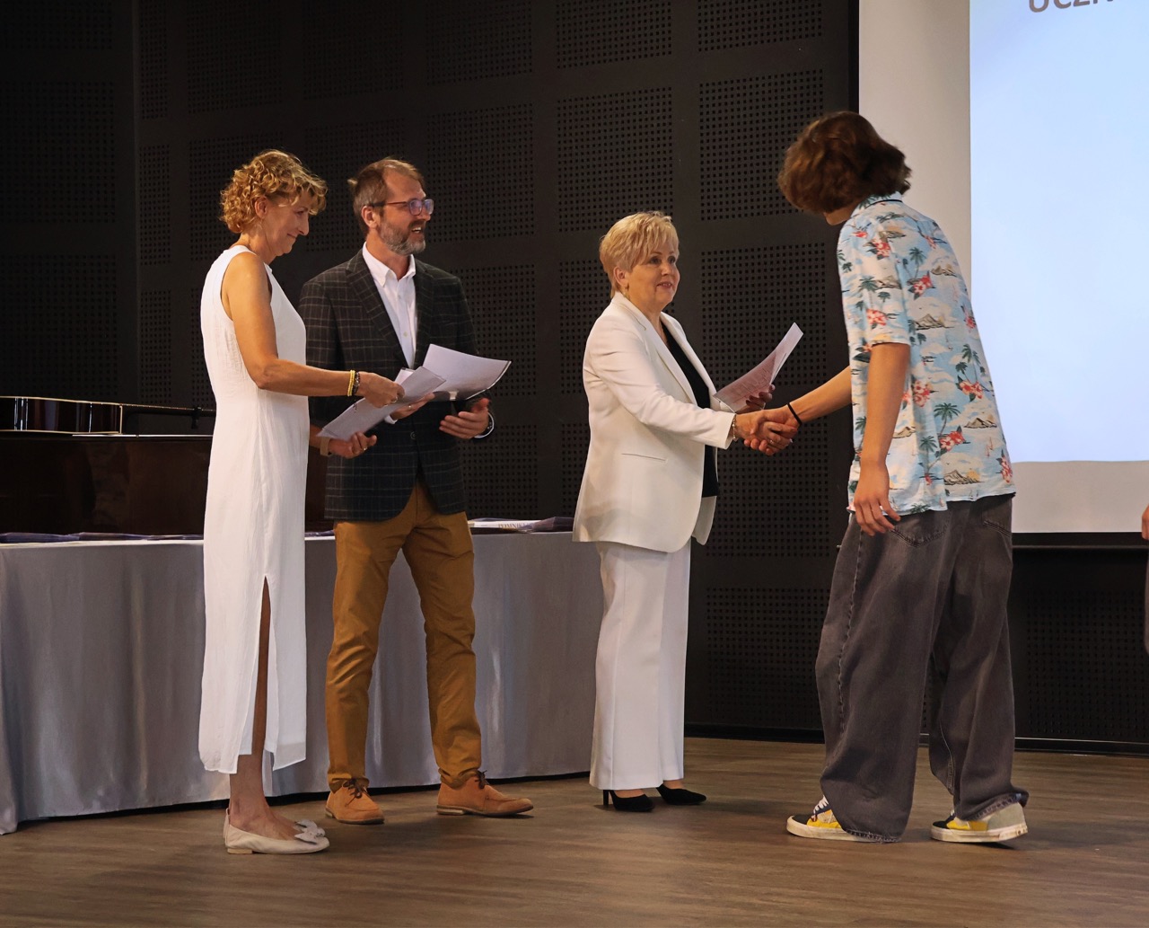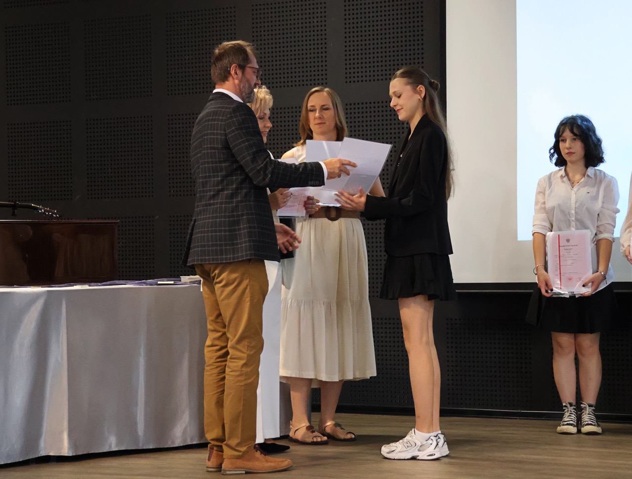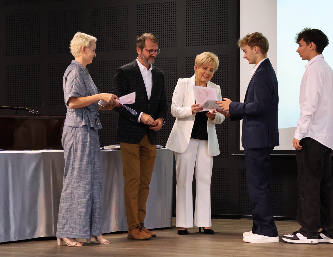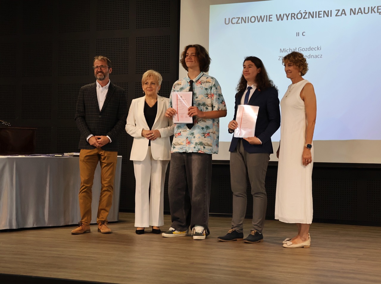 Następnie pani dyrektor podsumowała mijający rok i z wychowawcami oraz zaproszonymi gośćmi wręczyła listy gratulacyjne i karty podarunkowe licealistom, którzy otrzymali świadectwa z czerwonym paskiem, laureatom oraz finalistom olimpiad przedmiotowych i konkursów, uczniom ze 100% frekwencją oraz szczególnie aktywnie działającym na rzecz społeczności szkolnej.