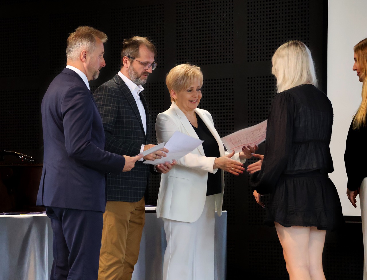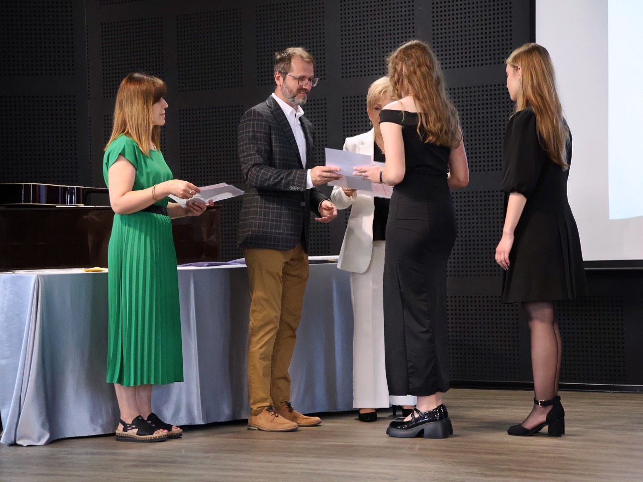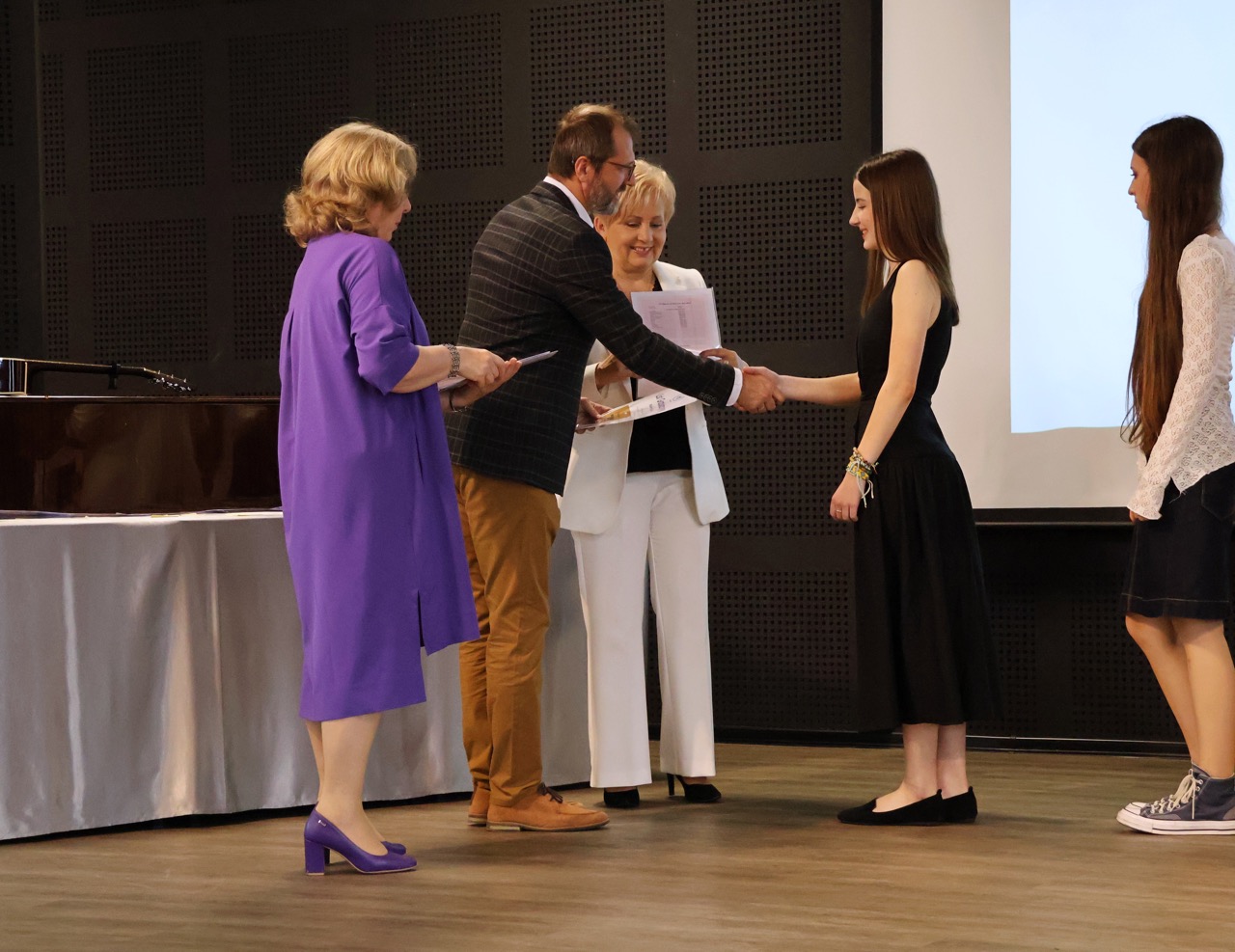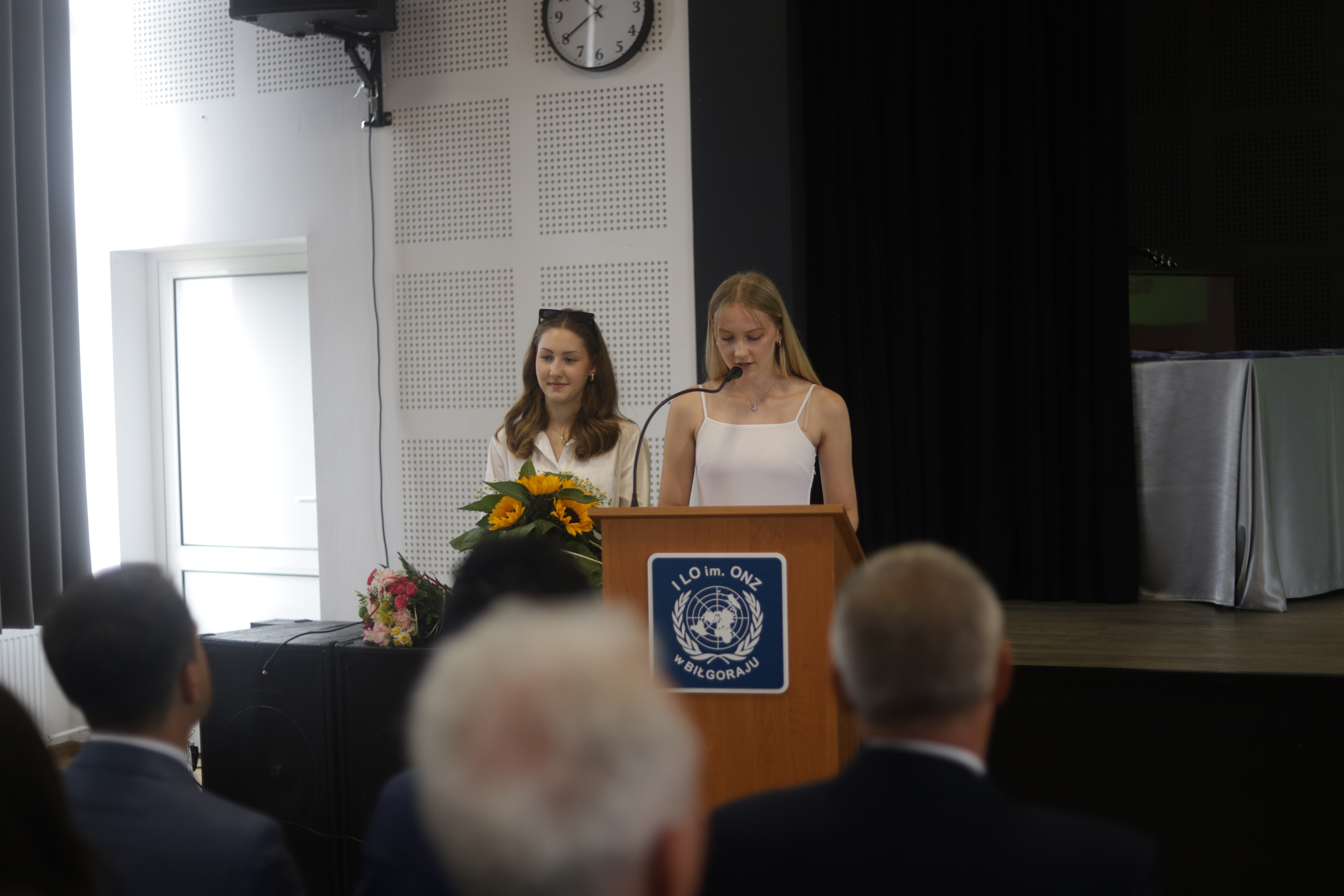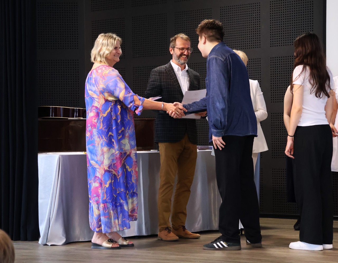 Następnie pani dyrektor podsumowała mijający rok i z wychowawcami oraz zaproszonymi gośćmi wręczyła listy gratulacyjne i karty podarunkowe licealistom, którzy otrzymali świadectwa z czerwonym paskiem, laureatom oraz finalistom olimpiad przedmiotowych i konkursów, uczniom ze 100% frekwencją oraz szczególnie aktywnie działającym na rzecz społeczności szkolnej.