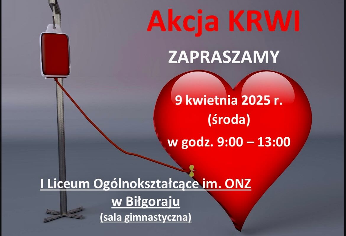 admin 1 rok temu OrganizacyjneNa terenie naszej szkoły odbędzie się akcja honorowego krwiodawstwa organizowana przez Szkolne Koło PCK we współpracy z Regionalnym Centrum Krwiodawstwa i Krwiolecznictwa w Lublinie. Zapraszamy pełnoletnich uczniów do udziału w akcji, 9 kwietnia2025 r. w godz. 9.00 -13.00 z dokumentem tożsamości.
