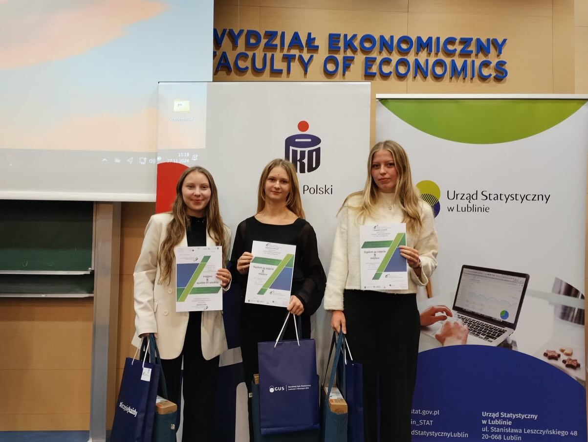 admin 1 rok temu Konkursy , Organizacyjne , OsiągnięciaZ radością informujemy, że zespół w składzie: Dominika Szubiak z klasy III i, Anna Szubiak z klasy IV C oraz Bogusława Buczek z klasy IV C zajął trzecie miejsce w XII edycji Lubelskiego Konkursu Statystyczno – Demograficznego Sigma Kwadrat. Finał odbył się 27 listopada 2024 r. na Wydziale Ekonomicznym Uniwersytetu Marii Curie-Skłodowskiej w Lublinie.W rywalizacji uczestniczyło dziesięć najlepszych drużyn z województwa lubelskiego, wyłonionych na podstawie etapu pierwszego, który polegał na przygotowaniu i przeprowadzeniu badania ankietowego oraz szczegółowej analizie uzyskanych wyników. Zadaniem uczestników finału było rozwiązanie testu, który wymagał szerokiej wiedzy z zakresu statystyki, demografii, ekonomii, matematyki, podstaw przedsiębiorczości, geografii oraz wiedzy o społeczeństwie. Za zajęcie trzeciego miejsca, nasze uczennice otrzymały nagrody rzeczowe, w tym laptopy.Celem konkursu jest poszerzanie wiedzy ekonomicznej młodzieży oraz rozwijanie umiejętności statystycznych, które są niezbędne w analizie współczesnych zjawisk gospodarczych i społecznych. Organizatorami konkursu są: Urząd Statystyczny w Lublinie, Polskie Towarzystwo Statystyczne, Uniwersytet Marii Curie-Skłodowskiej oraz Narodowy Bank Polski.