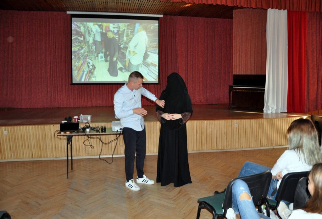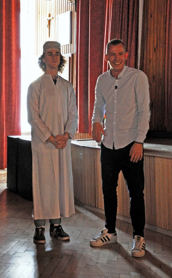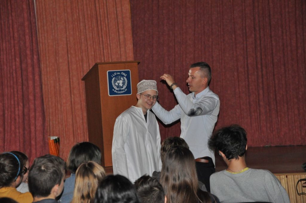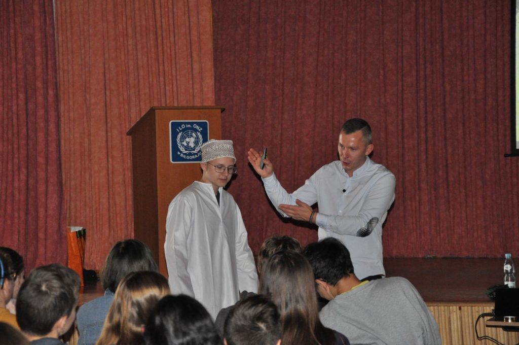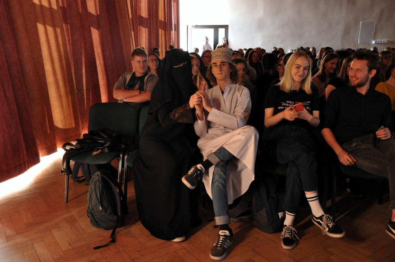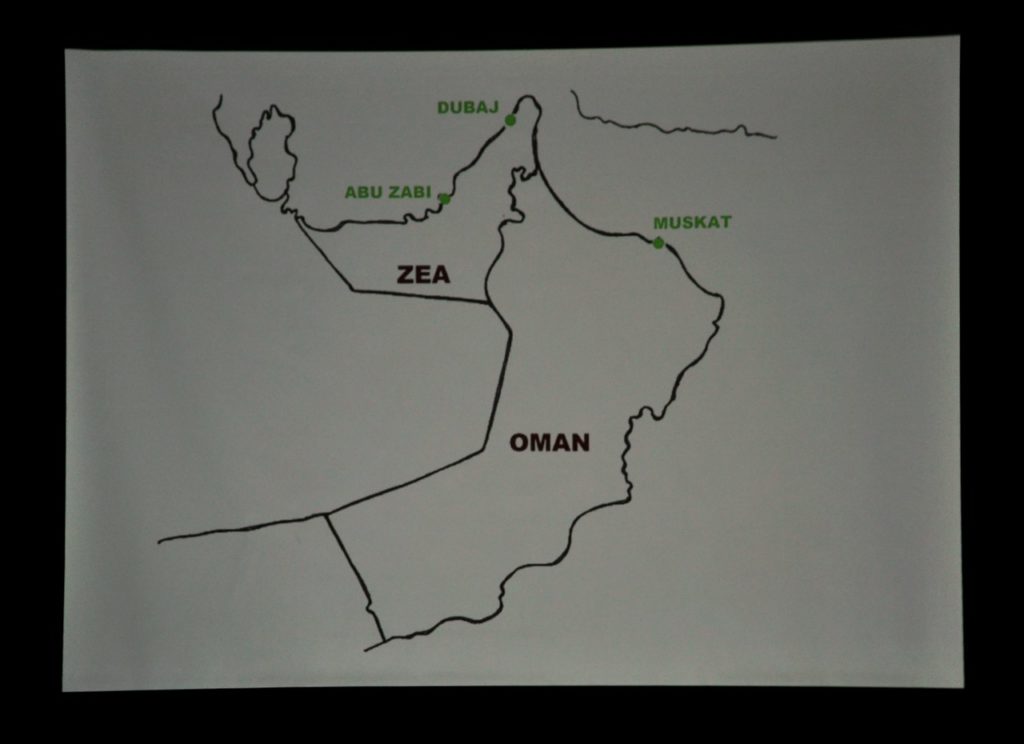 Oman to państwo słynące z kadzideł. Podziwialiśmy fotografie wykonane w górach Al-Hadżar, wśród których znajduje się Wielki Kanion, mający około kilometra głębokości. Na plażach słynnego Ras Al Jinz pan przewodnik spotkał mające ponad metr długości żółwie zielone. Z około 100 sztuk złożonych przez nich jaj dojrzałość płciową osiąga jedynie 1 żółw. Mogliśmy również zafascynować się najsławniejszą doliną w Omanie – Wadi Bani Khalid, z białą skałą kontrastującą z turkusową wodą. Wyglądało to niebywale. Pod koniec opowieści o Omanie nasi uczniowie mieli możliwość przymierzenia strojów pochodzących z tego kraju.